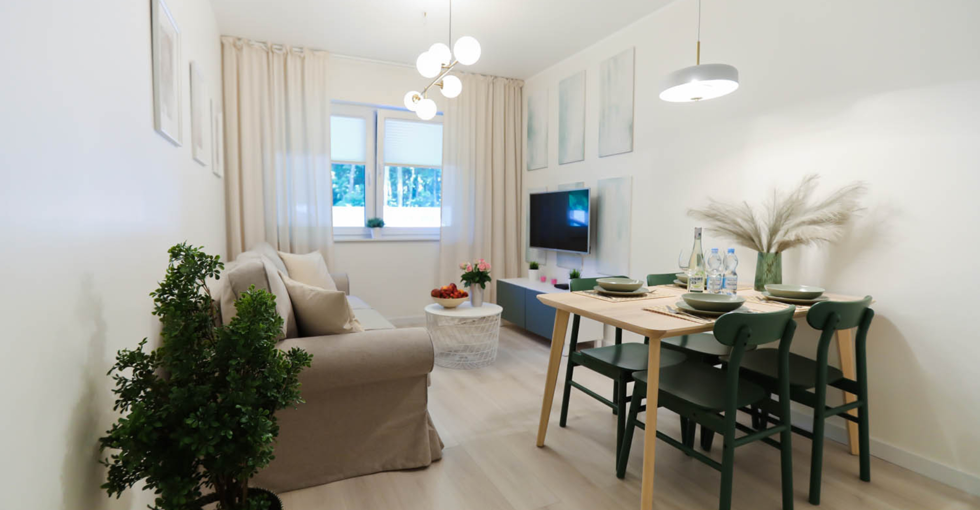 Salon – stół i cztery krzesła, rozkładana sofa 160×200, stolik kawowy, szafka pod telewizor, telewizor 42” LCD, telewizja kablowa