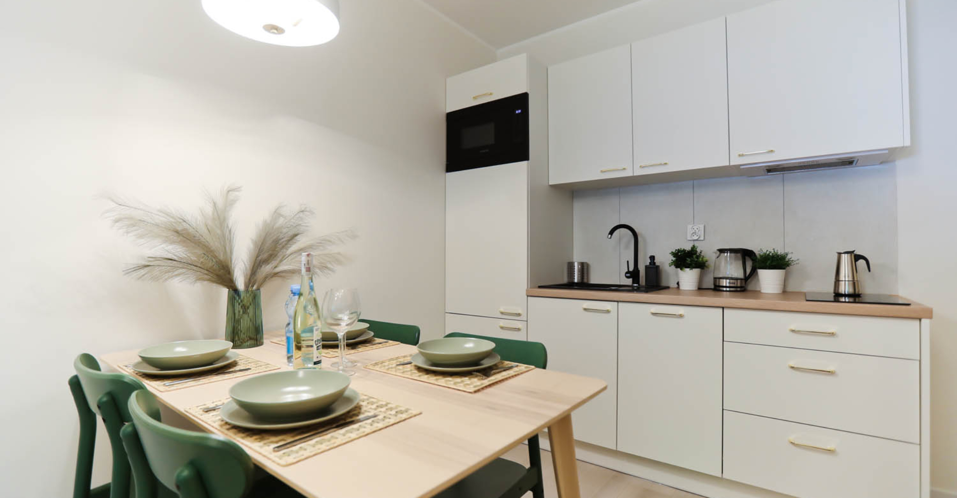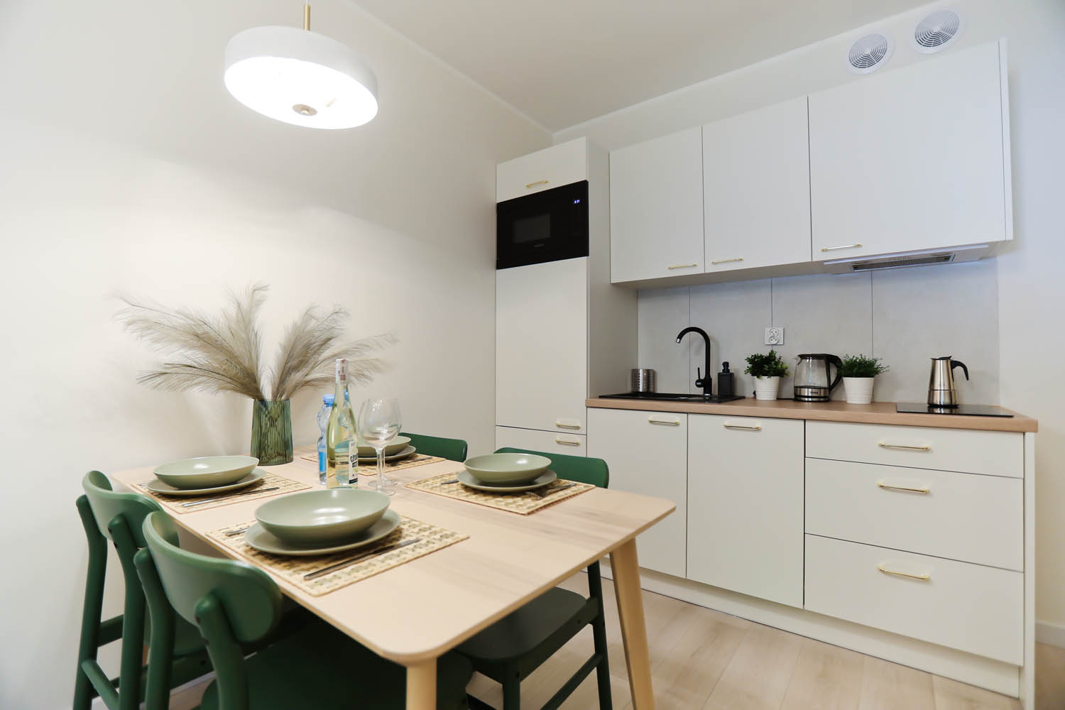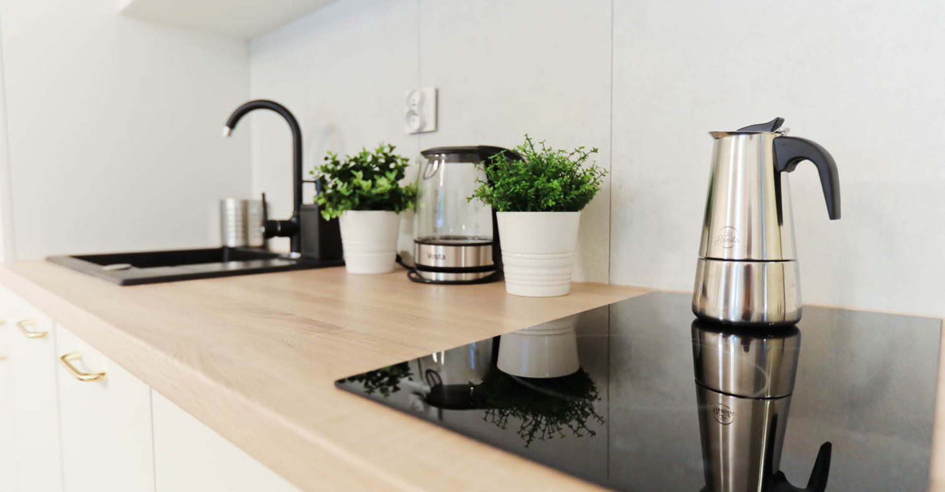 Kuchnia – płyta elektryczna, lodówka, zmywarka, mikrofala, toster, ekspres do kawy/kawiarka