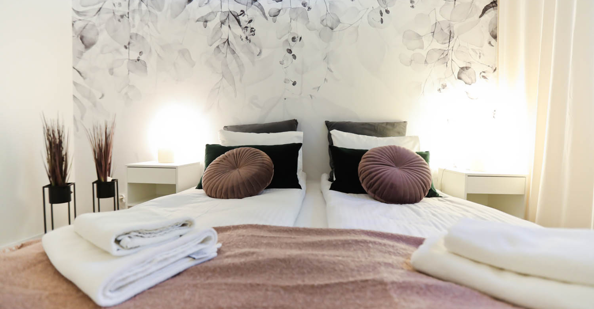 Sypialnia I – łóżko dwuosobowe o wymiarach 180 cm x 200 cm (możliwość rozstawienie łóżek na 2 mniejsze) , szafka nocna x 2, lampka nocna x 2, komoda