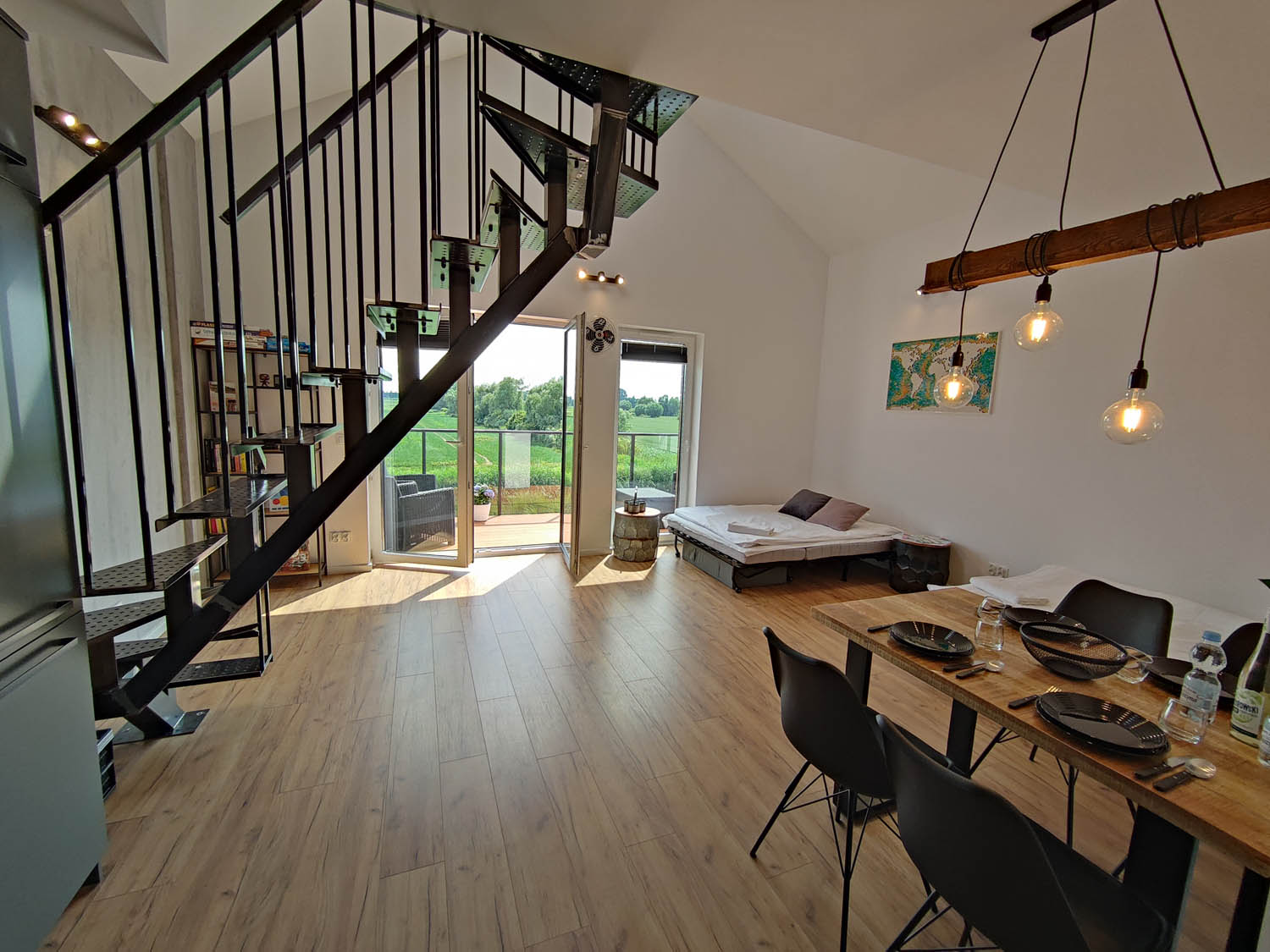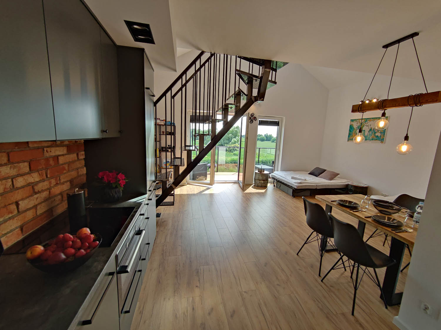 Sypialnia, salon z aneksem kuchennym, łazienka, balkon z pięknym widokiem na pola