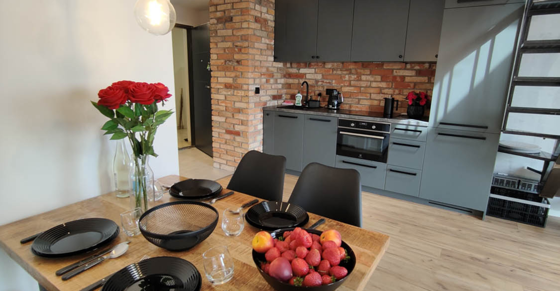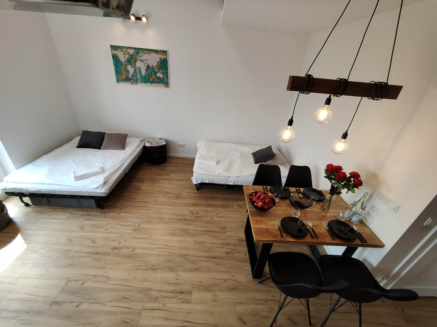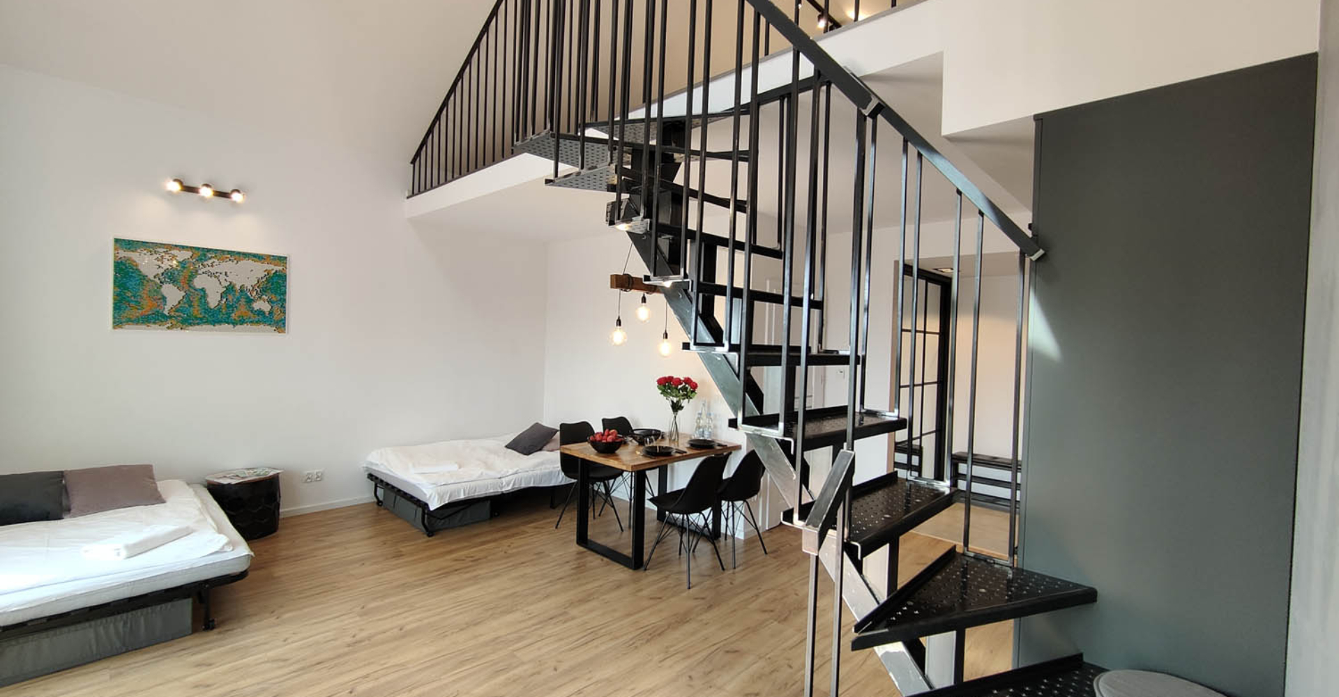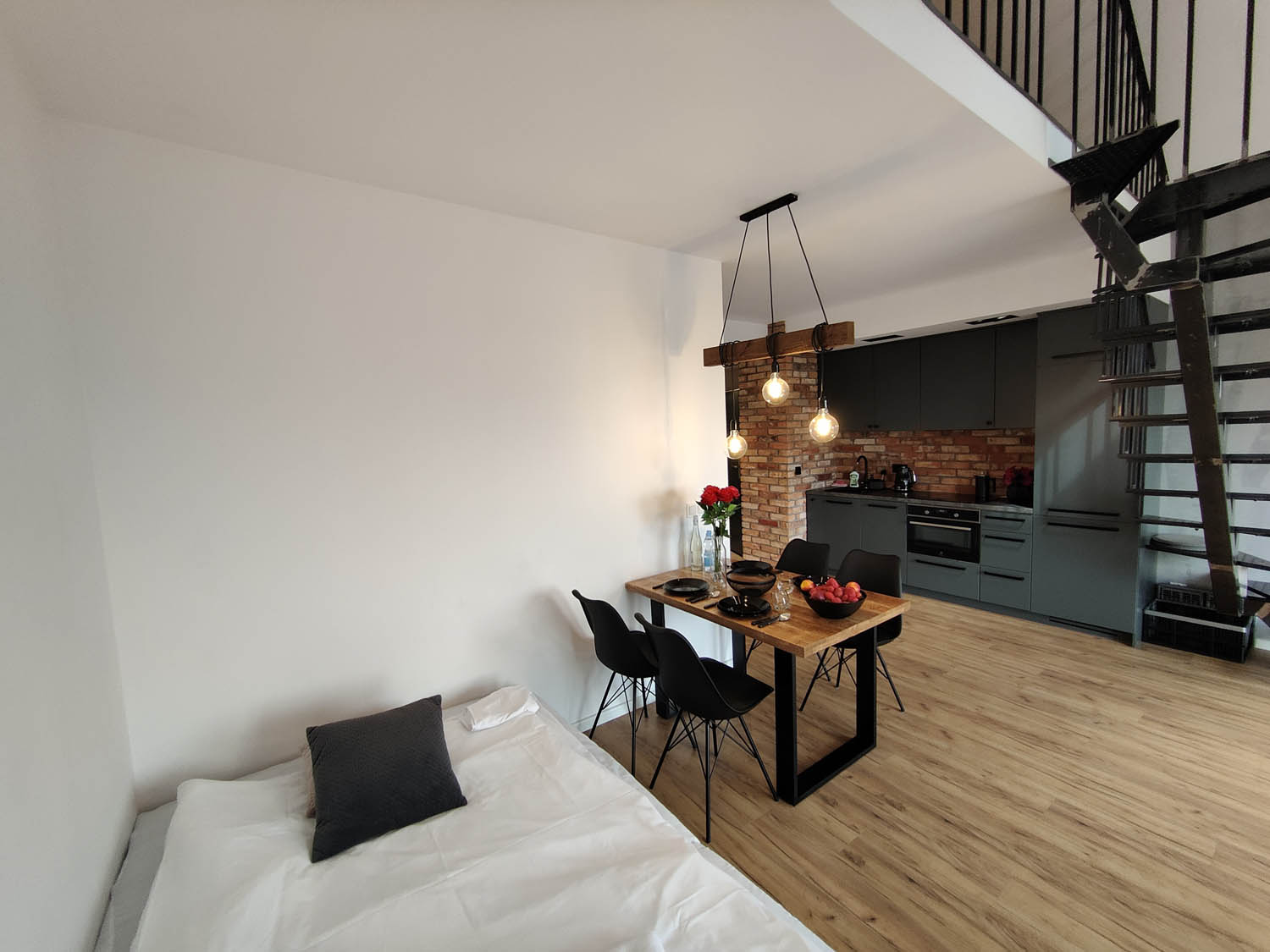 Sypialnia z antresolą, salon z aneksem kuchennym, łazienka, balkon