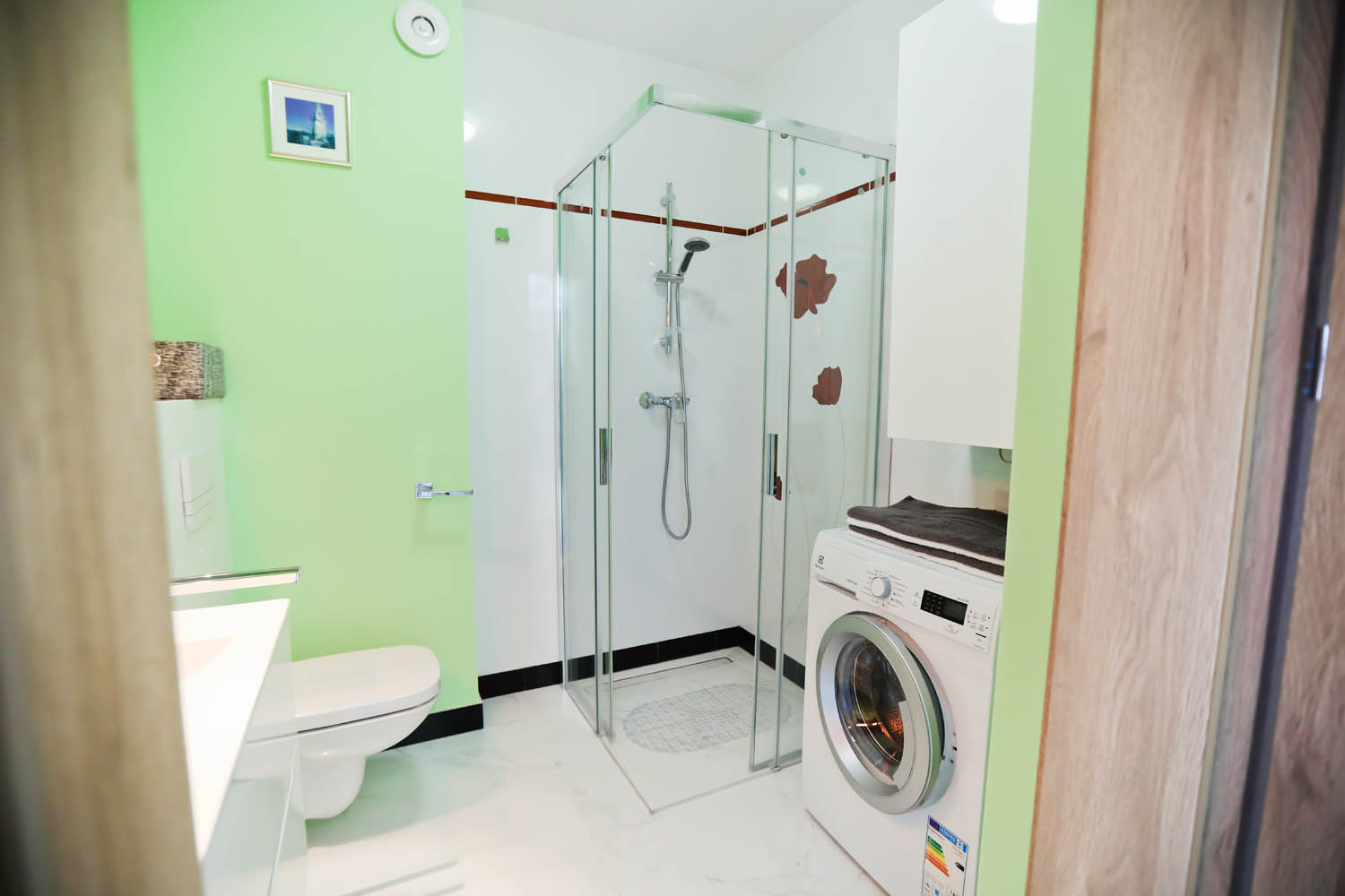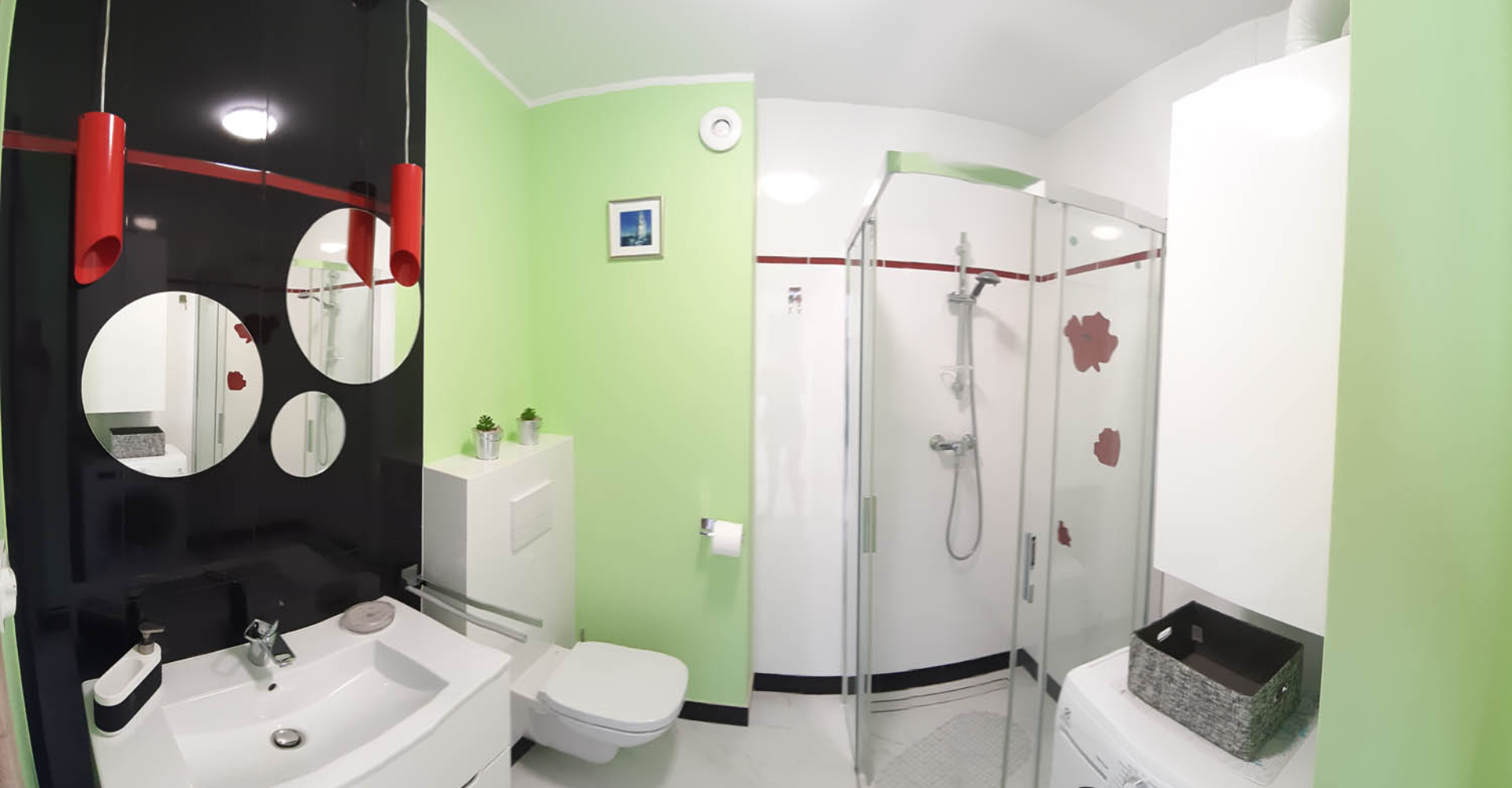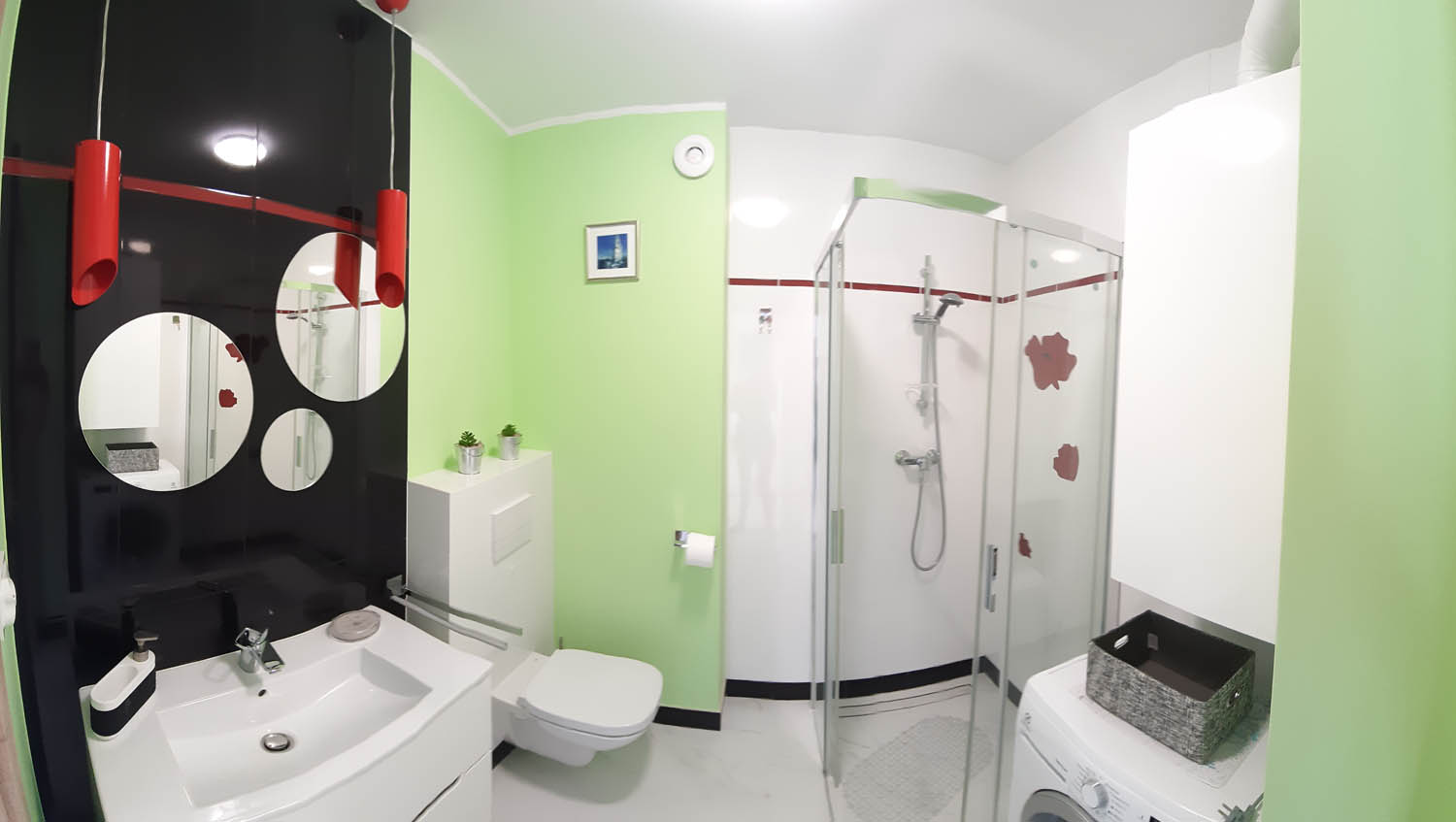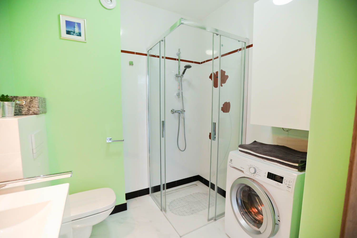Łazienka – kabina prysznicowa, umywalka, wc, pralka