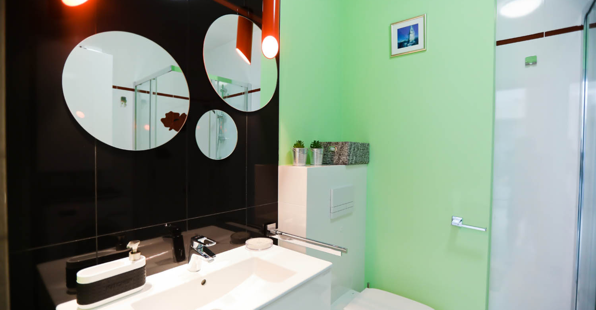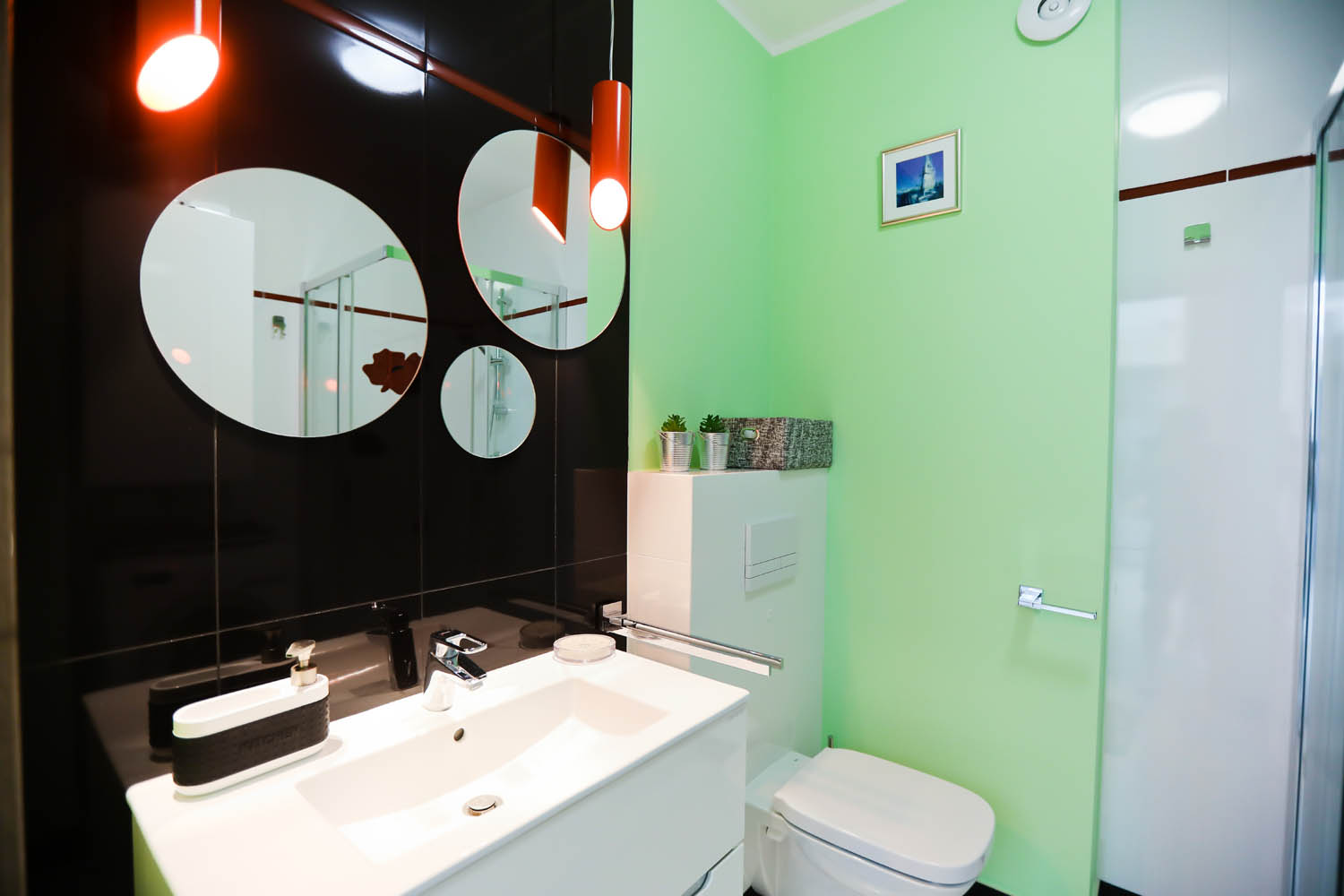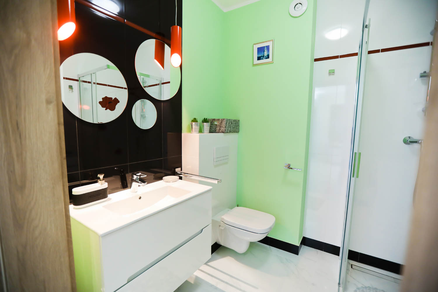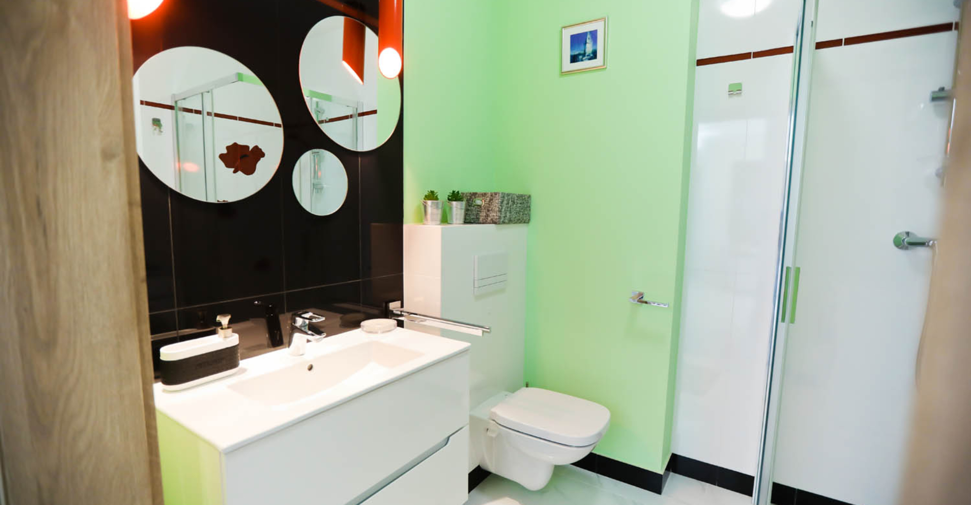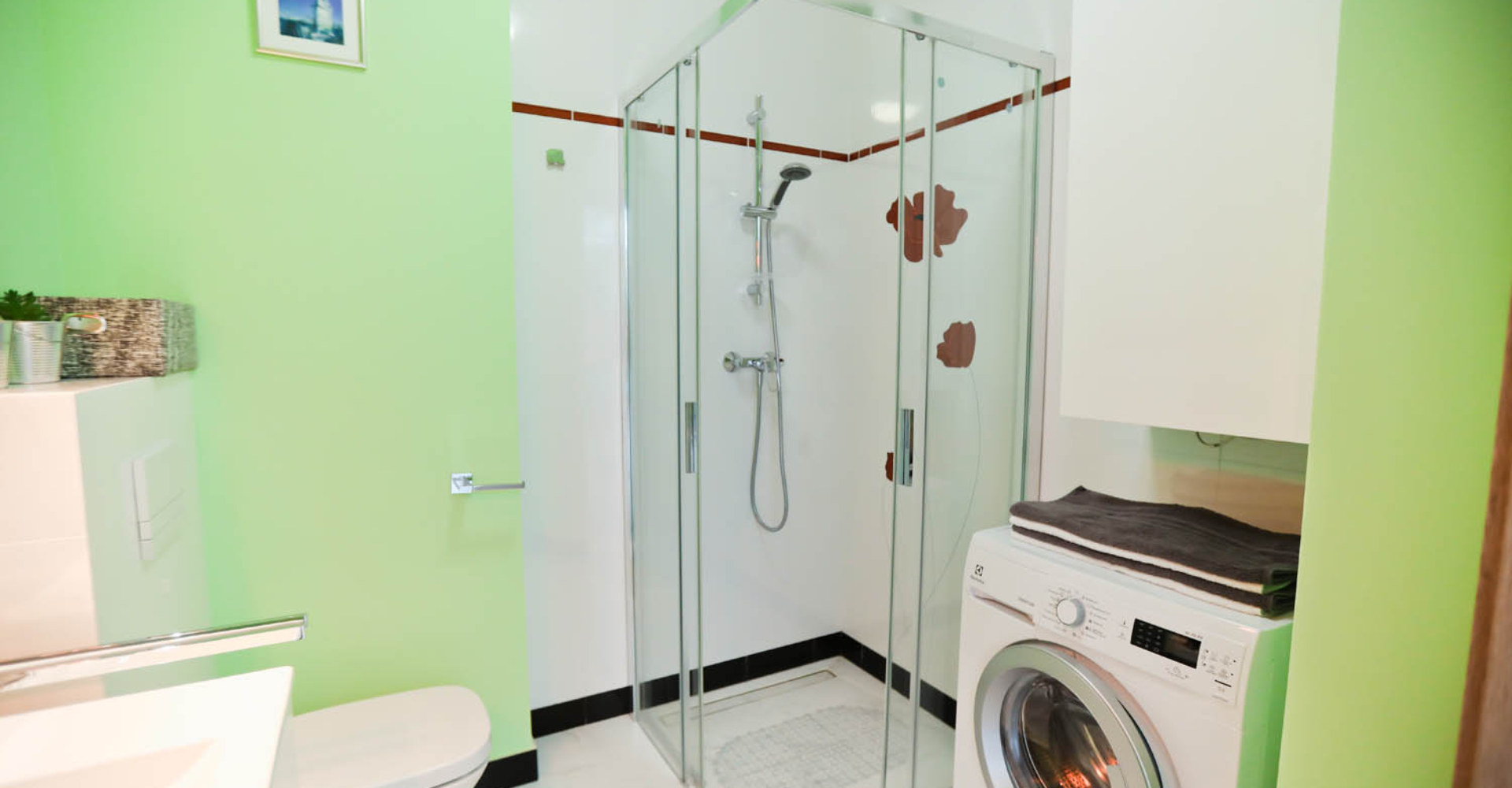 Łazienka – kabina prysznicowa, umywalka, wc, pralka