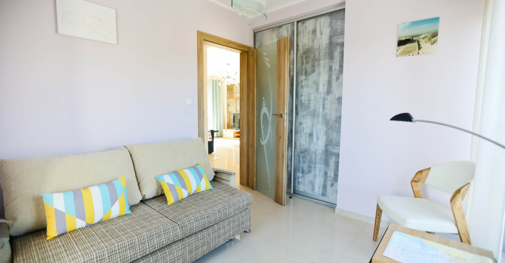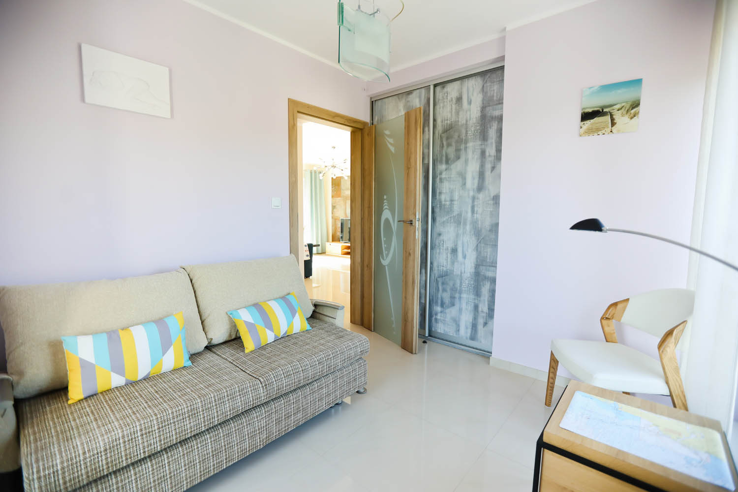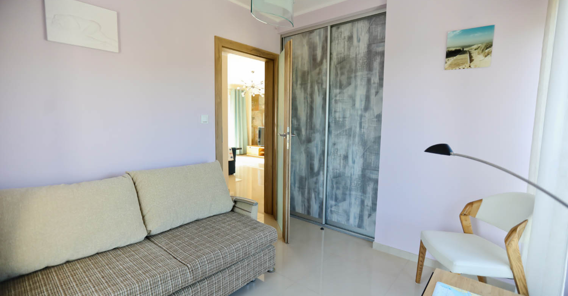 Sypialnia II – sofa rozkładana, stolik kawowy, duża szafa, szafa zabudowana przyścienna