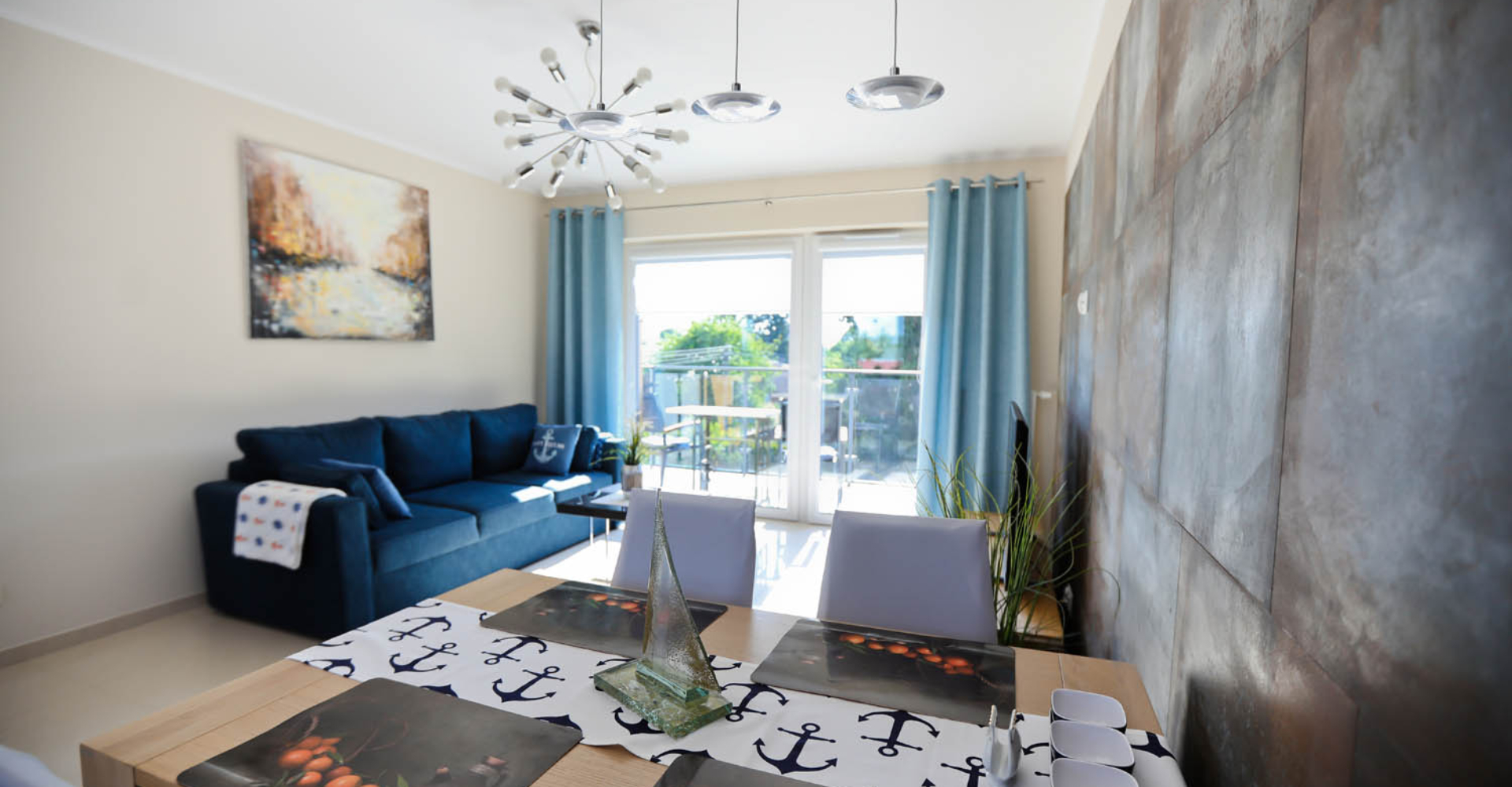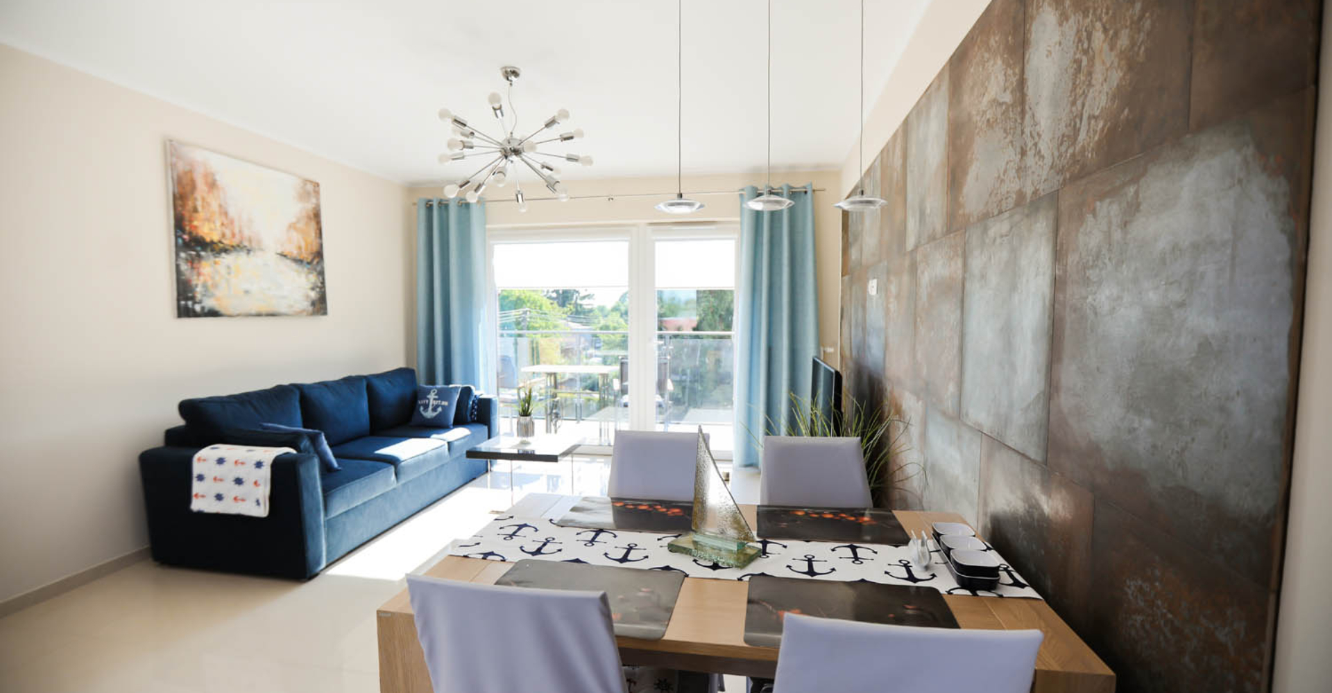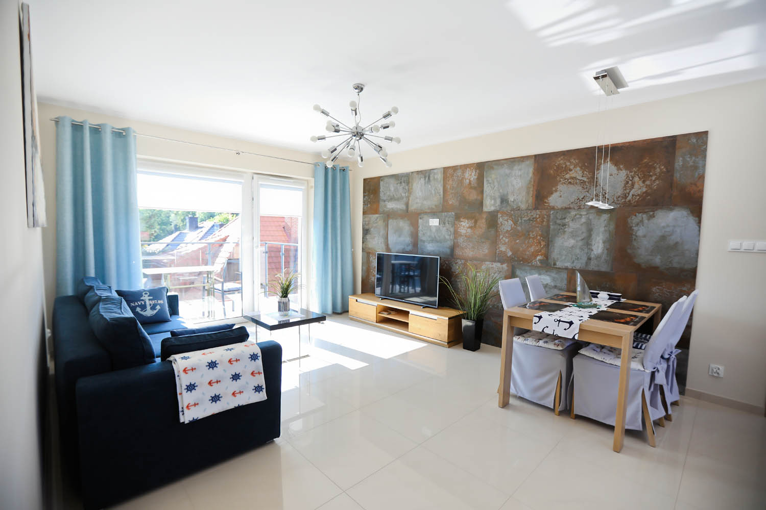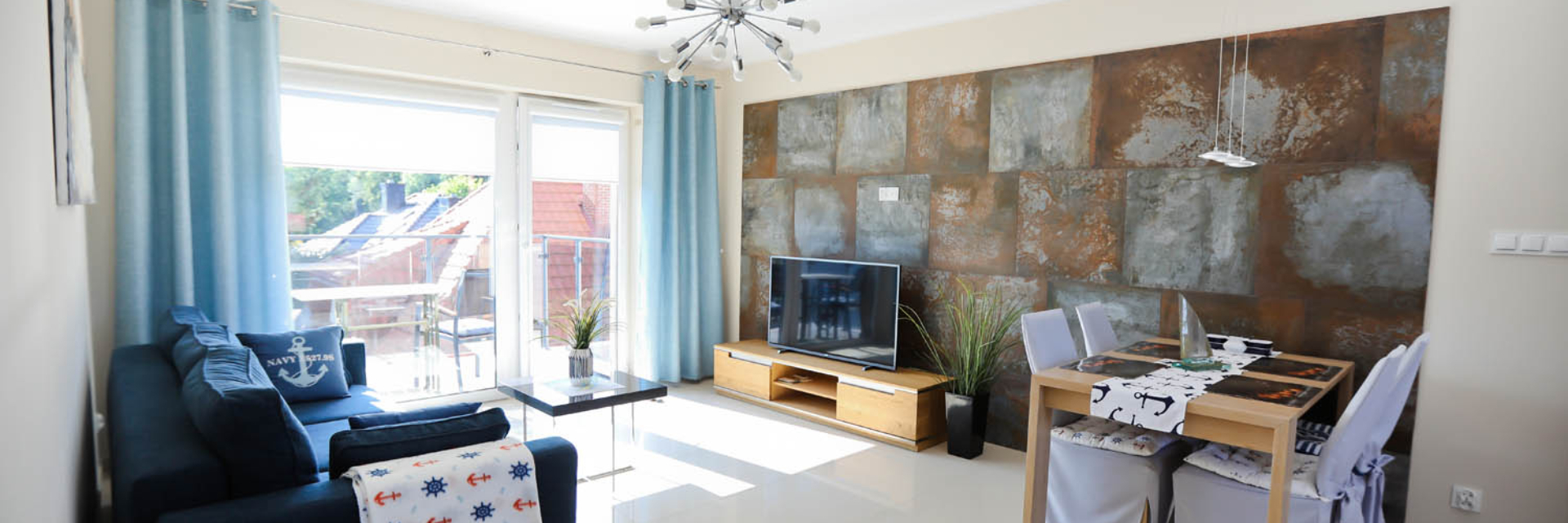 Salon – stół i cztery krzesła, rozkładana sofa 160×200, stolik kawowy, szafka pod telewizor, telewizor 42’’ LCD, telewizja kablowa