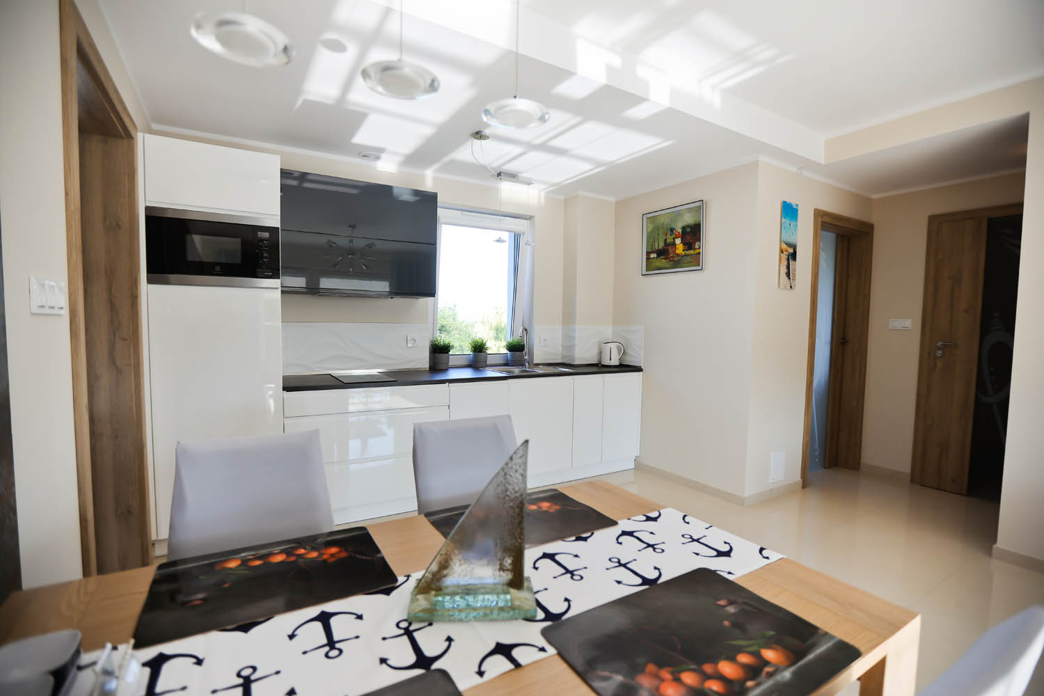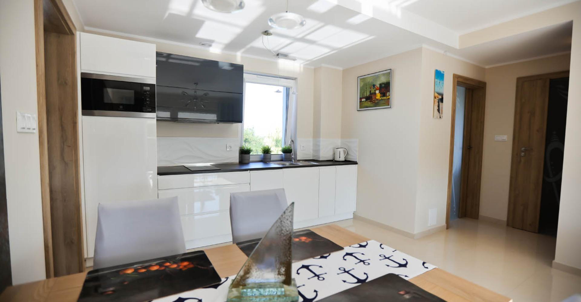 Kuchnia – płyta gazowa, lodówka, zmywarka, toster, ekspres do kawy, router bezprzewodowy, modem