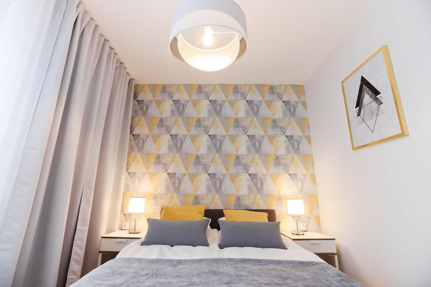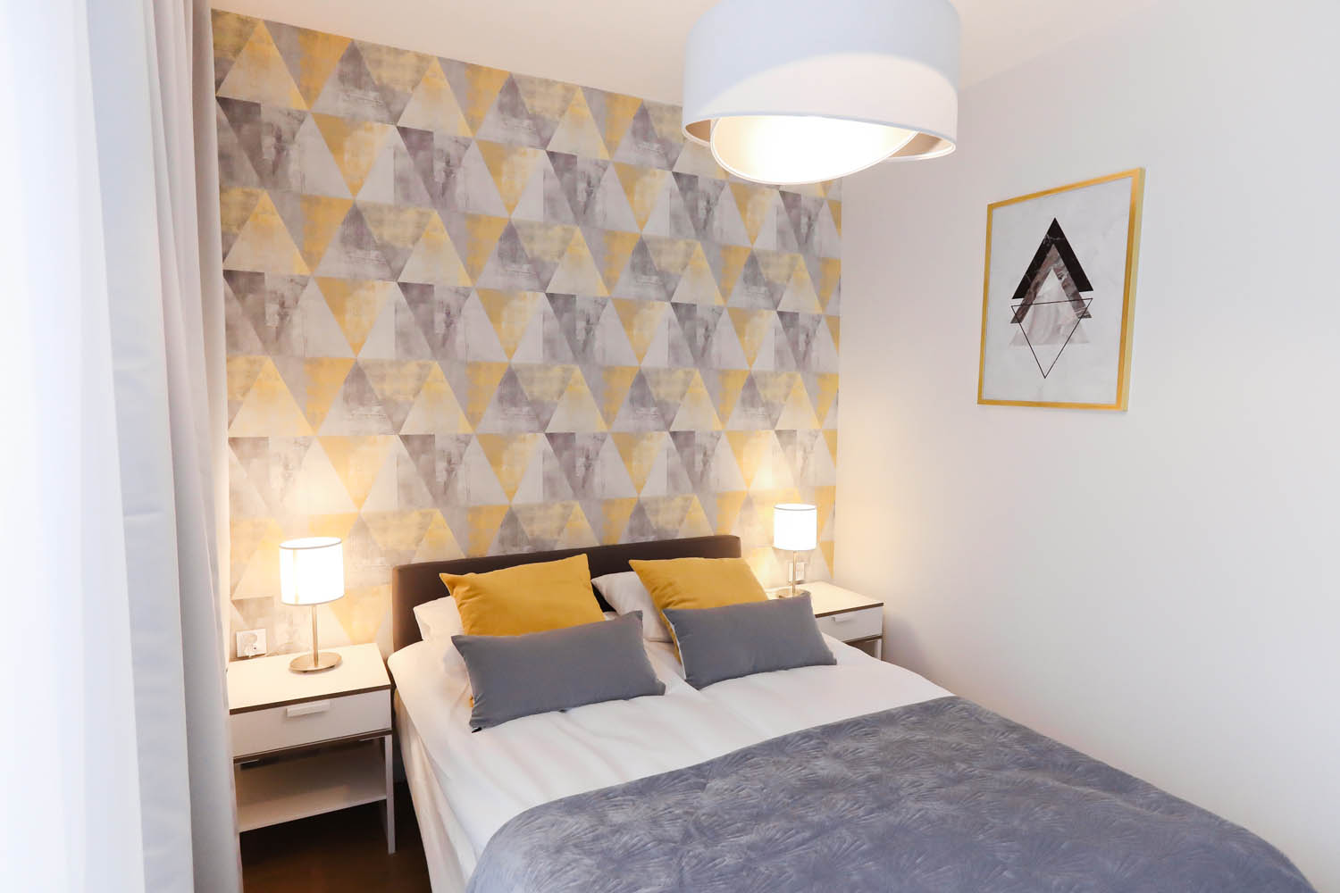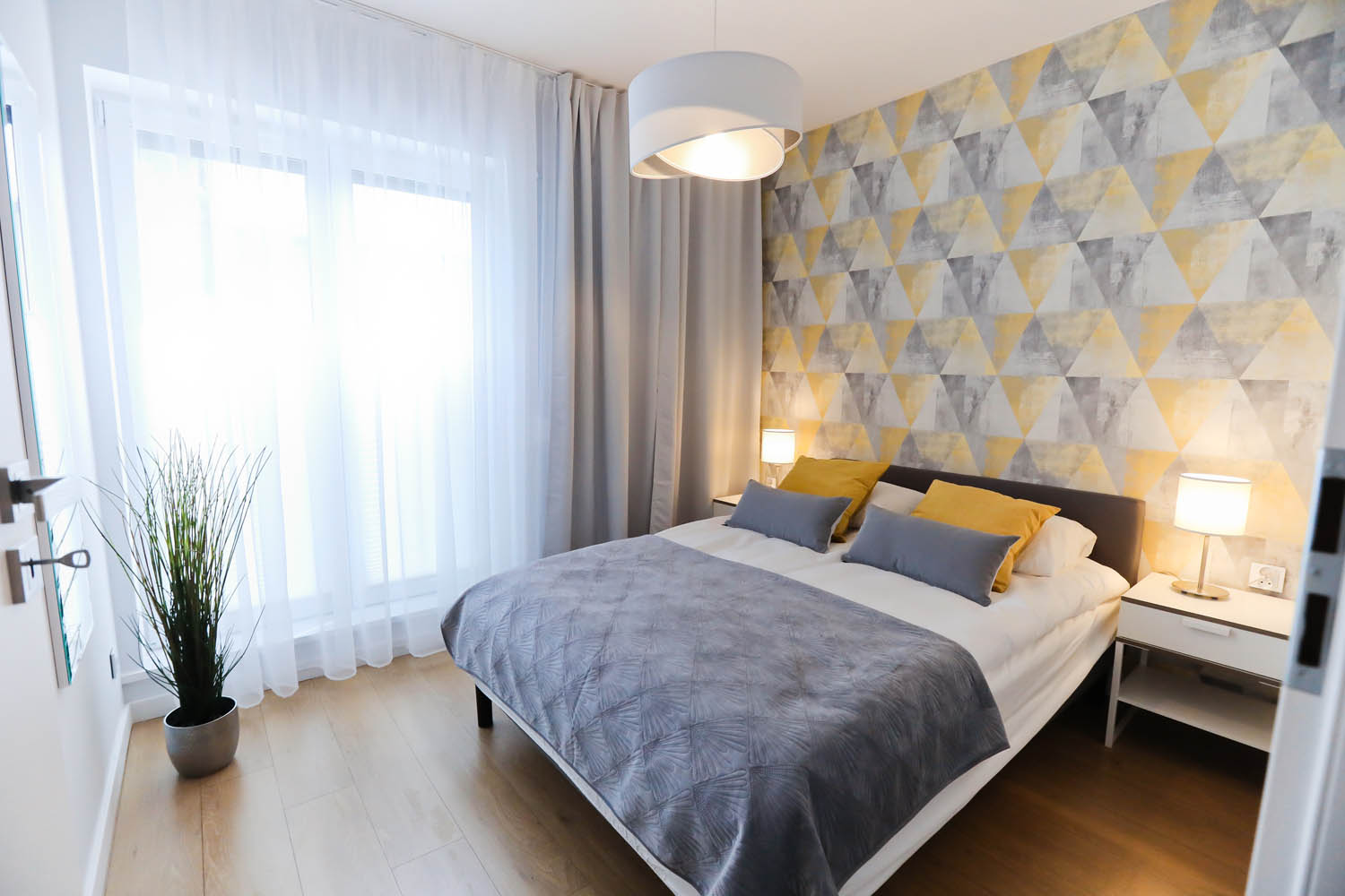 Sypialnia I – łóżko dwuosobowe 140×200, 2x szafka nocna, 2x lampka nocna, duża szafa