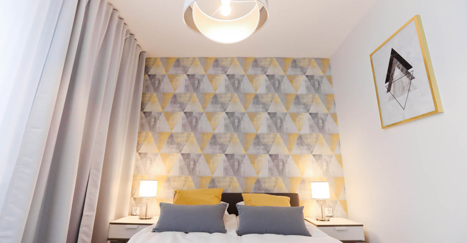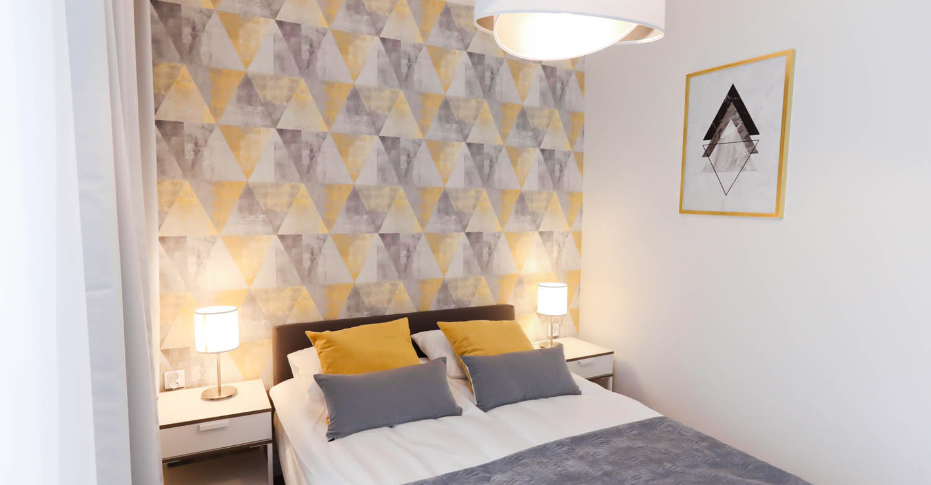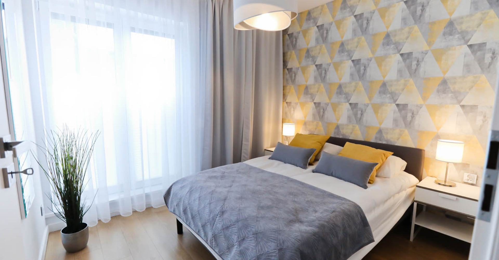 Sypialnia I – łóżko dwuosobowe 140×200, 2x szafka nocna, 2x lampka nocna, duża szafa