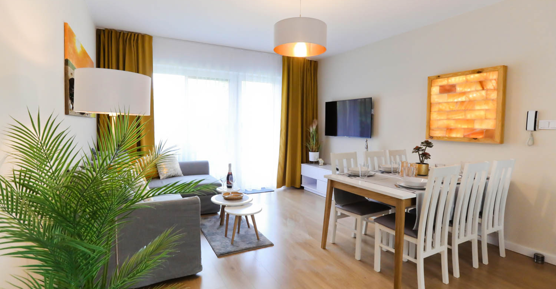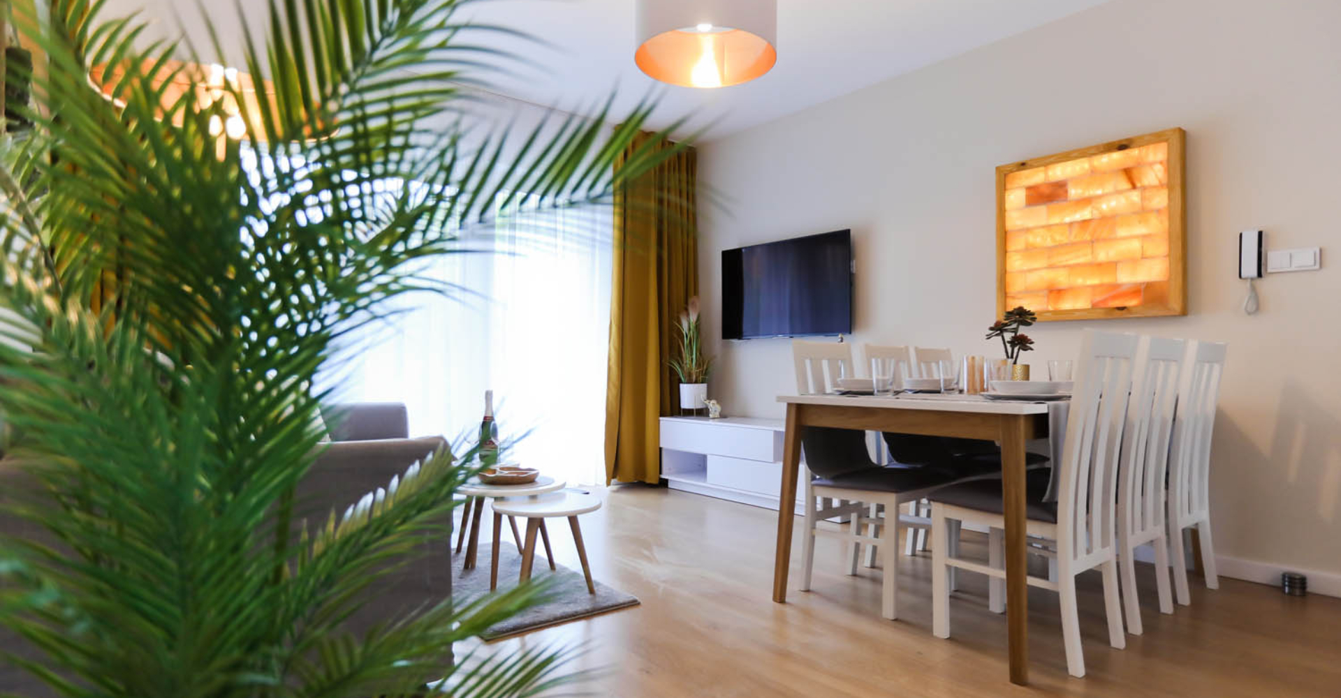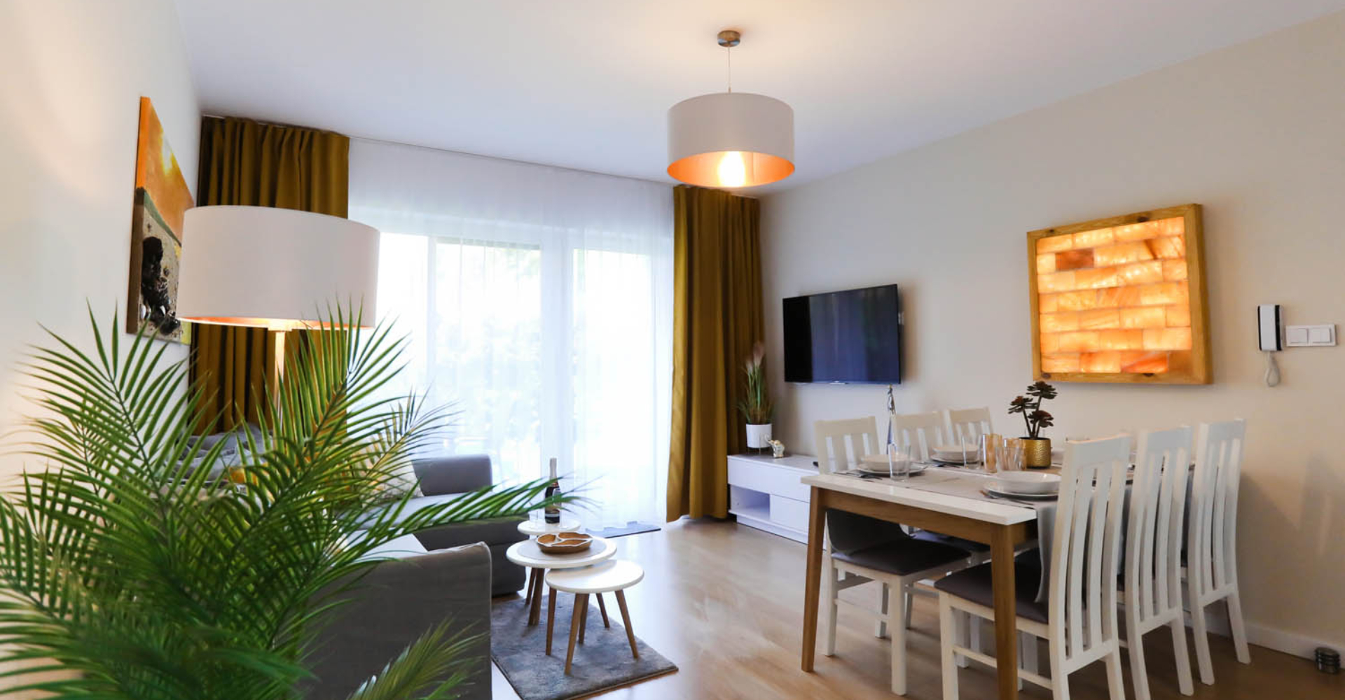 Wypoczną Państwo w miejscu, którego aranżacja stanowi harmonijną całość – każdy element wykończenia został dobrany bardzo starannie, a wprowadzone elementy natury wzmacniają zdrowotny charakter tego miejsca. Wyróżnia go niepowtarzalny klimat i pozytywna energia zawarta w kryształach soli kamiennej oraz w naturalnych kamieniach bursztynu. Te cuda znajdą Państwo w panelu solnym oraz w autorskim pejzażu widoku Sobieszewa stworzonym specjalnie do naszego Apartamentu.