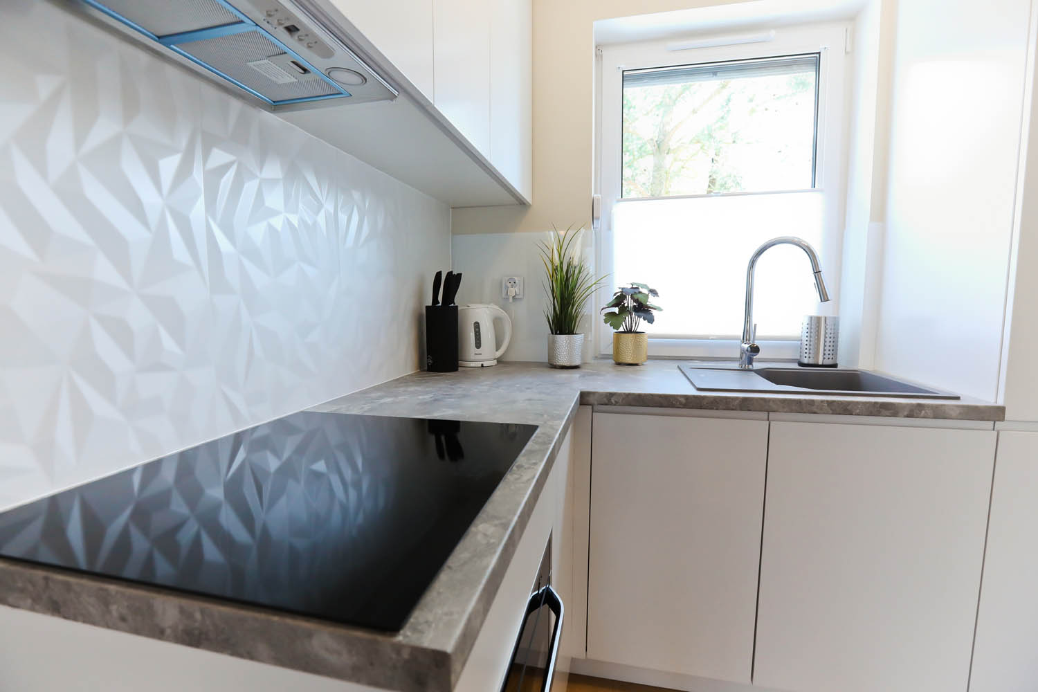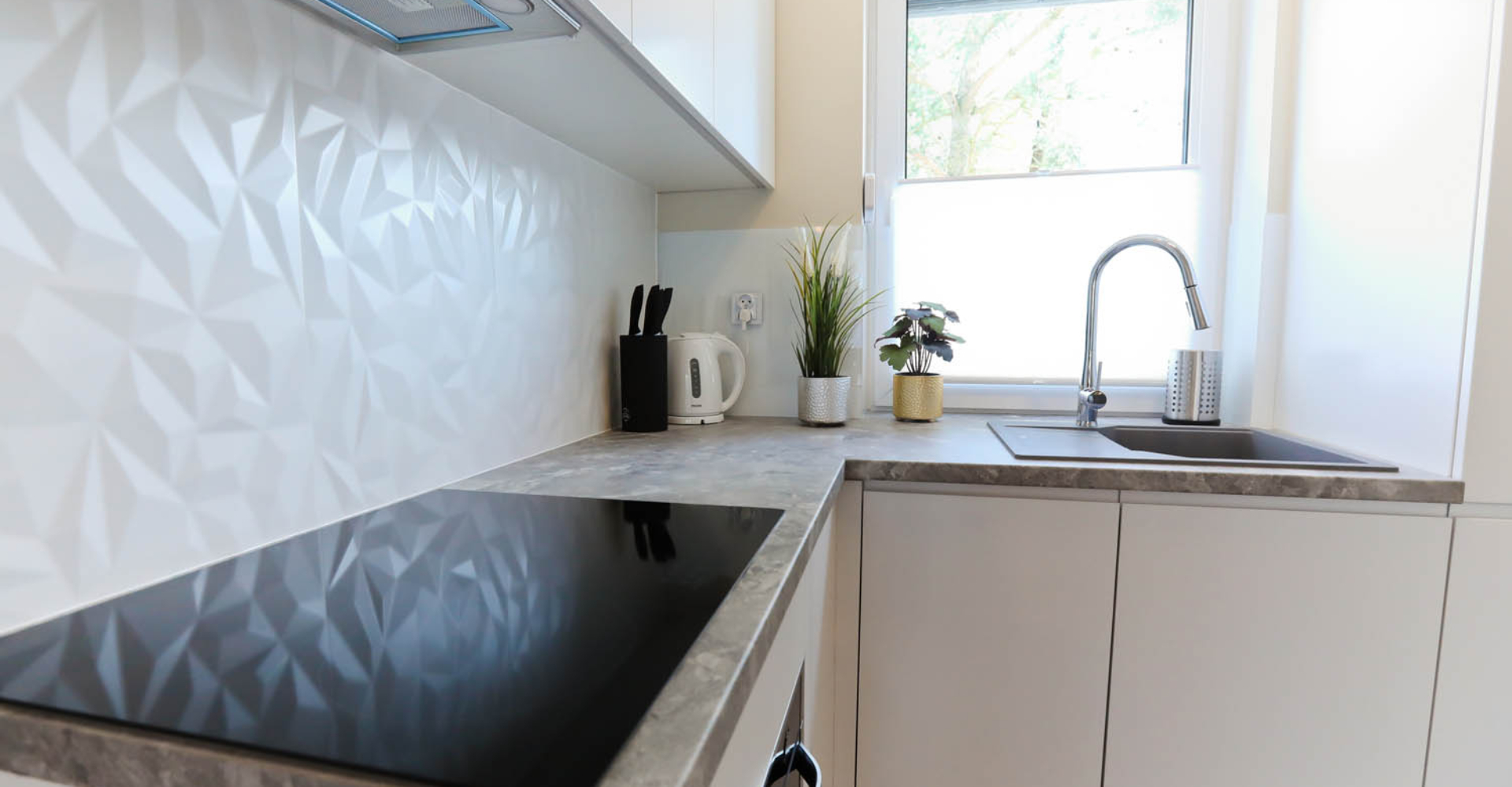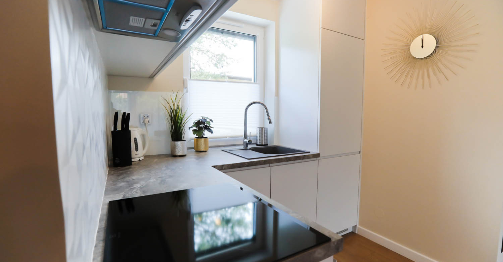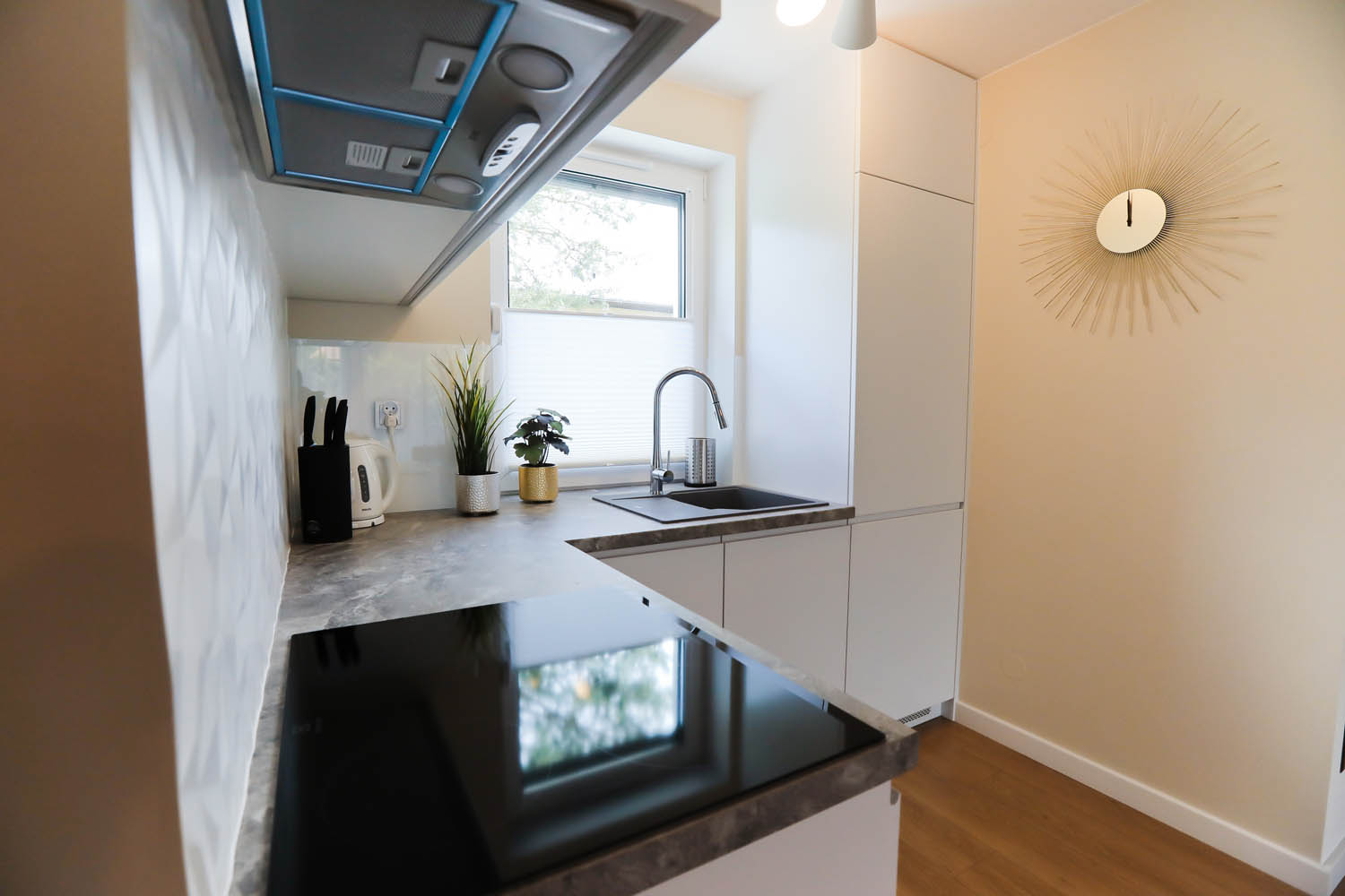 Kuchnia – płyta indukcyjna, lodówka, zmywarka, toster, kawiarka, garnki, patelnie, naczynia, szklanki, kubki oraz wszystkie potrzebne rzeczy do wykonania każdej potrawy