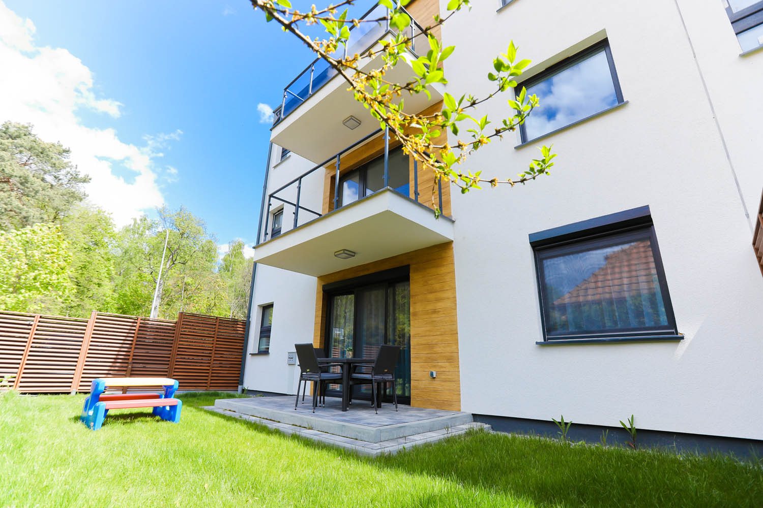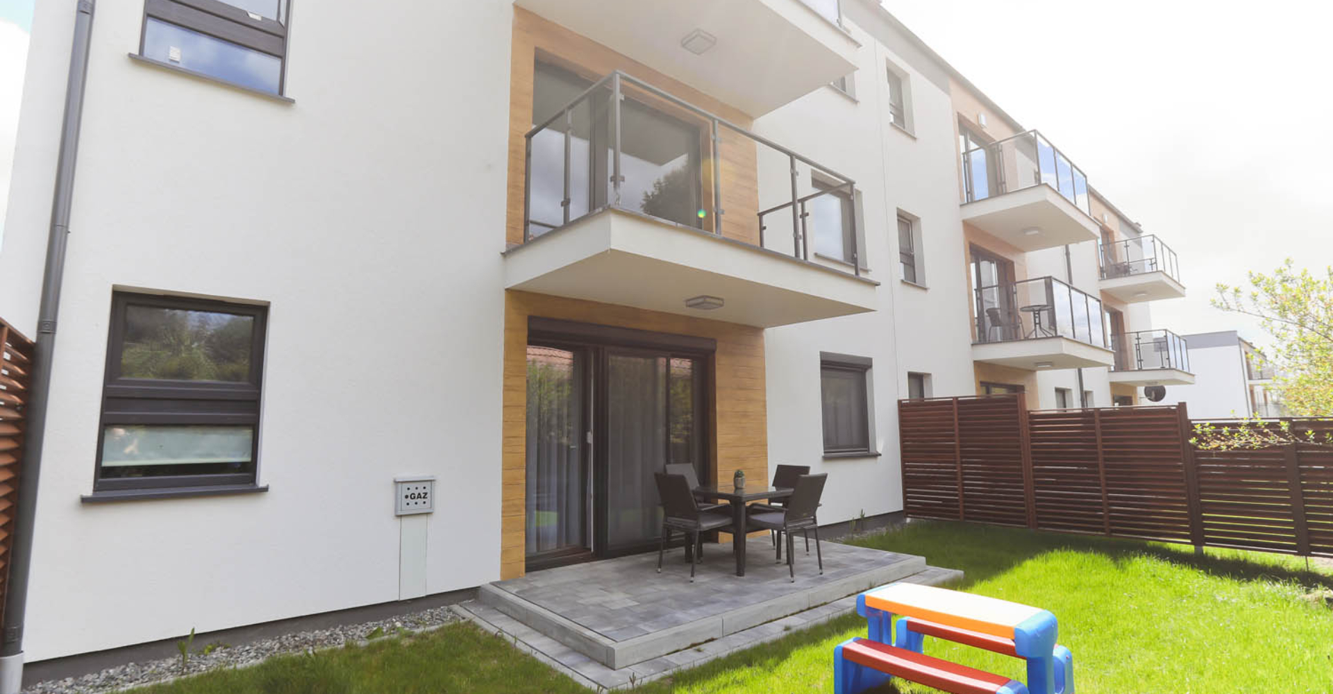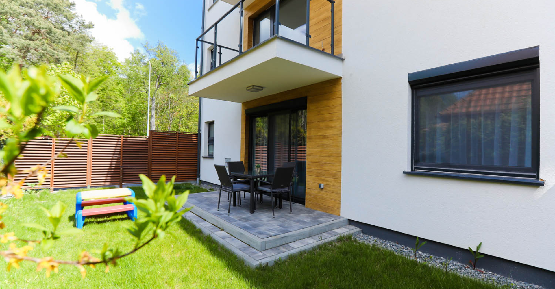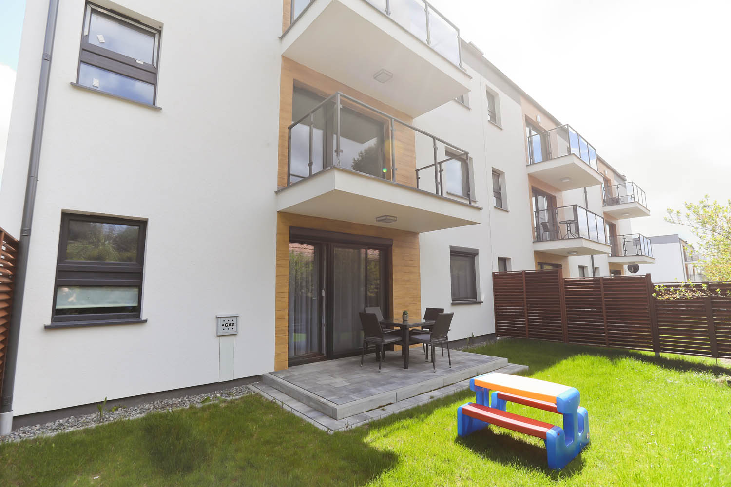 Mały ogródek, który przynależy do Apartamentu, wyposażony jest w zestaw wypoczynkowy, grill, elektryczny oraz mały stolik dziecięcy, pozwoli na spędzenie czasu na świeżym powietrzu, bez wychodzenia z domu 🙂