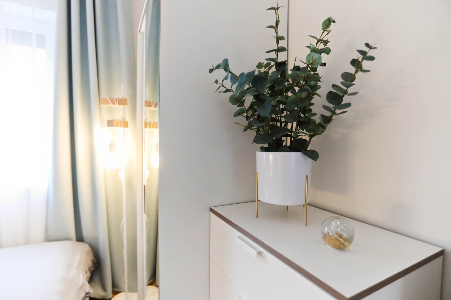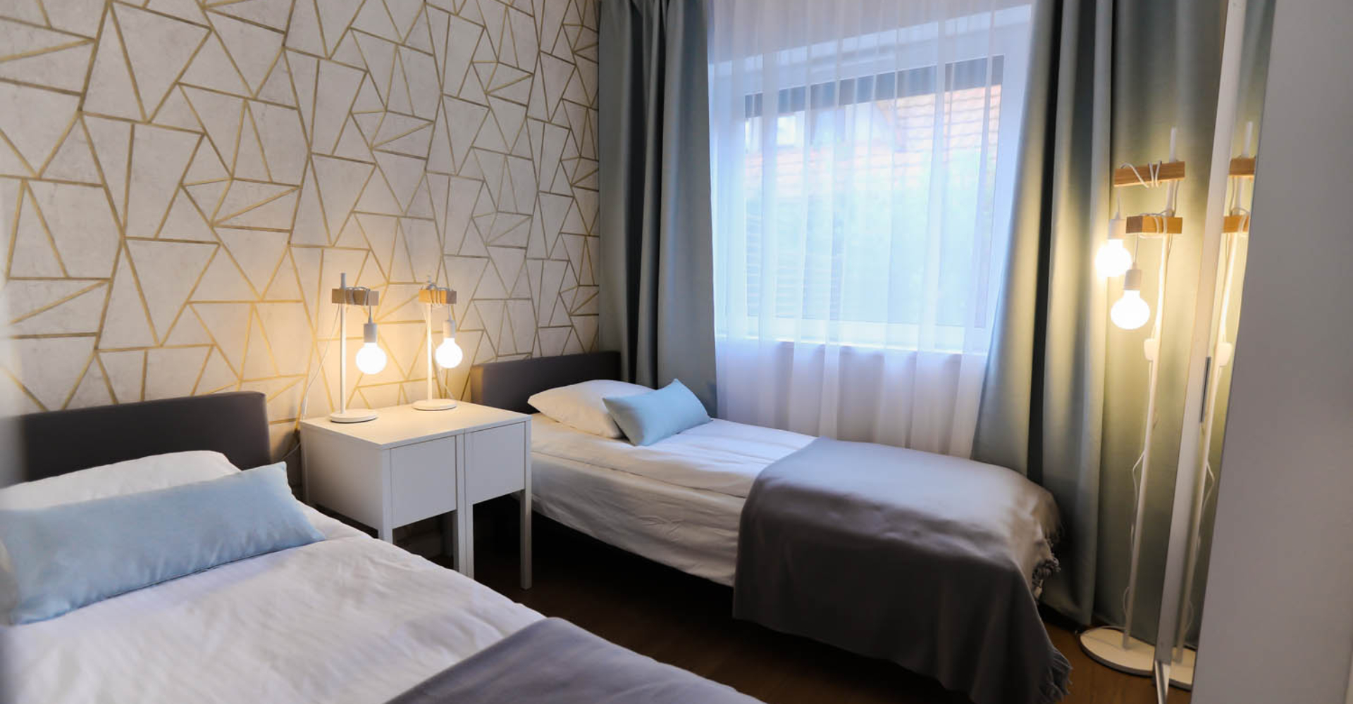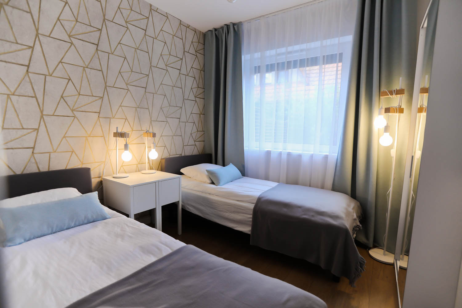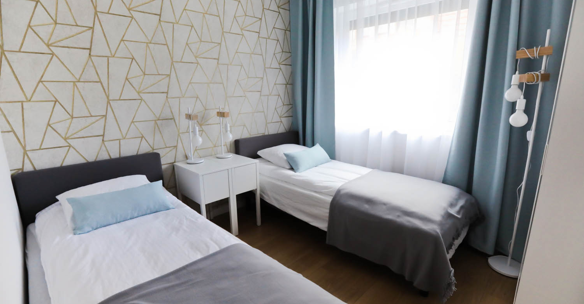 Sypialnia II – 2x łóżko jednoosobowe 90×200, 2x szafka nocna, 2x lampka nocna, szafa, komoda