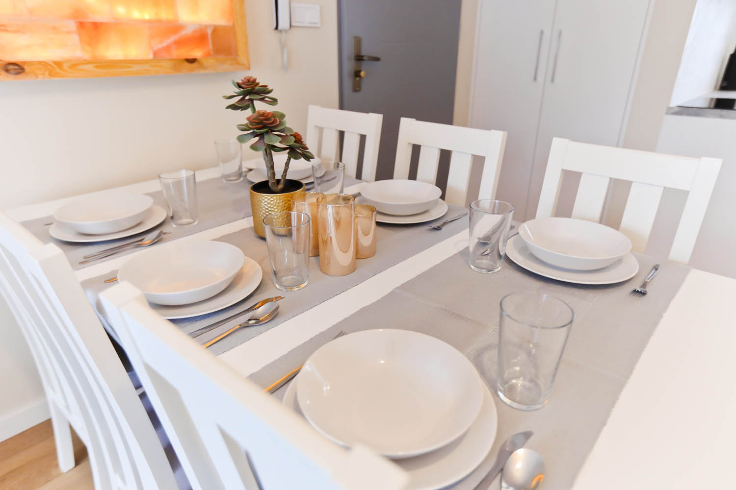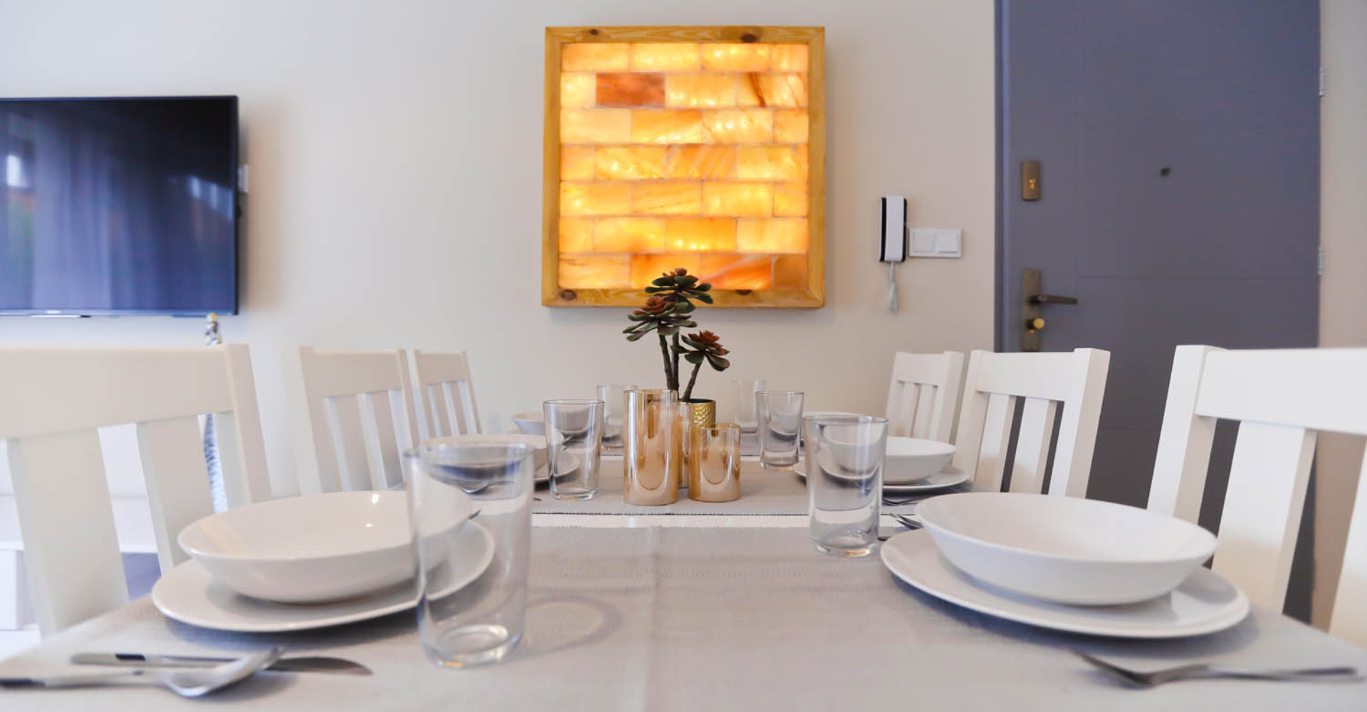 Salon – stół i sześć krzeseł, rozkładana sofa 160×200, stolik kawowy, szafka pod telewizor, telewizor 50’’ LCD, szafa zabudowana, telewizja kablowa oraz bezprzewodowy Internet