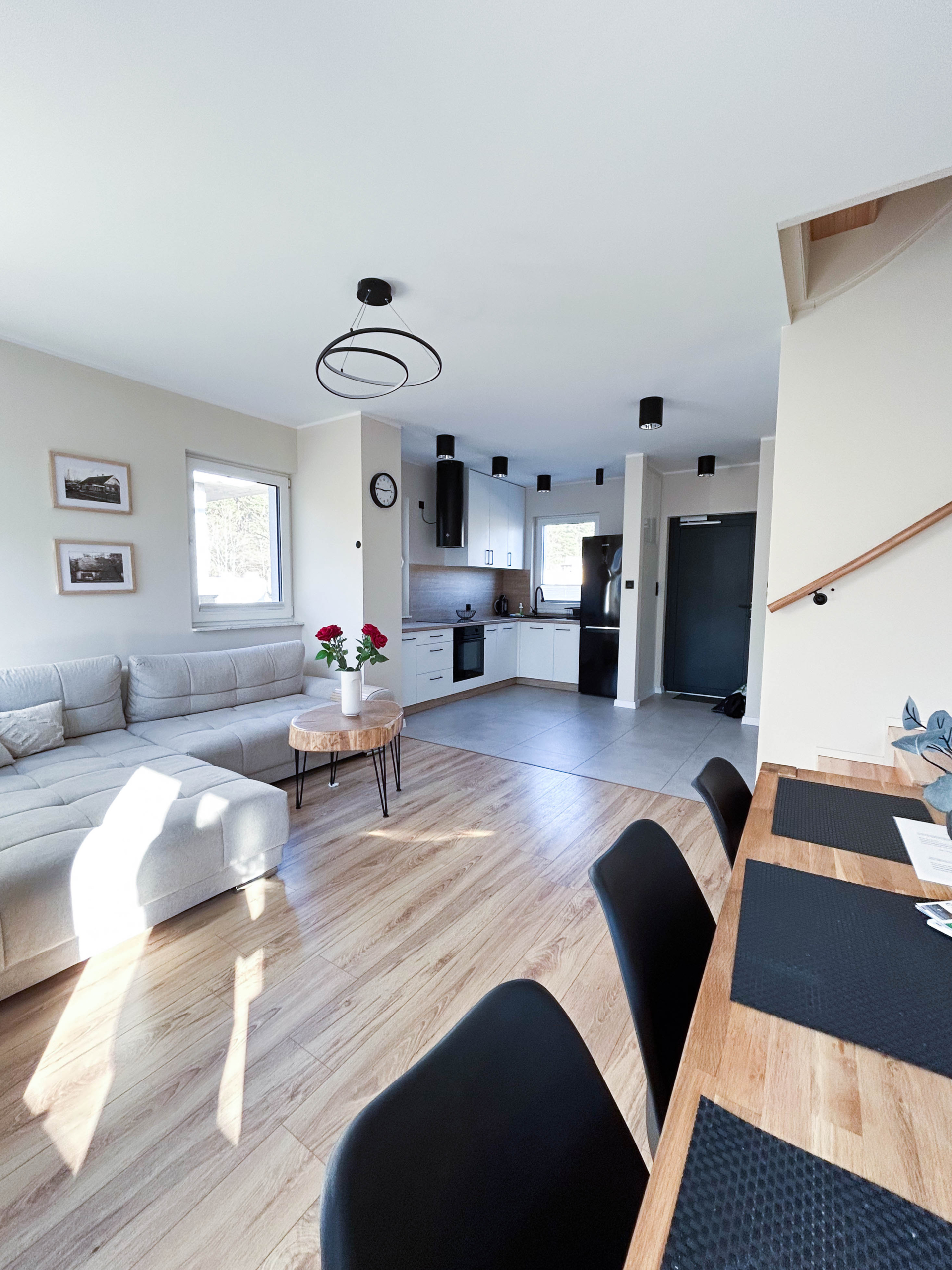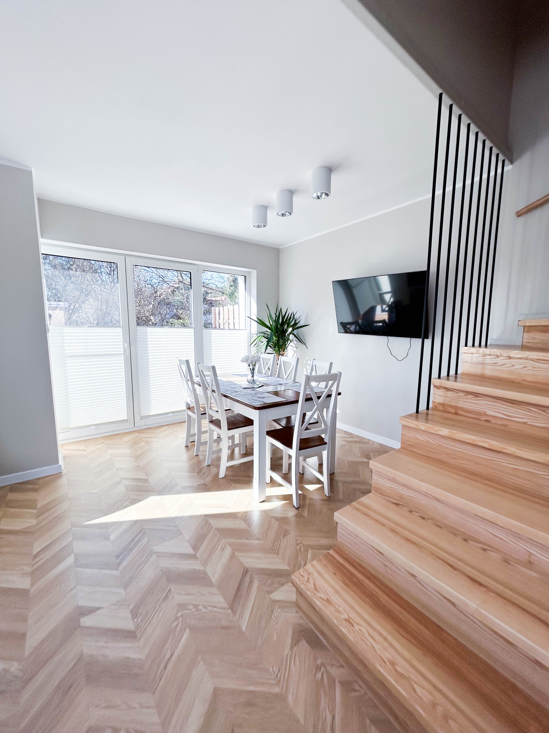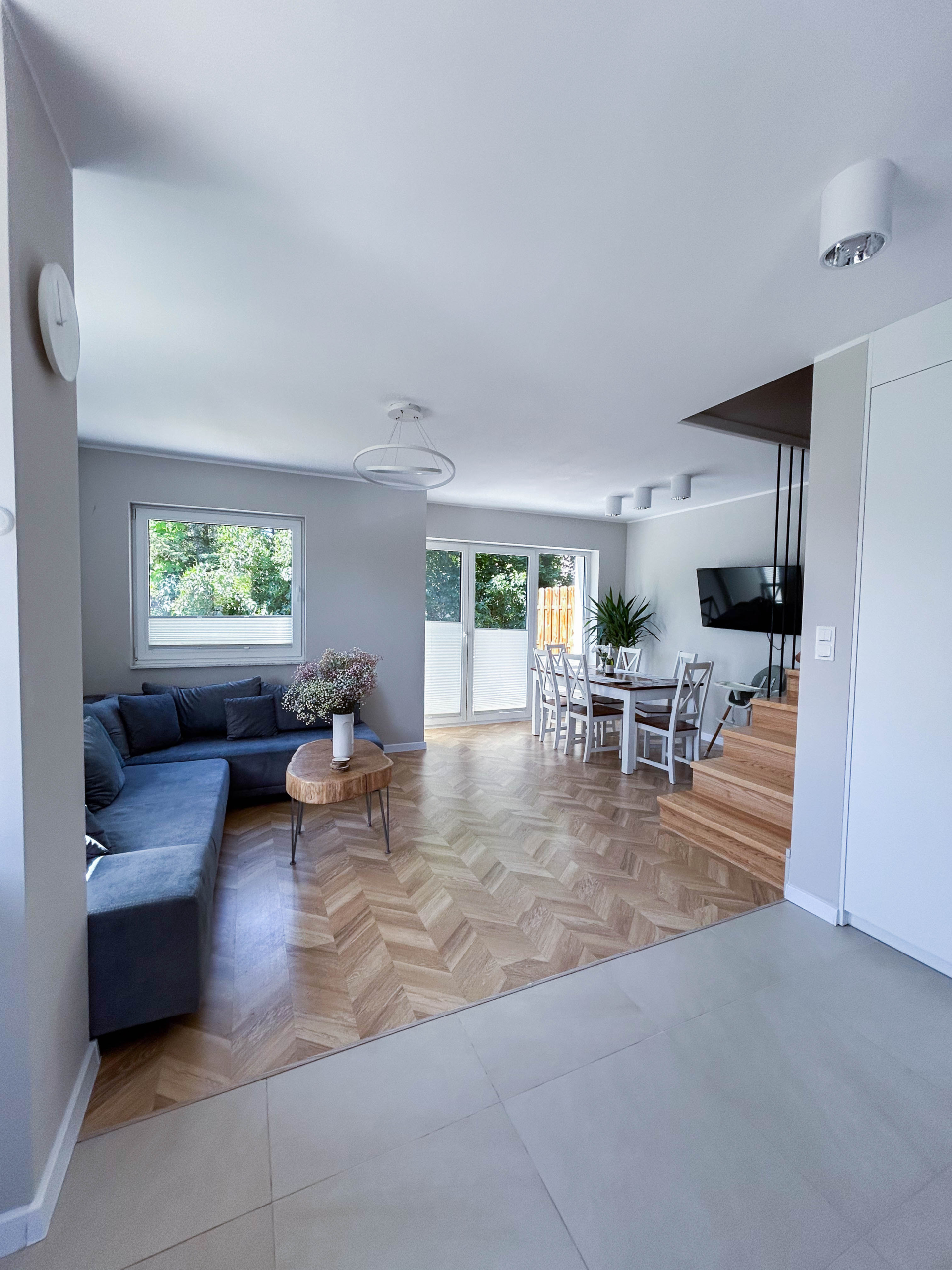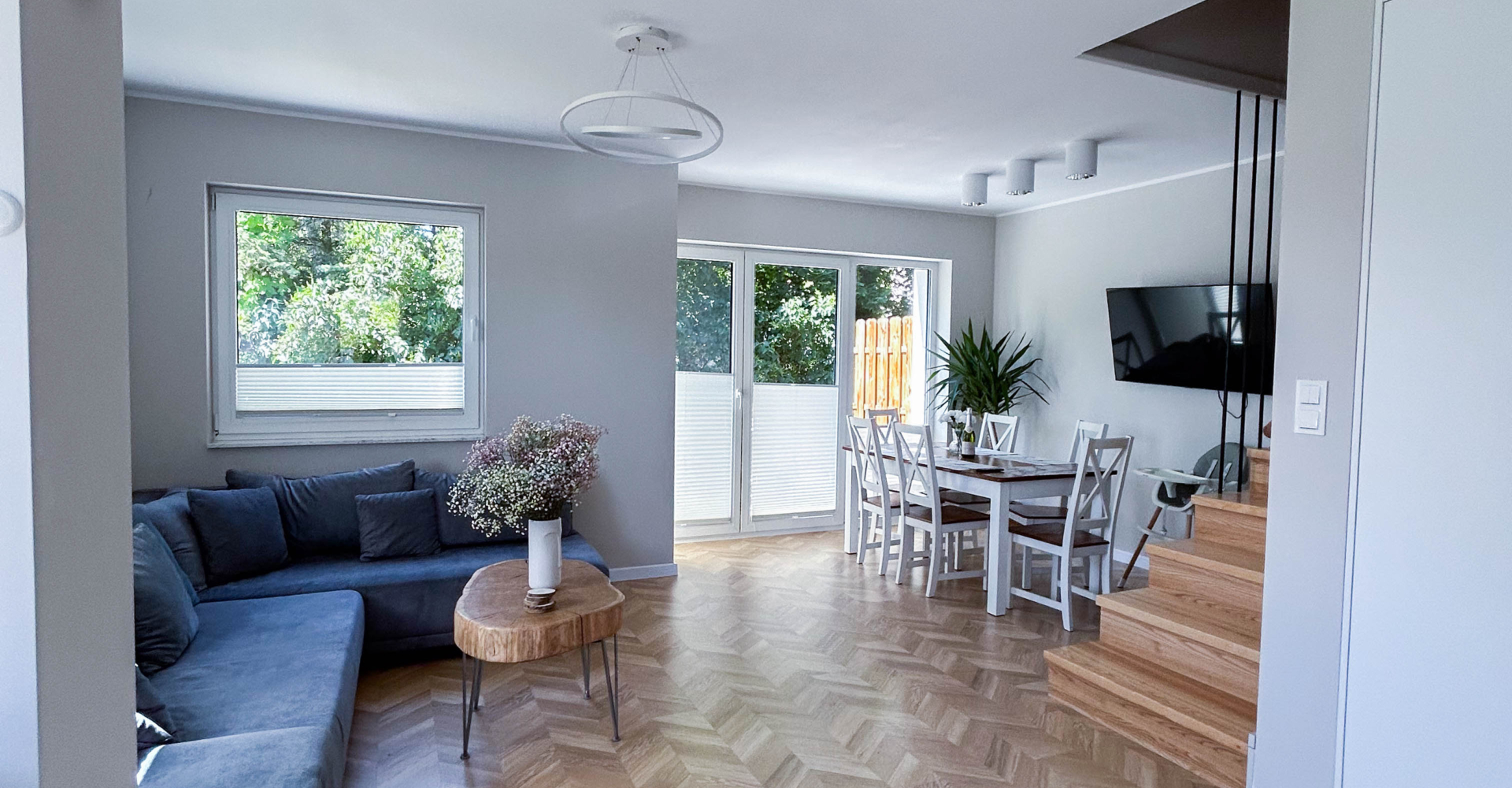 Parter – Salon z aneksem kuchennym, łazienka, jadalnia, duża szafa oraz wyjście na taras z miejscem do grillowania