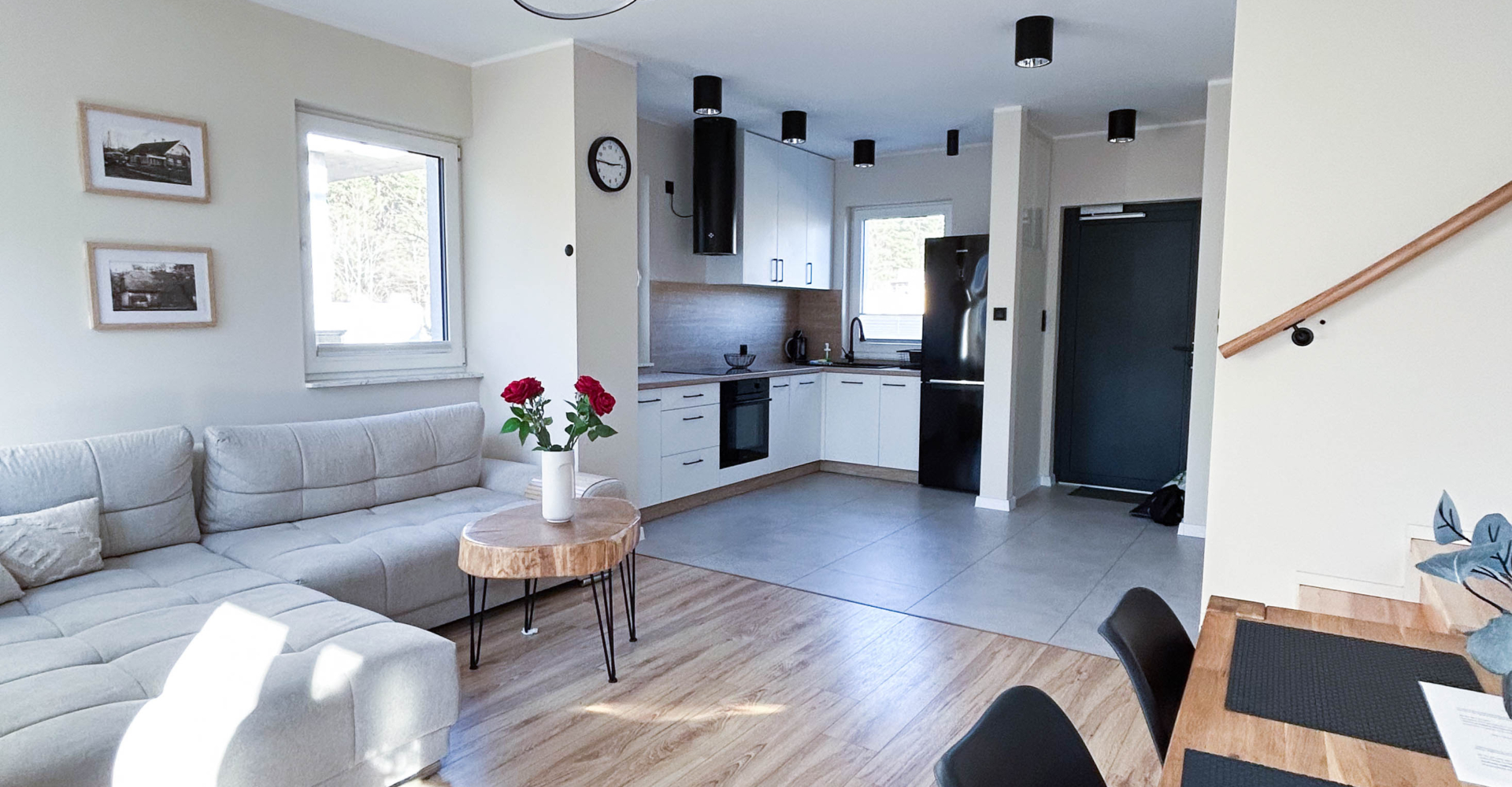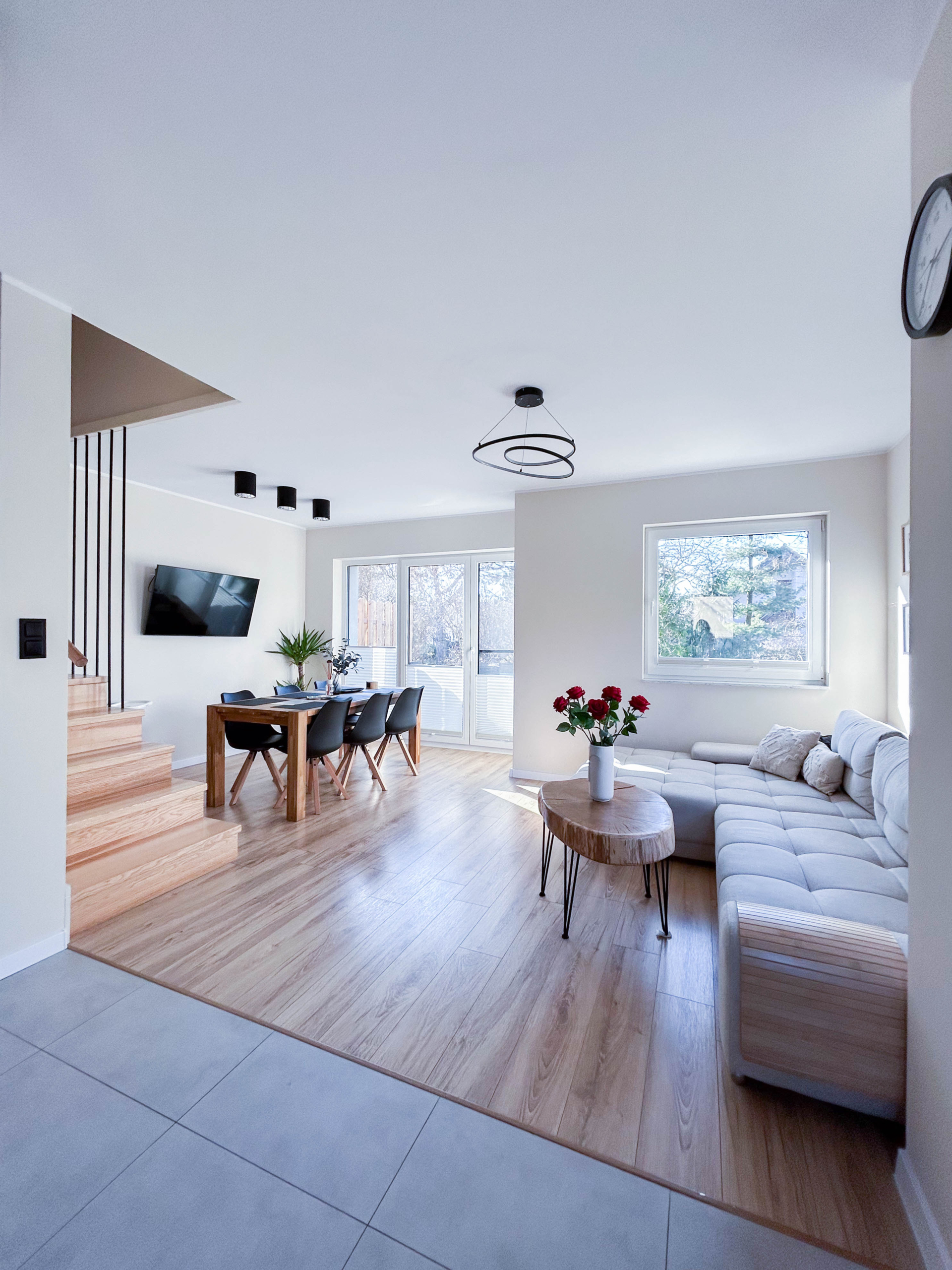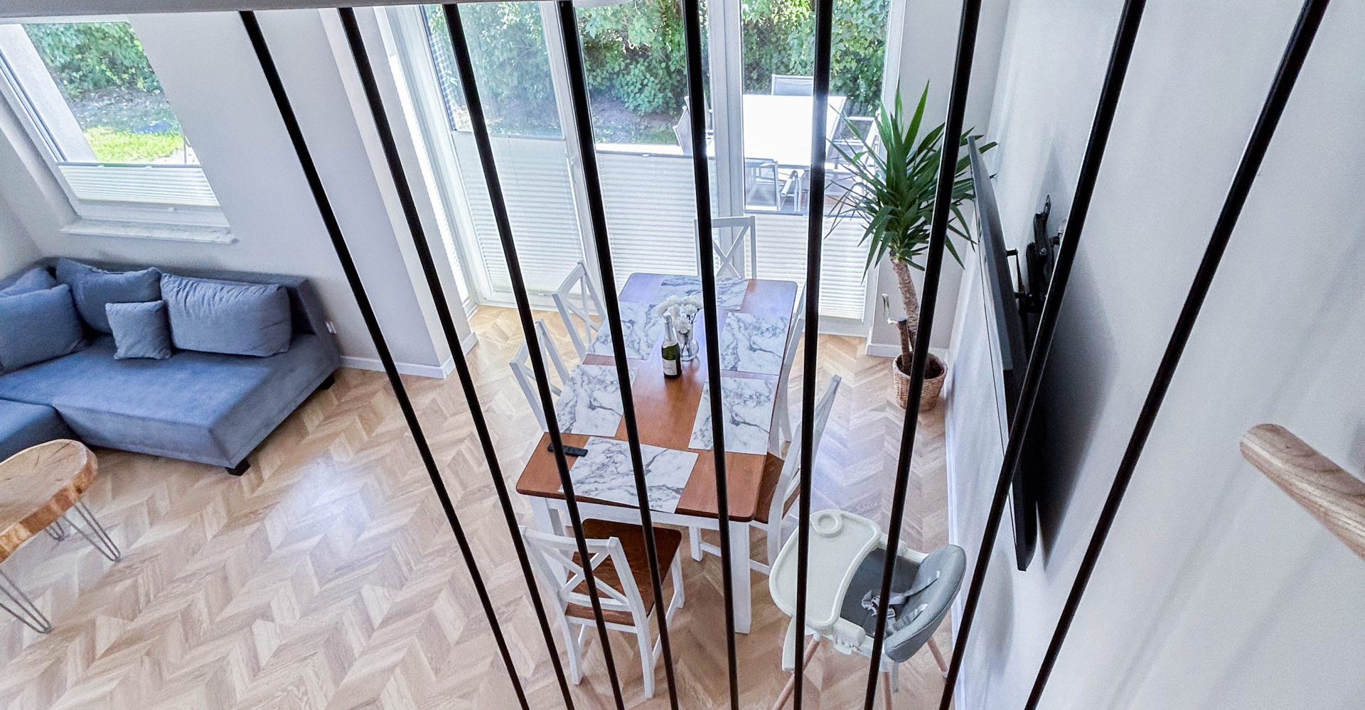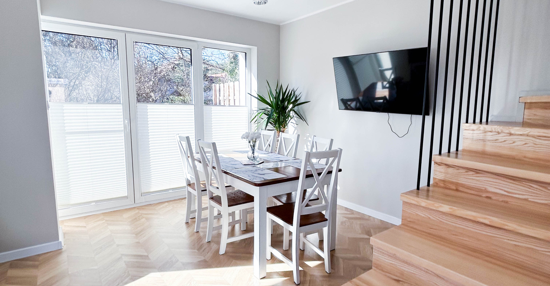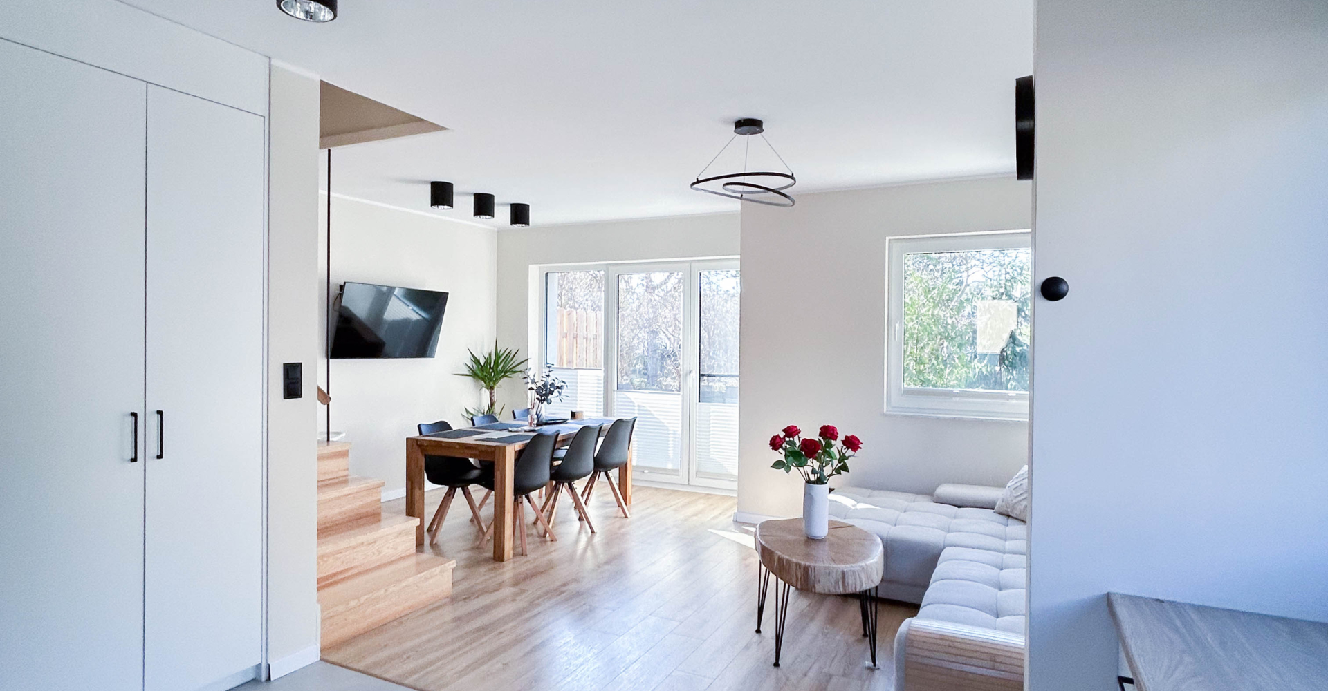 Parter – Salon z aneksem kuchennym, łazienka, jadalnia, duża szafa oraz wyjście na taras z miejscem do grillowania