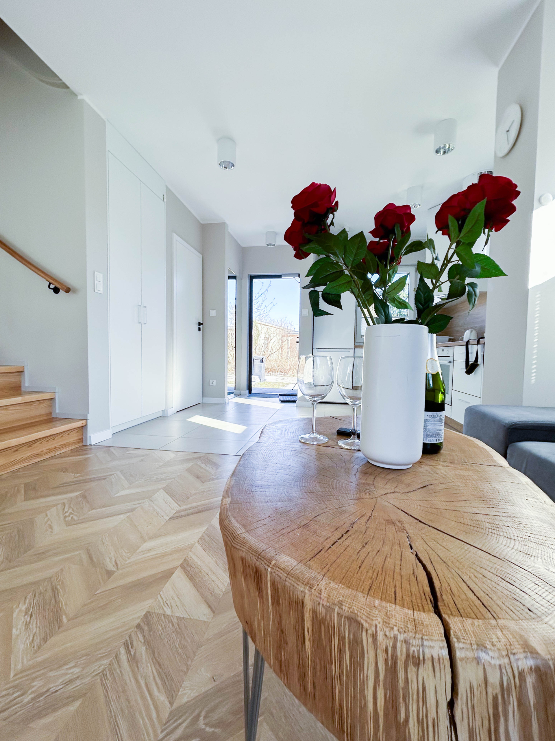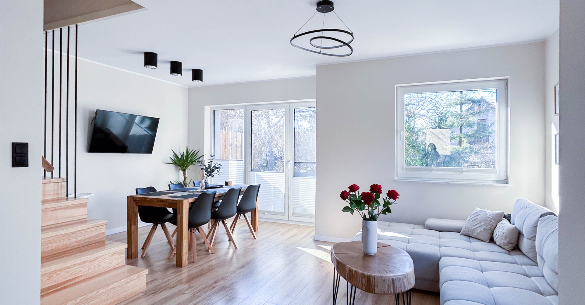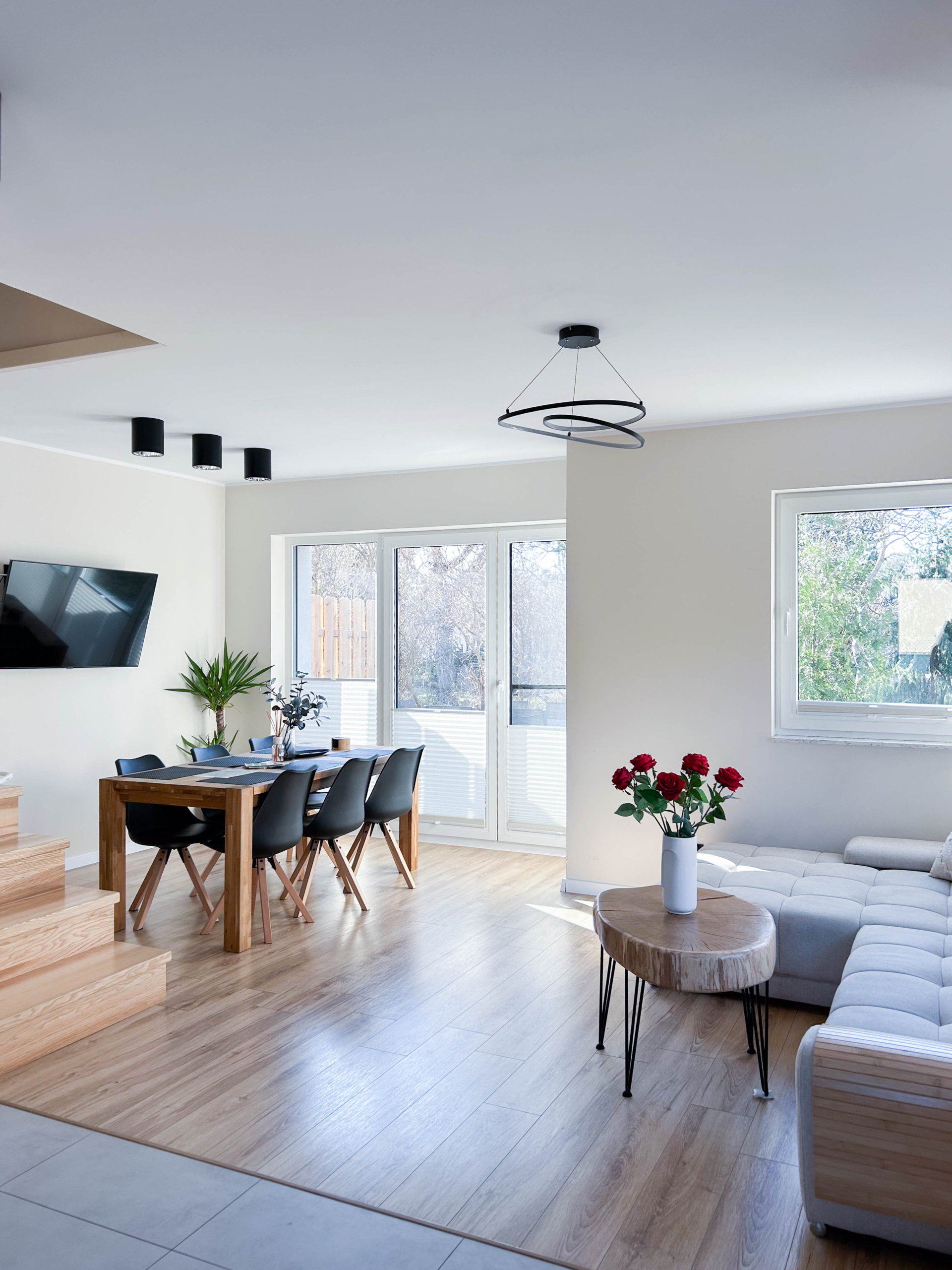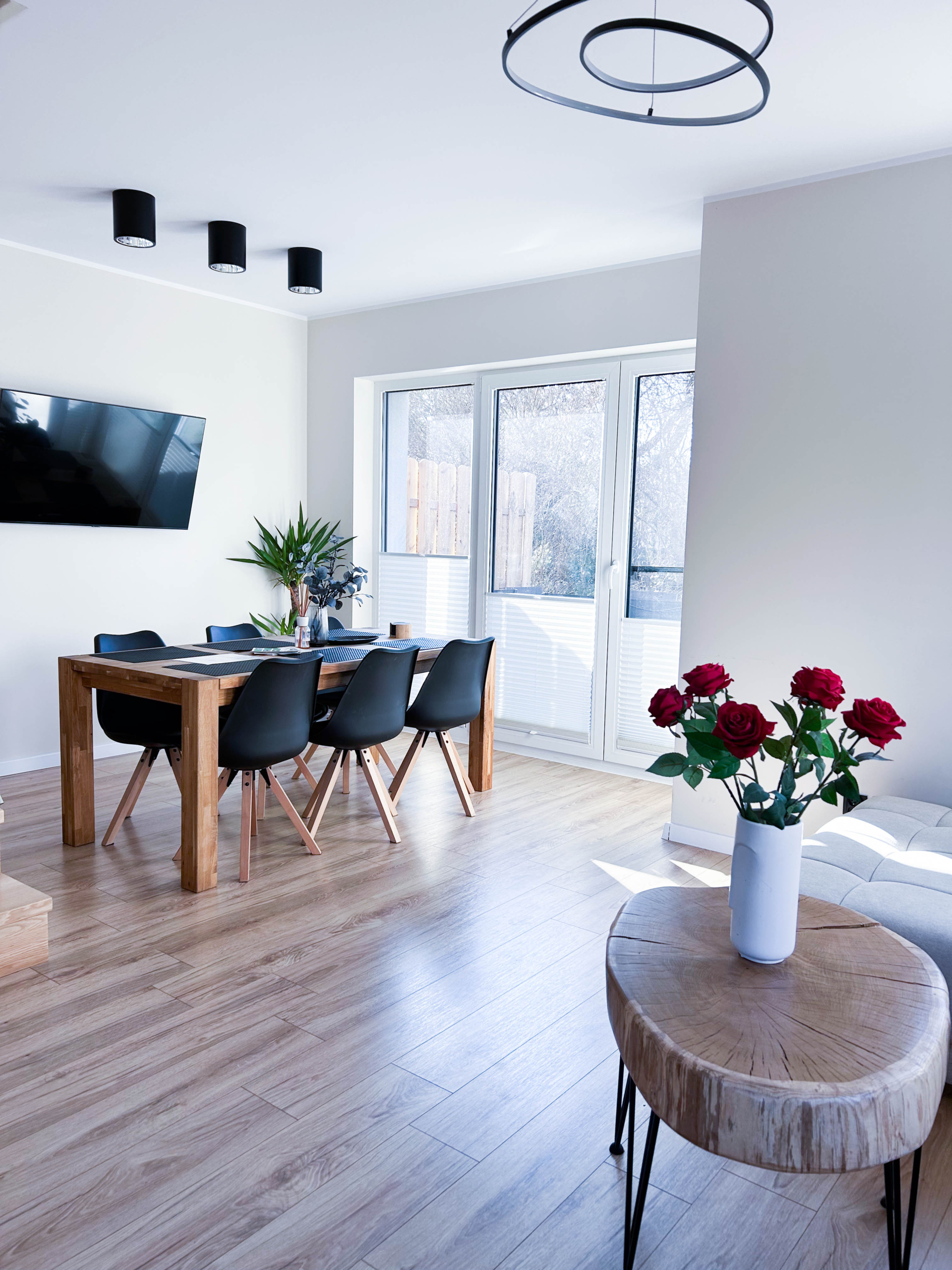 Parter – Salon z aneksem kuchennym, łazienka, jadalnia, duża szafa oraz wyjście na taras z miejscem do grillowania