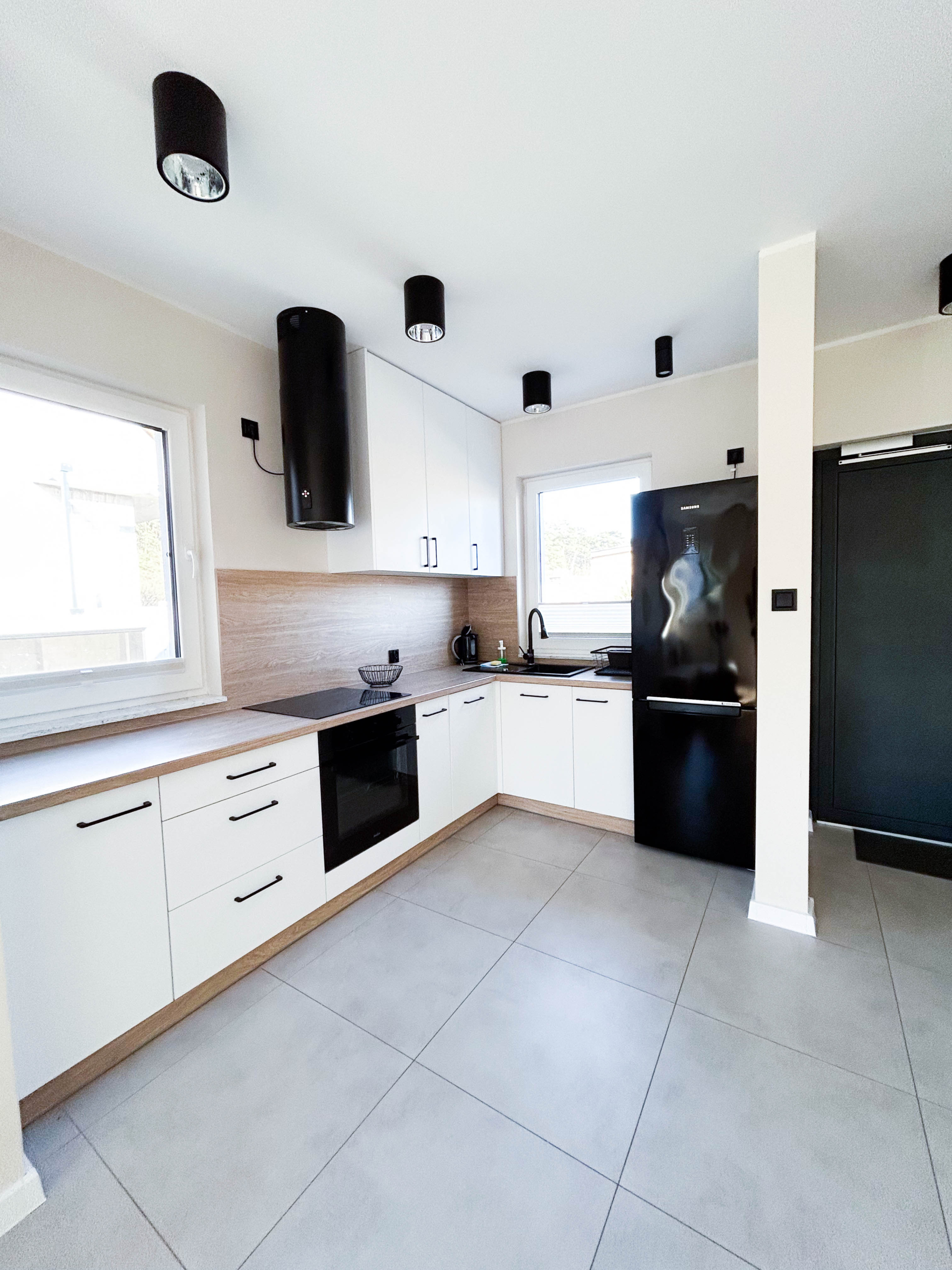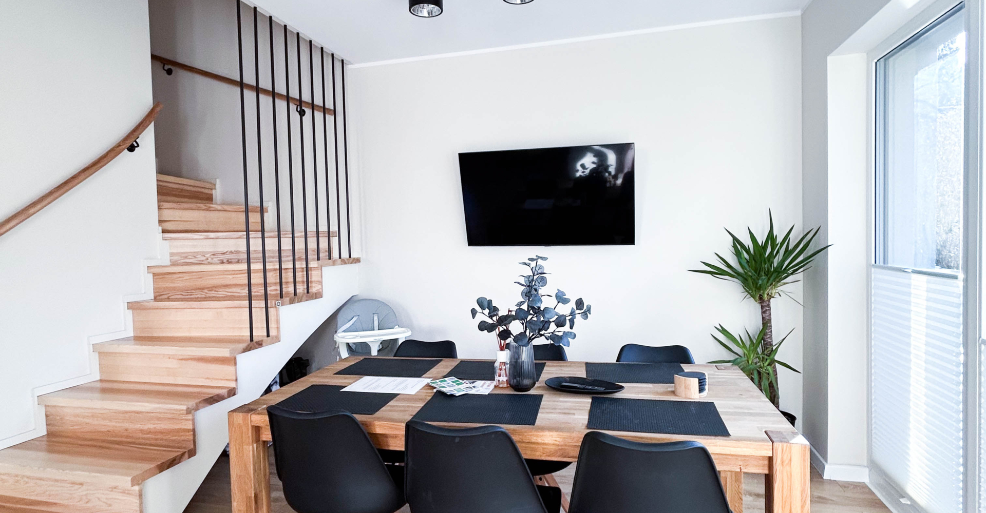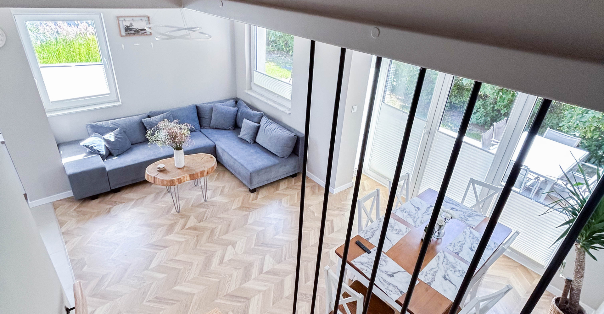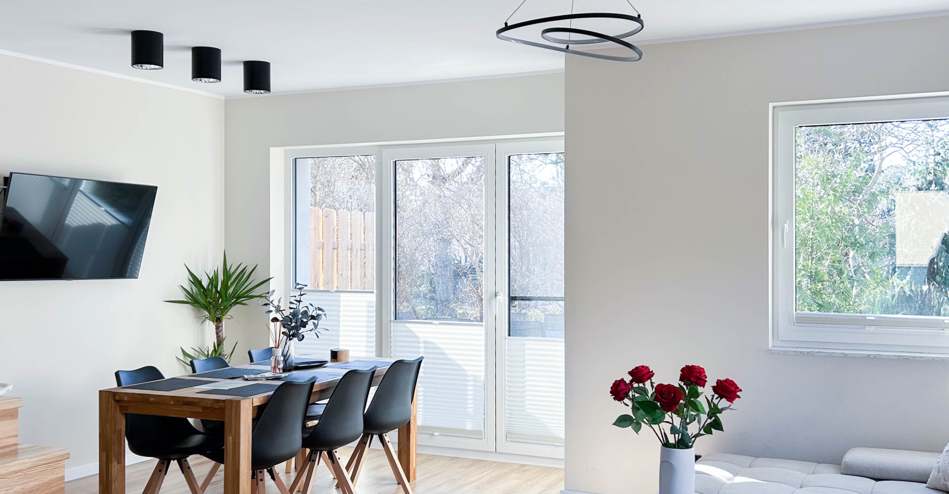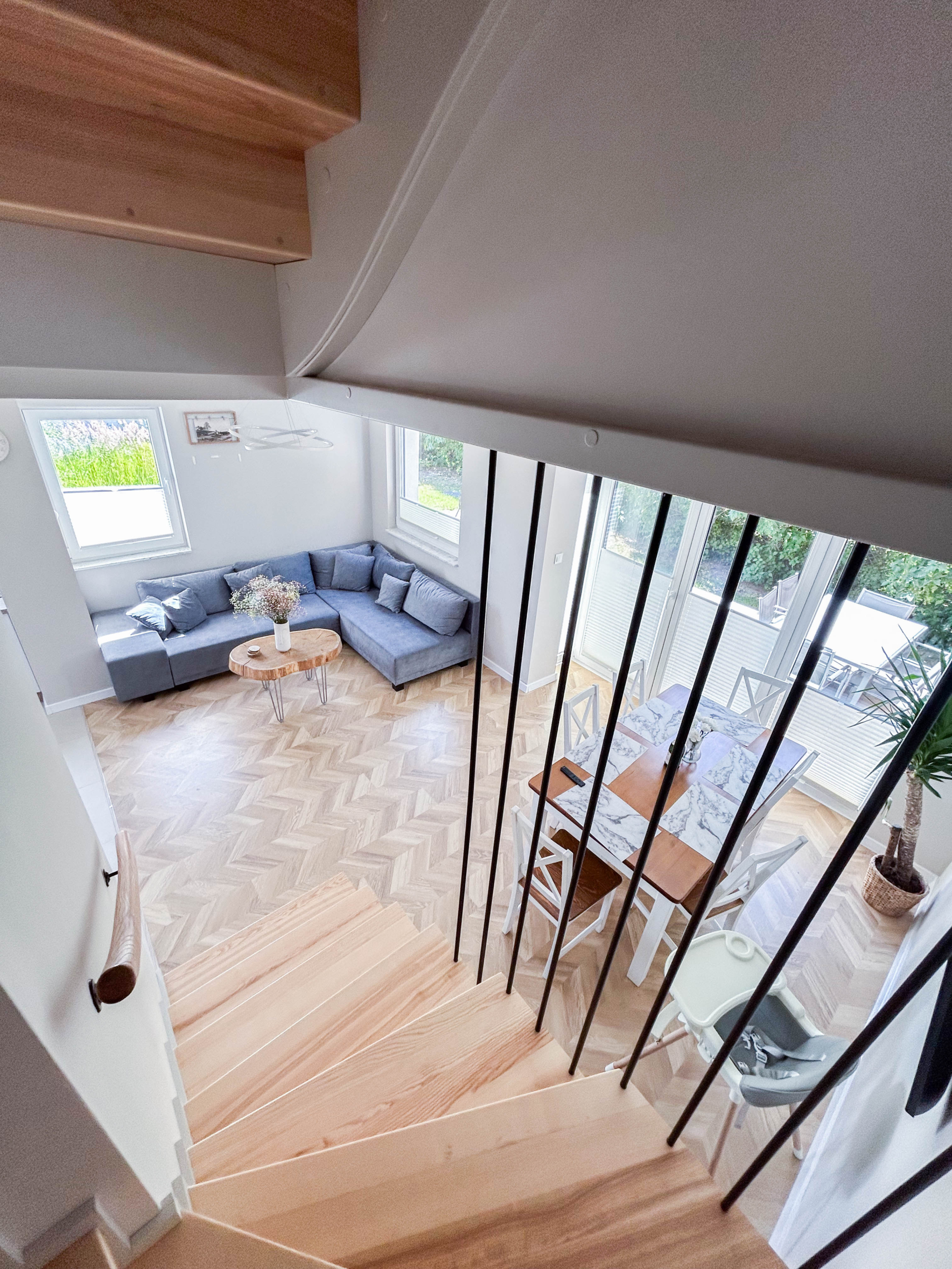 Parter – Salon z aneksem kuchennym, łazienka, jadalnia, duża szafa oraz wyjście na taras z miejscem do grillowania