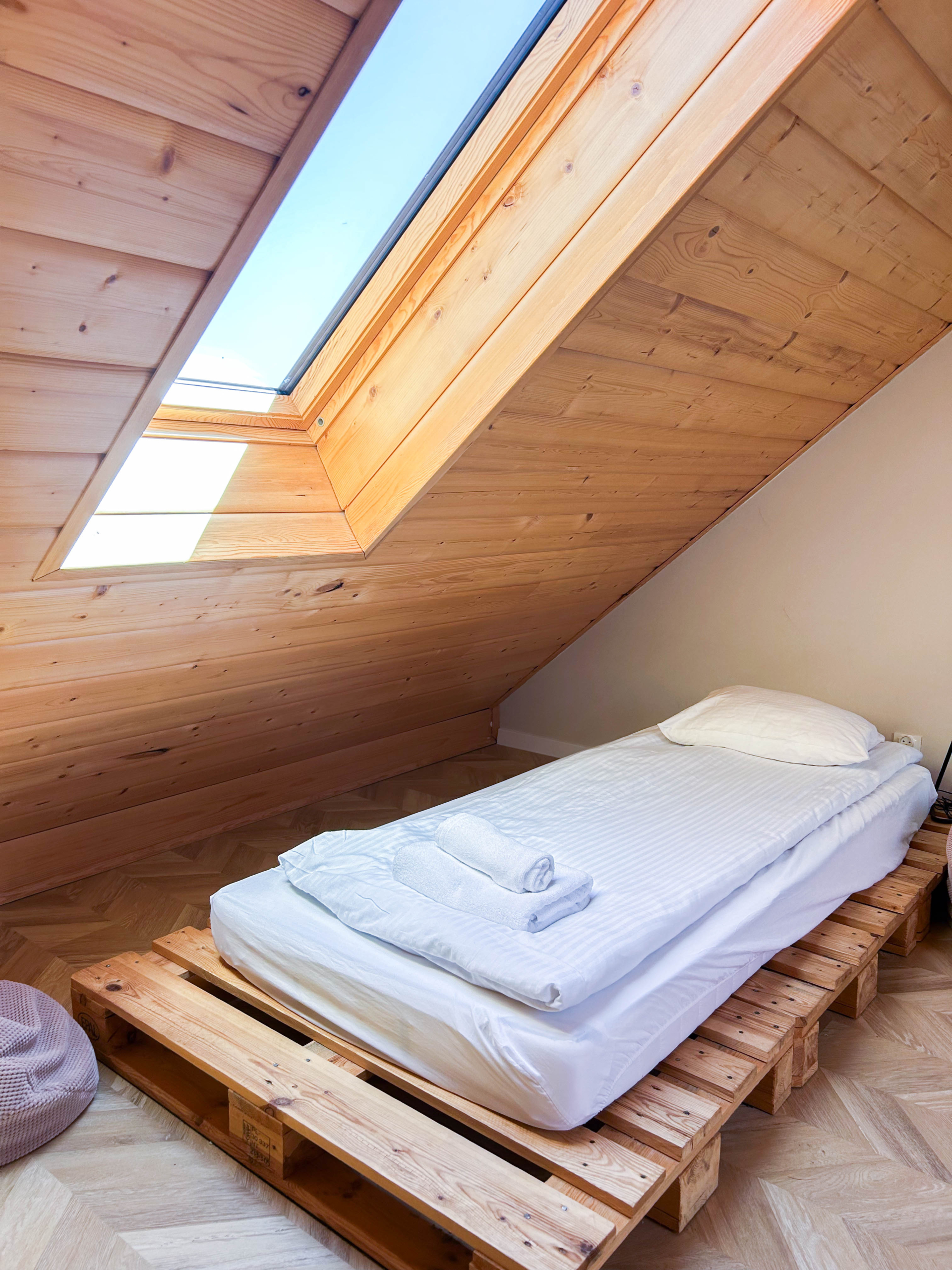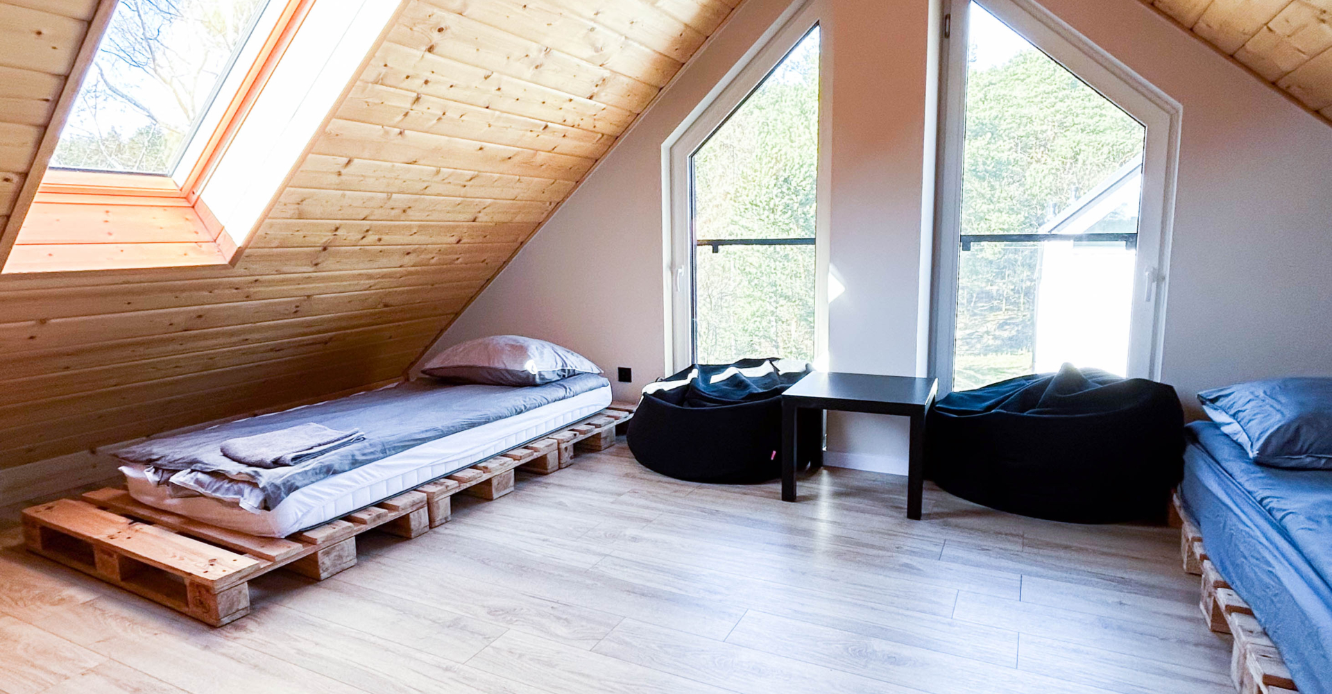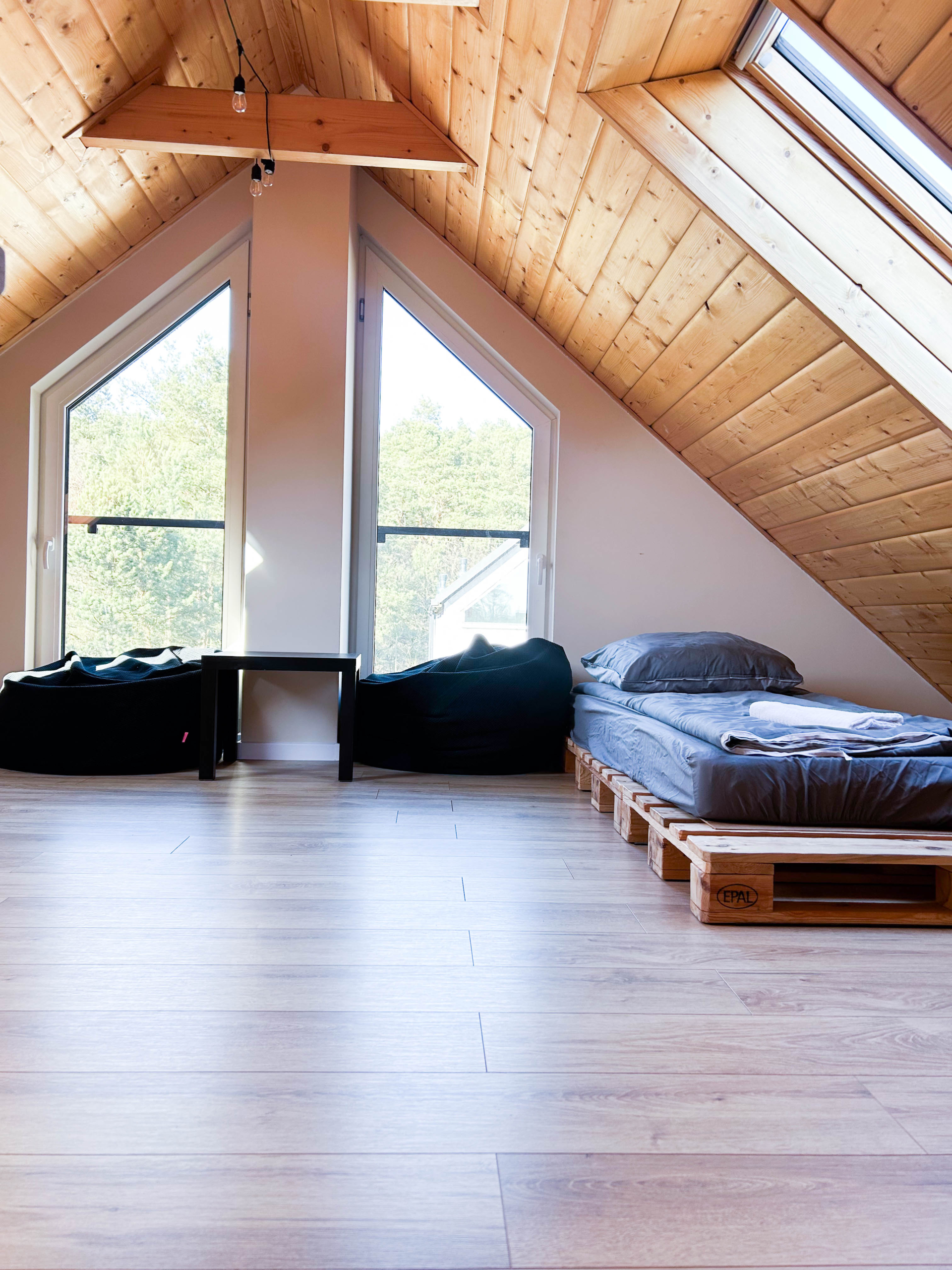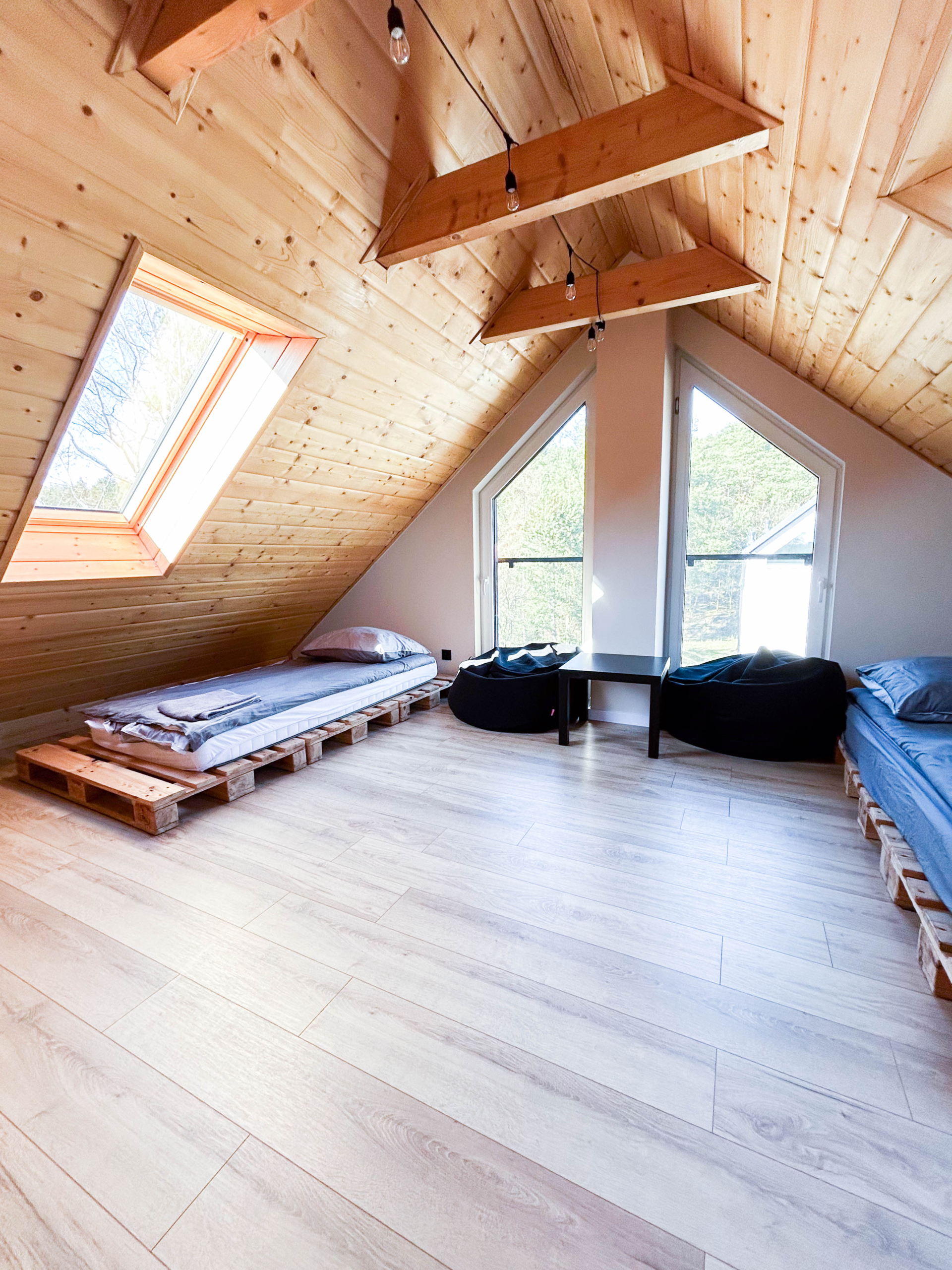 Drugie piętro (poddasze) – pomieszczenie młodzieżowe 2 łóżka z europalet 90 cm x 200 cm