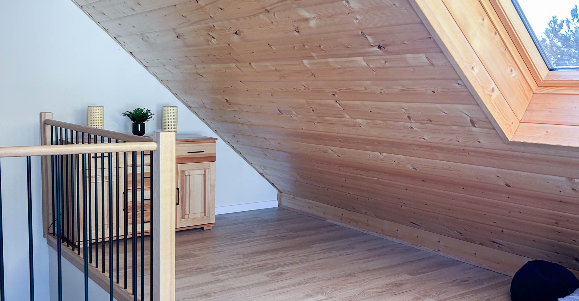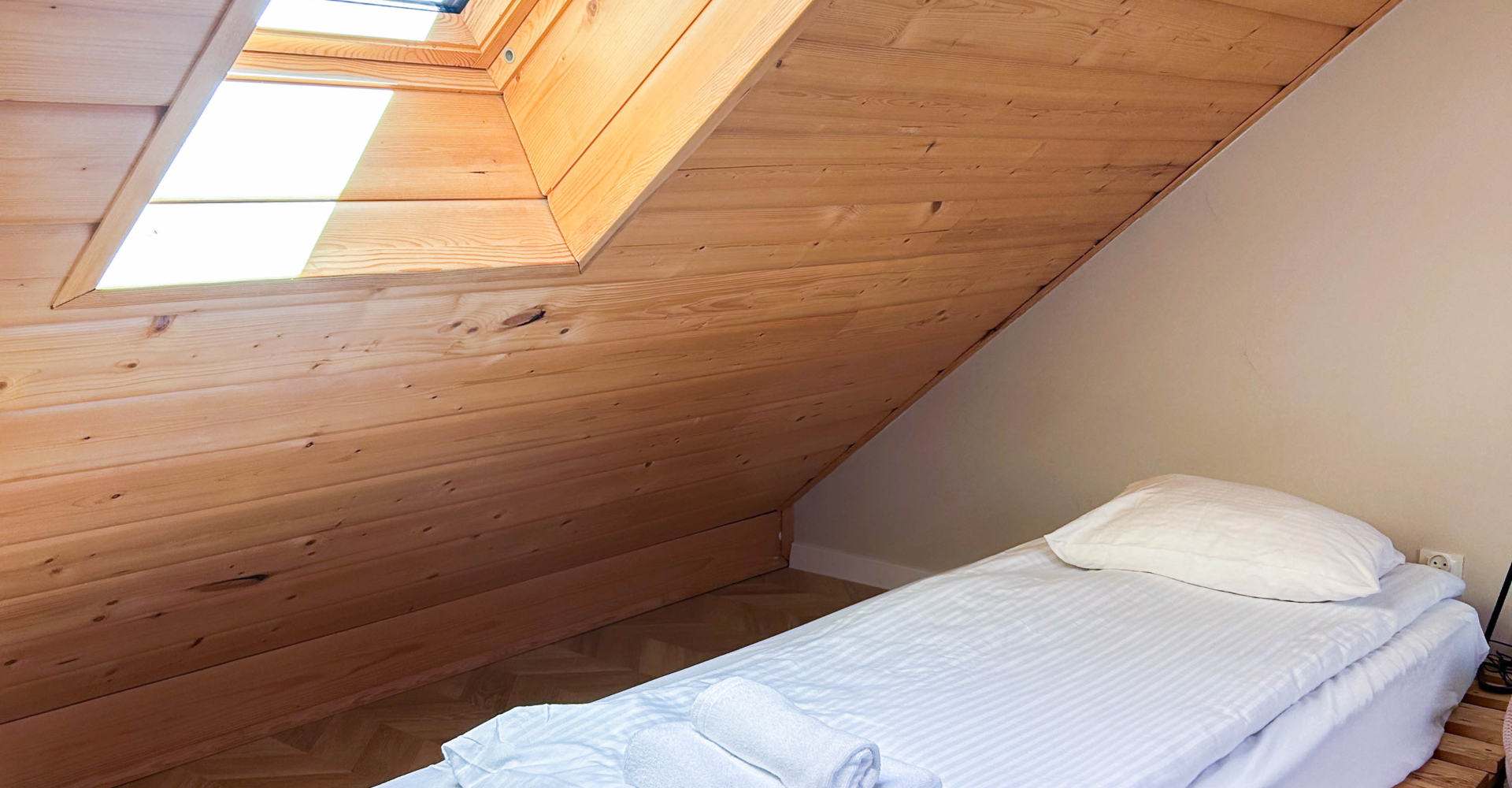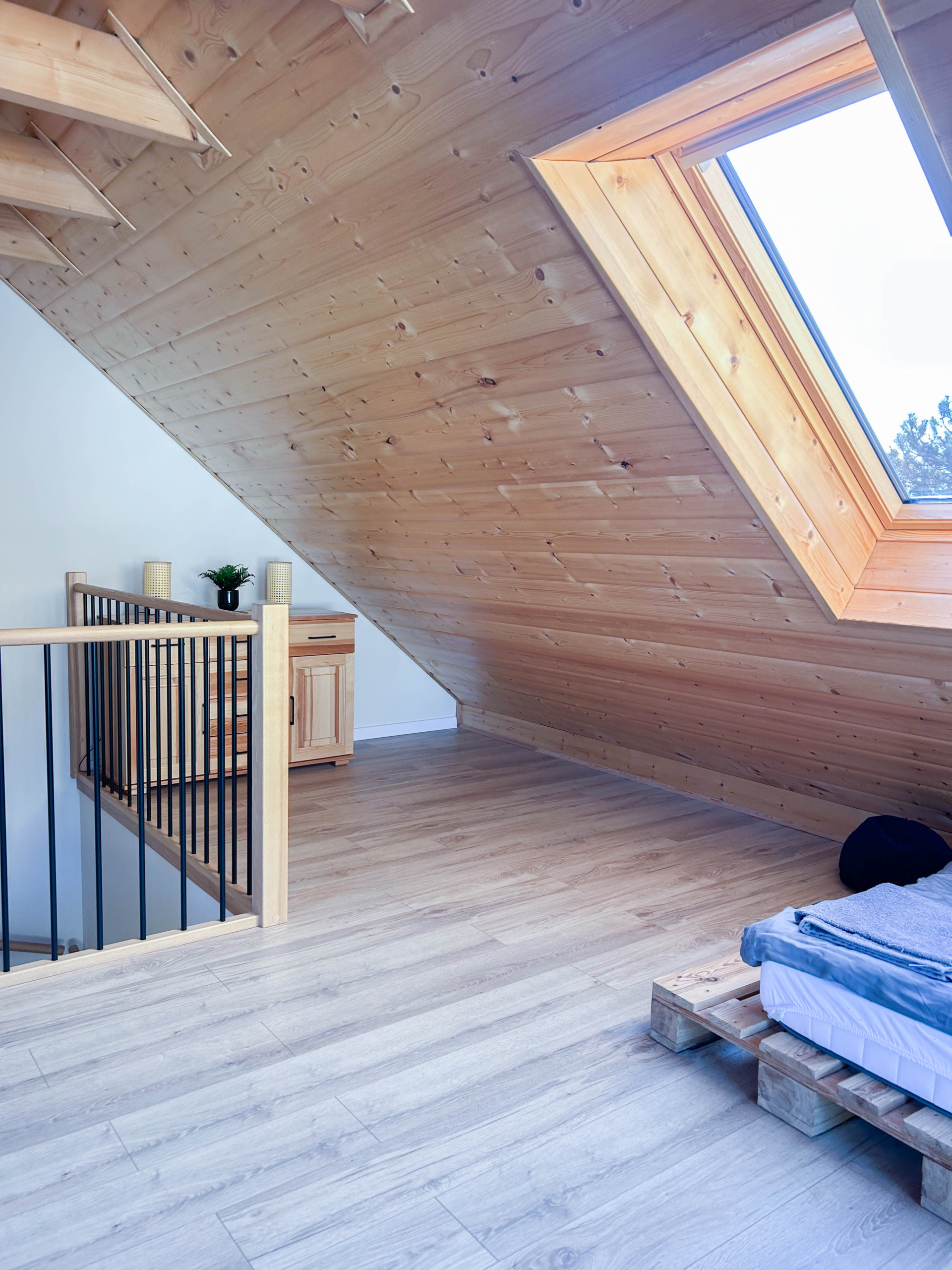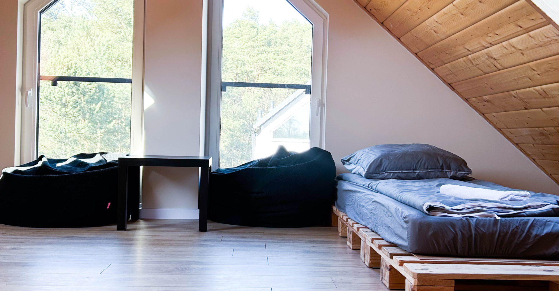 Drugie piętro (poddasze) – pomieszczenie młodzieżowe 2 łóżka z europalet 90 cm x 200 cm