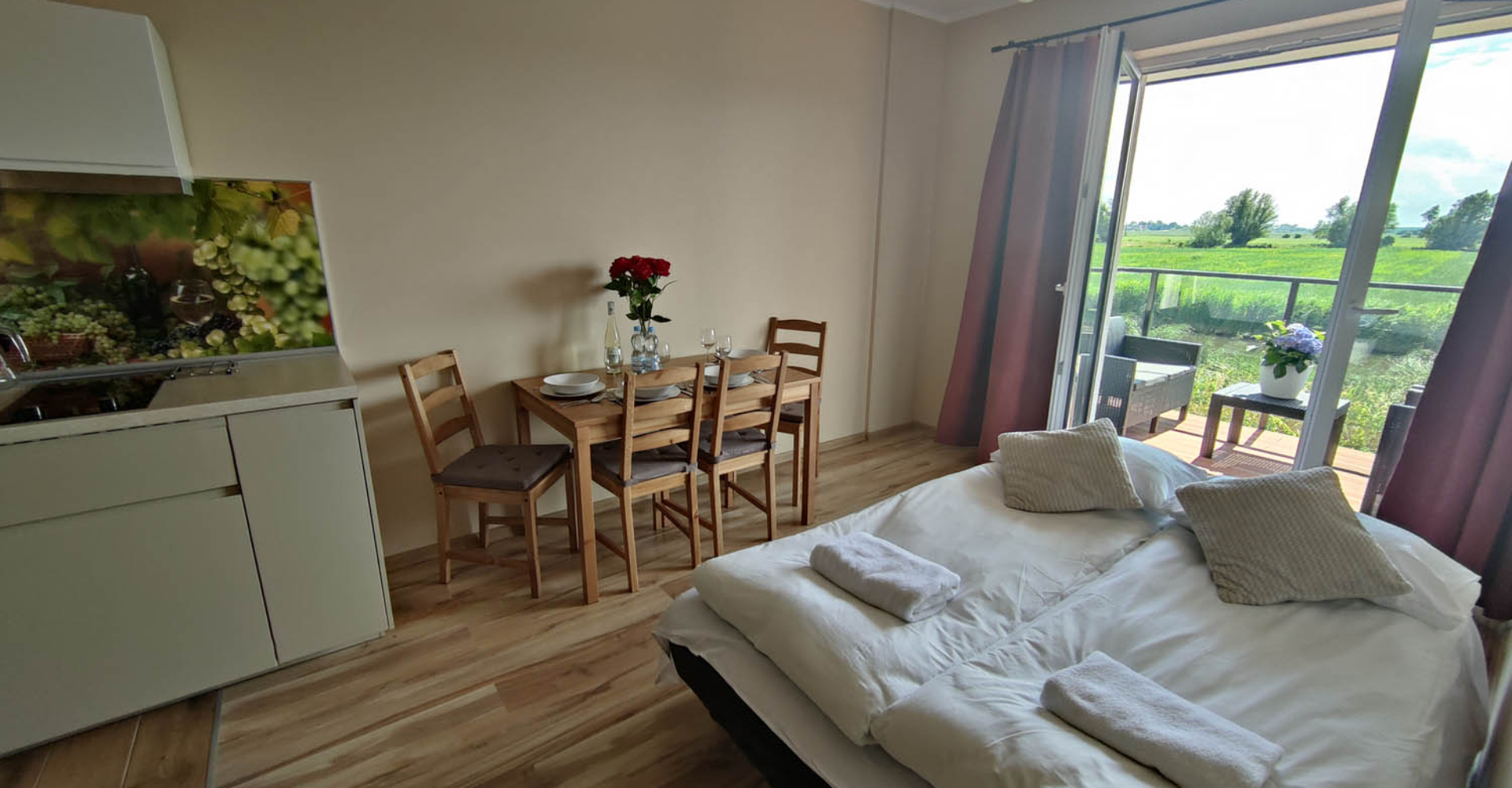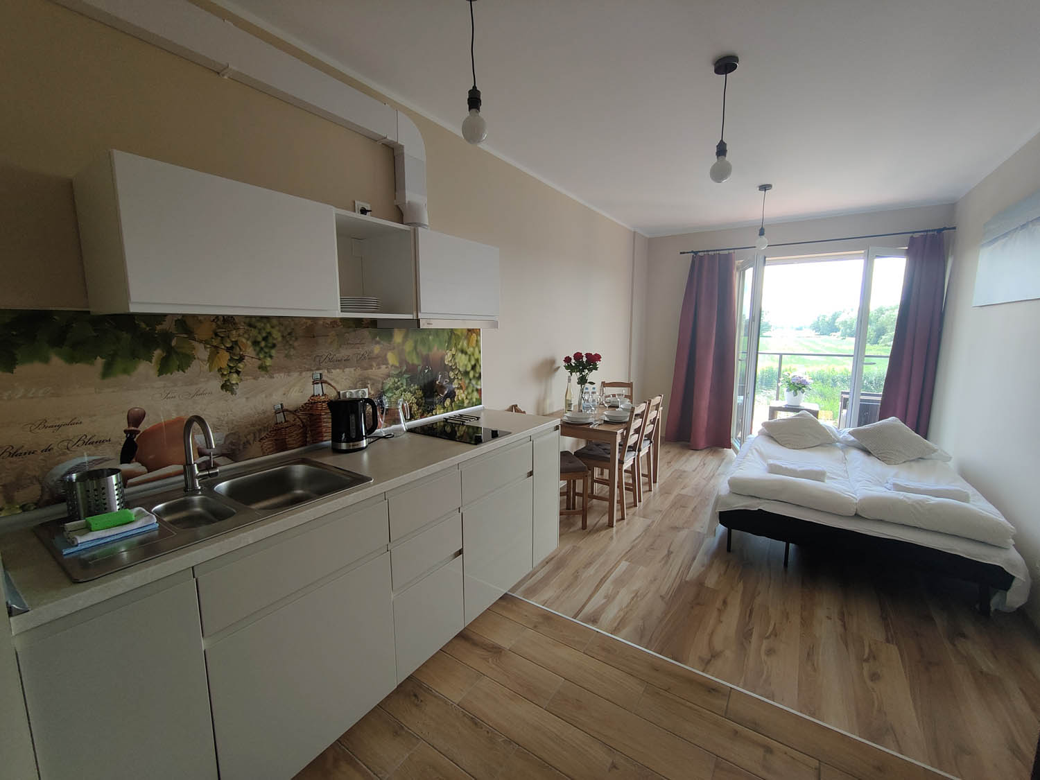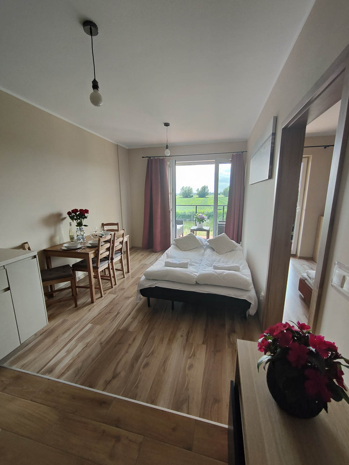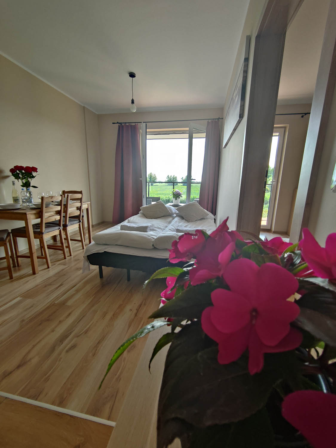 Sypialnia, salon z aneksem kuchennym, łazienka, balkon z pięknym widokiem na pola