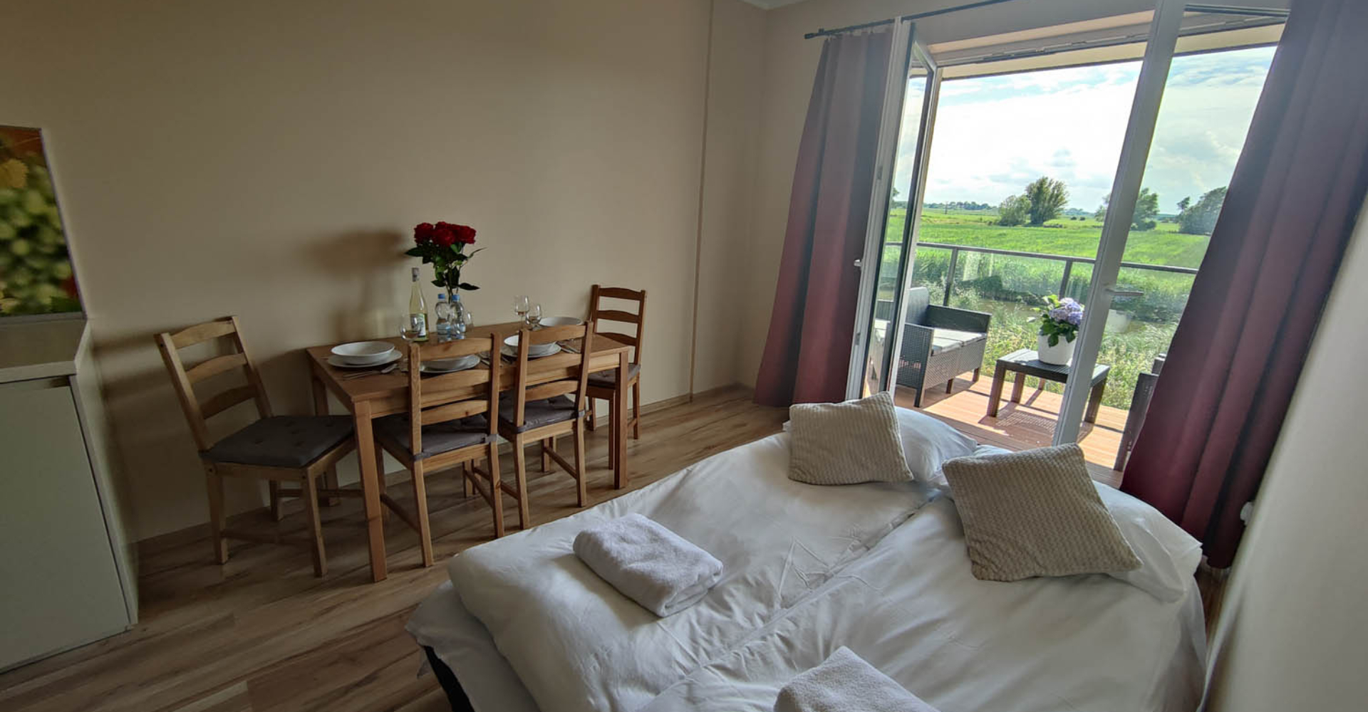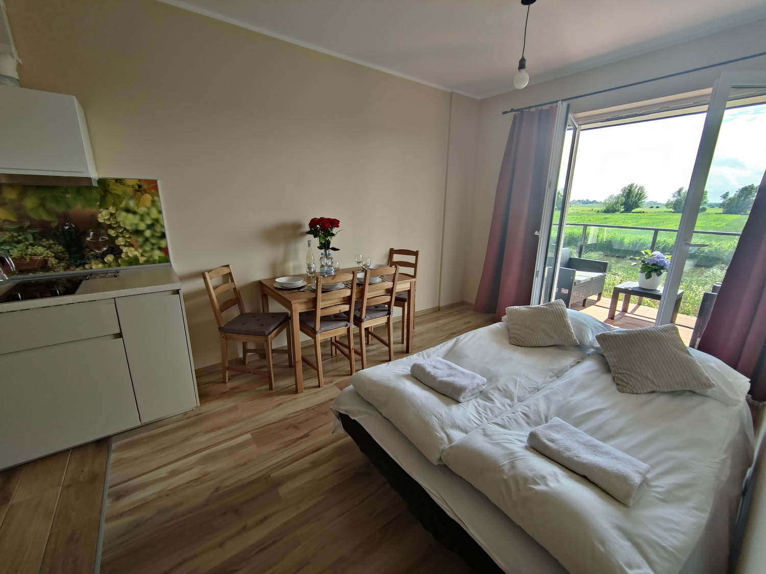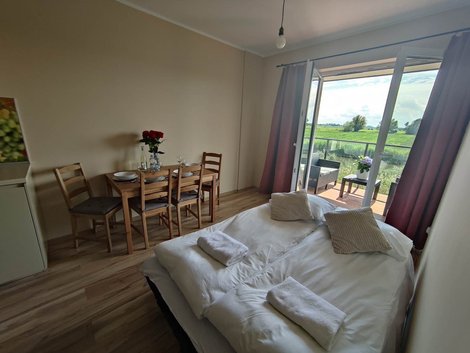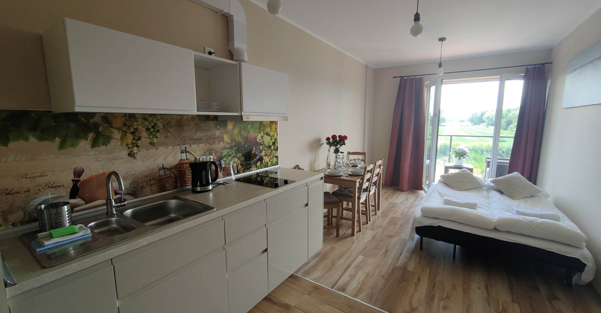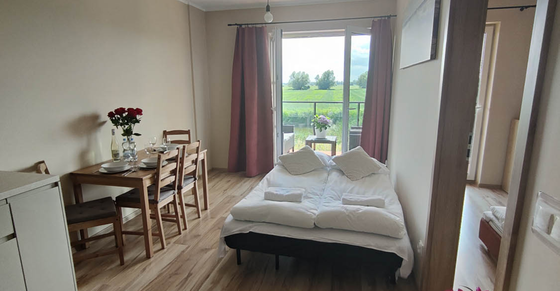 Sypialnia, salon z aneksem kuchennym, łazienka, balkon z pięknym widokiem na pola