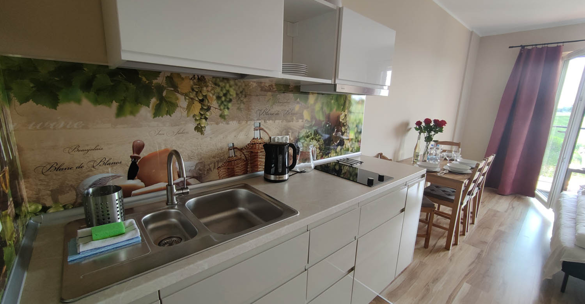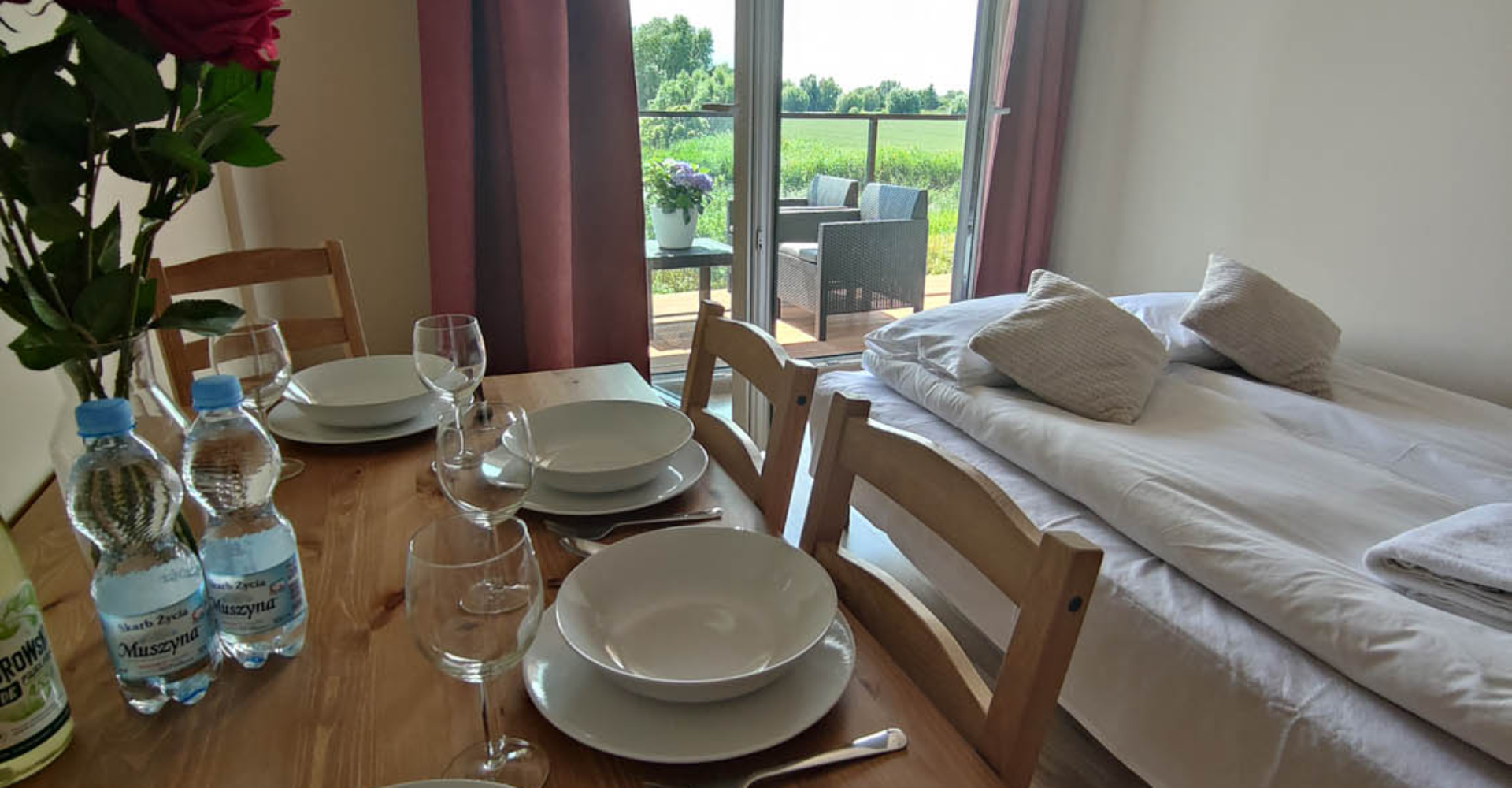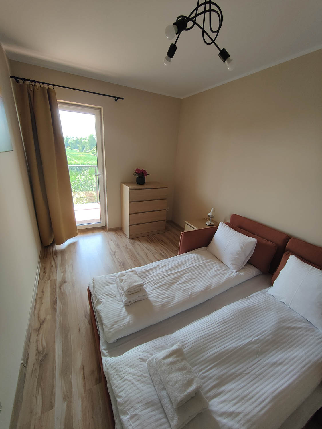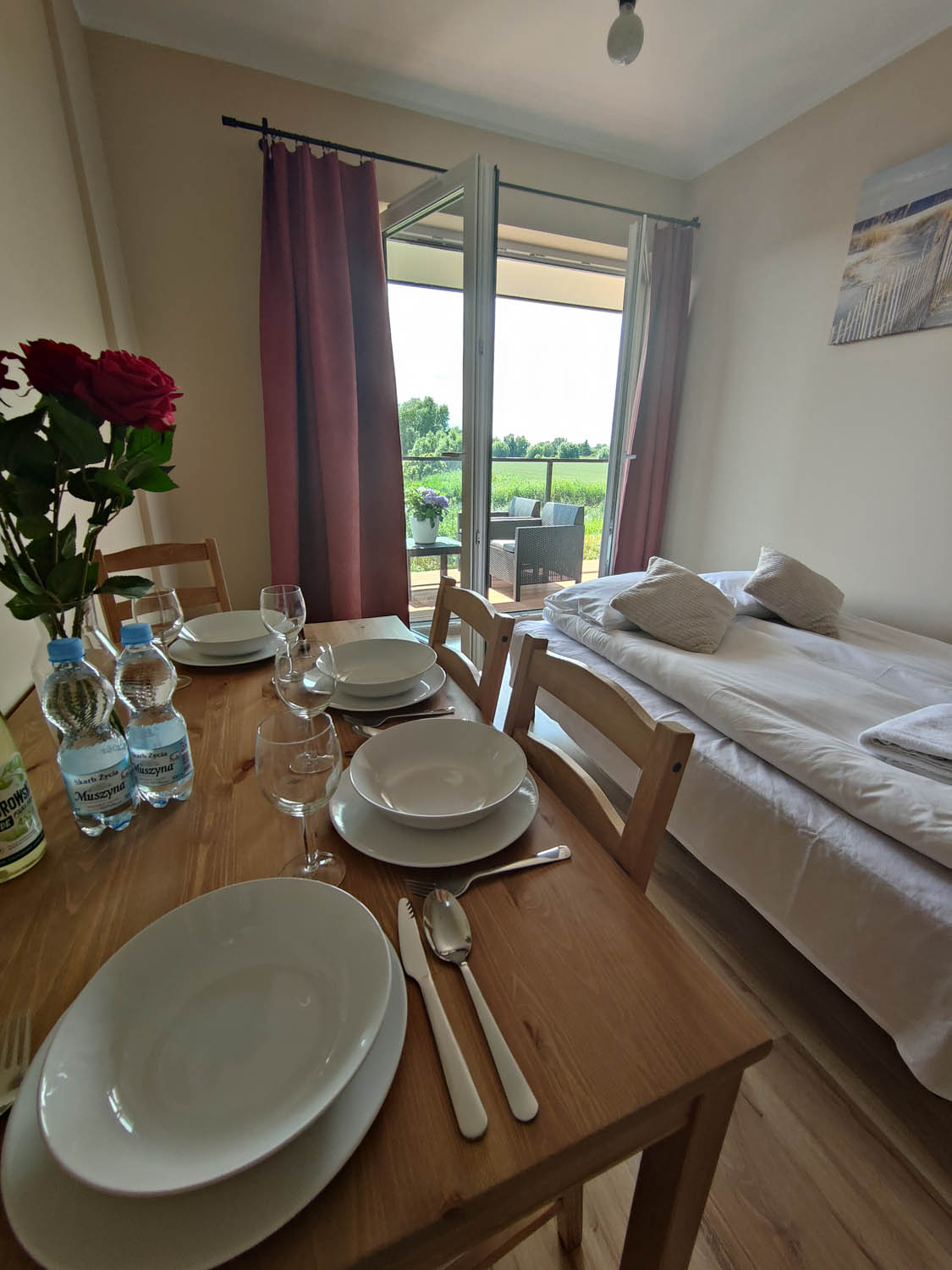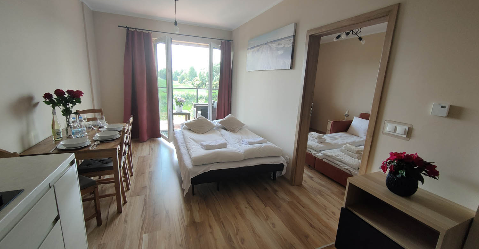 Apartament stanowi niezależne, czteroosobowe mieszkania w pełni wyposażone i umeblowane. Gwarantuje wyjątkowe poczucie intymności, swobody i niezależności. Pozwalają spędzić czas urlopu wyłącznie w towarzystwie ukochanej osoby bądź znajomych. Nowoczesne wykończenie zwiększają odczucie komfortu.