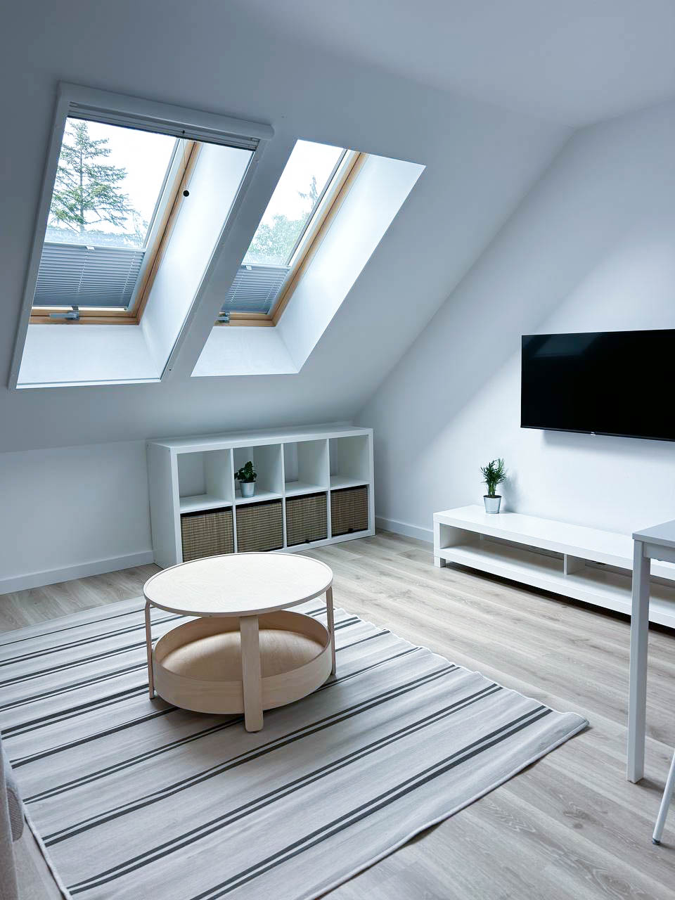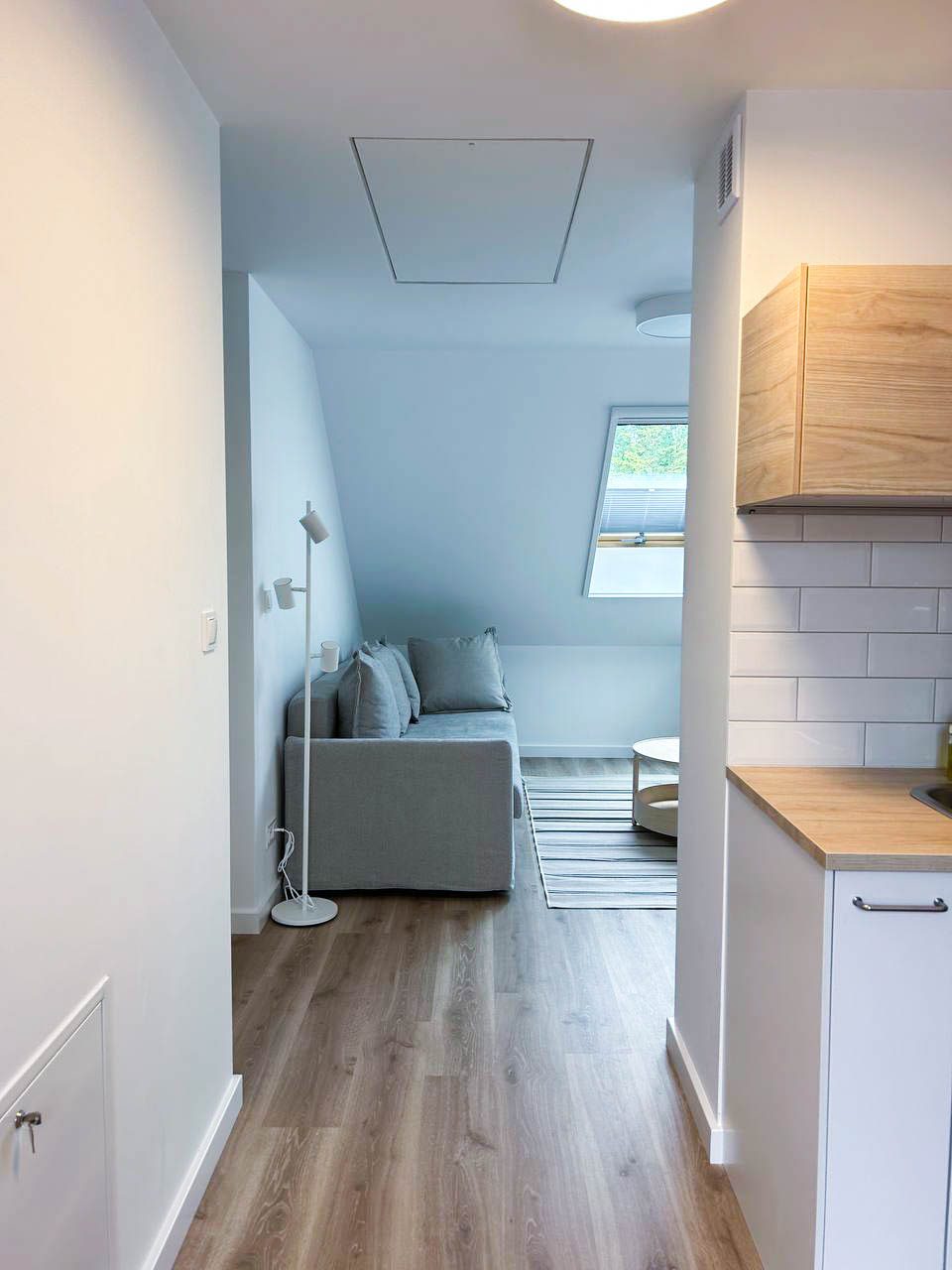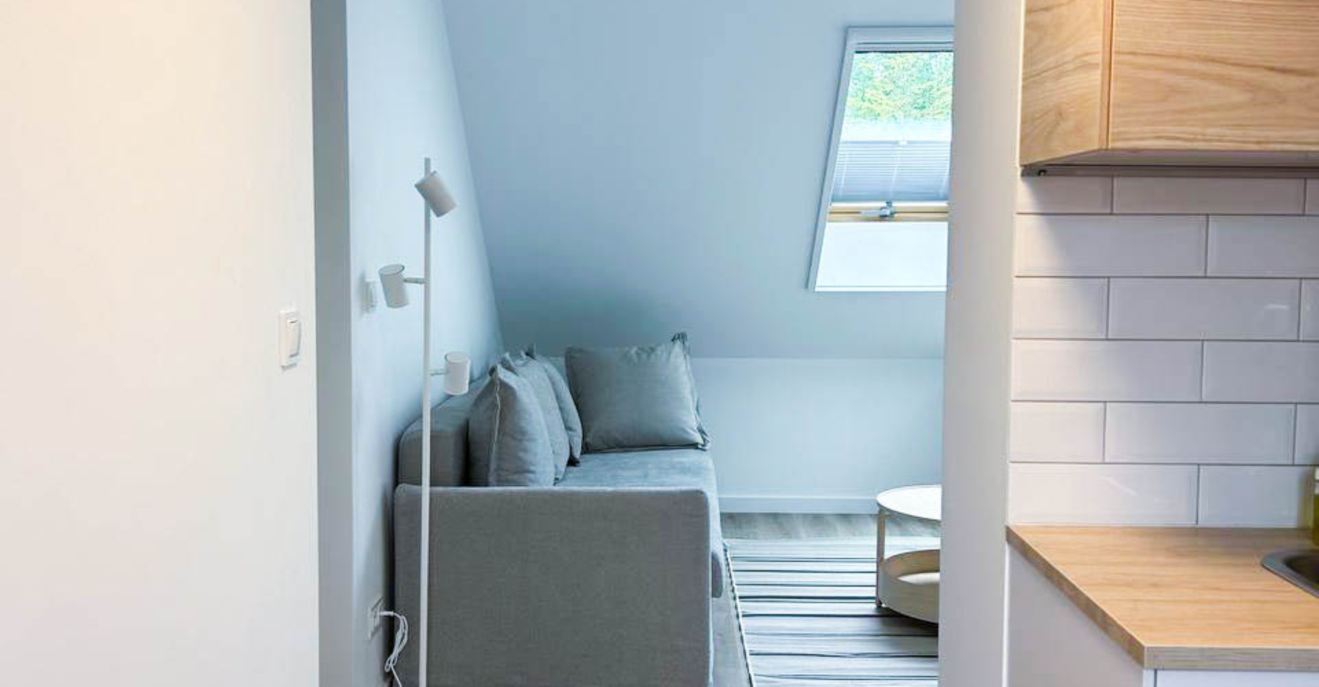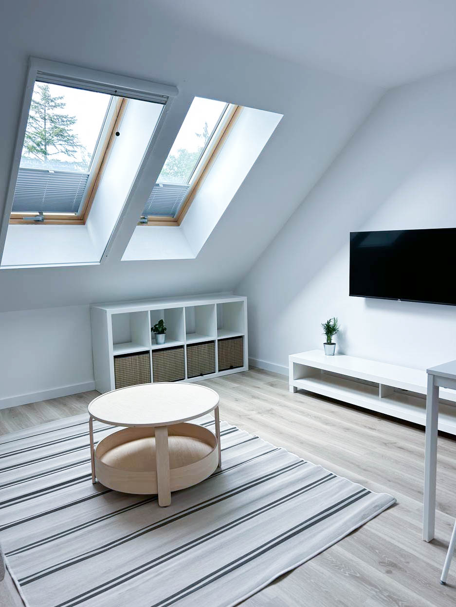 Salon – przestronny salon z rozkładaną sofą, doskonały do relaksu i jako dodatkowe miejsce do spania. Salon jest połączony z aneksem kuchennym, tworząc wygodną i funkcjonalną przestrzeń do przygotowywania posiłków.