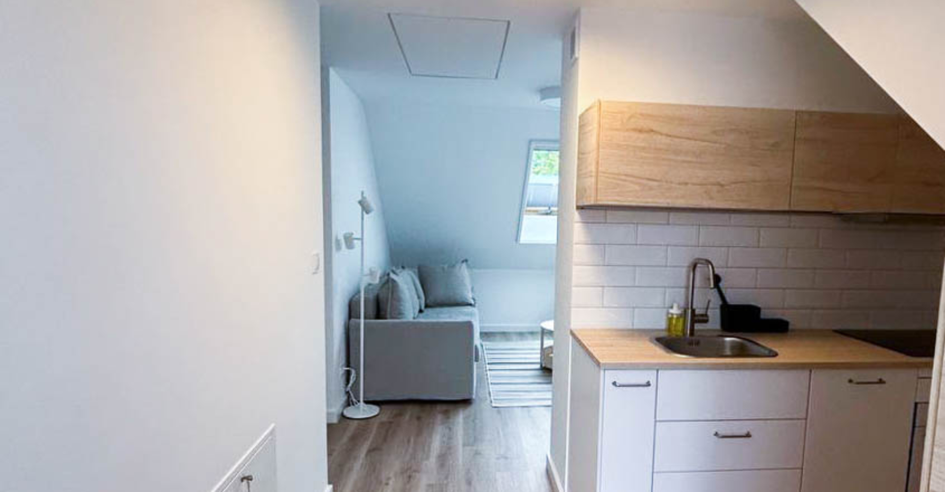 Salon z rozkładaną sofą, aneks kuchenny, balkon, łazienka z prysznicem