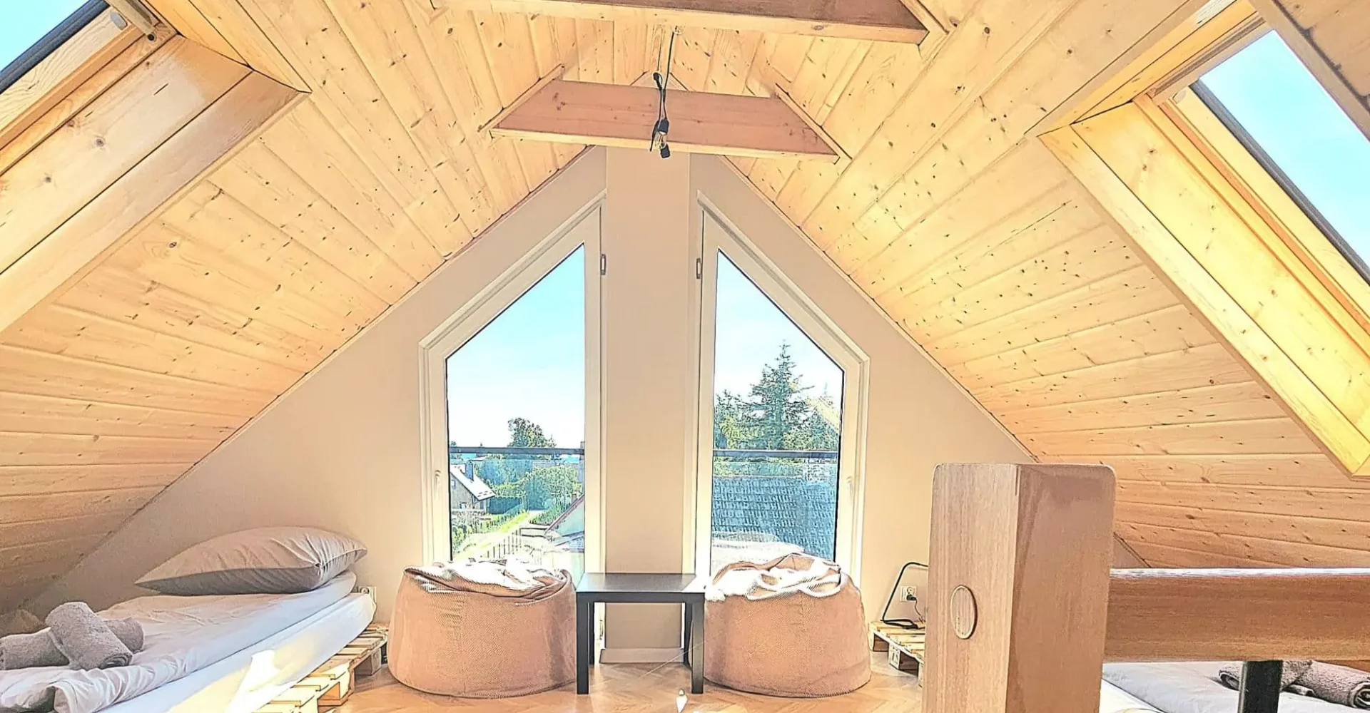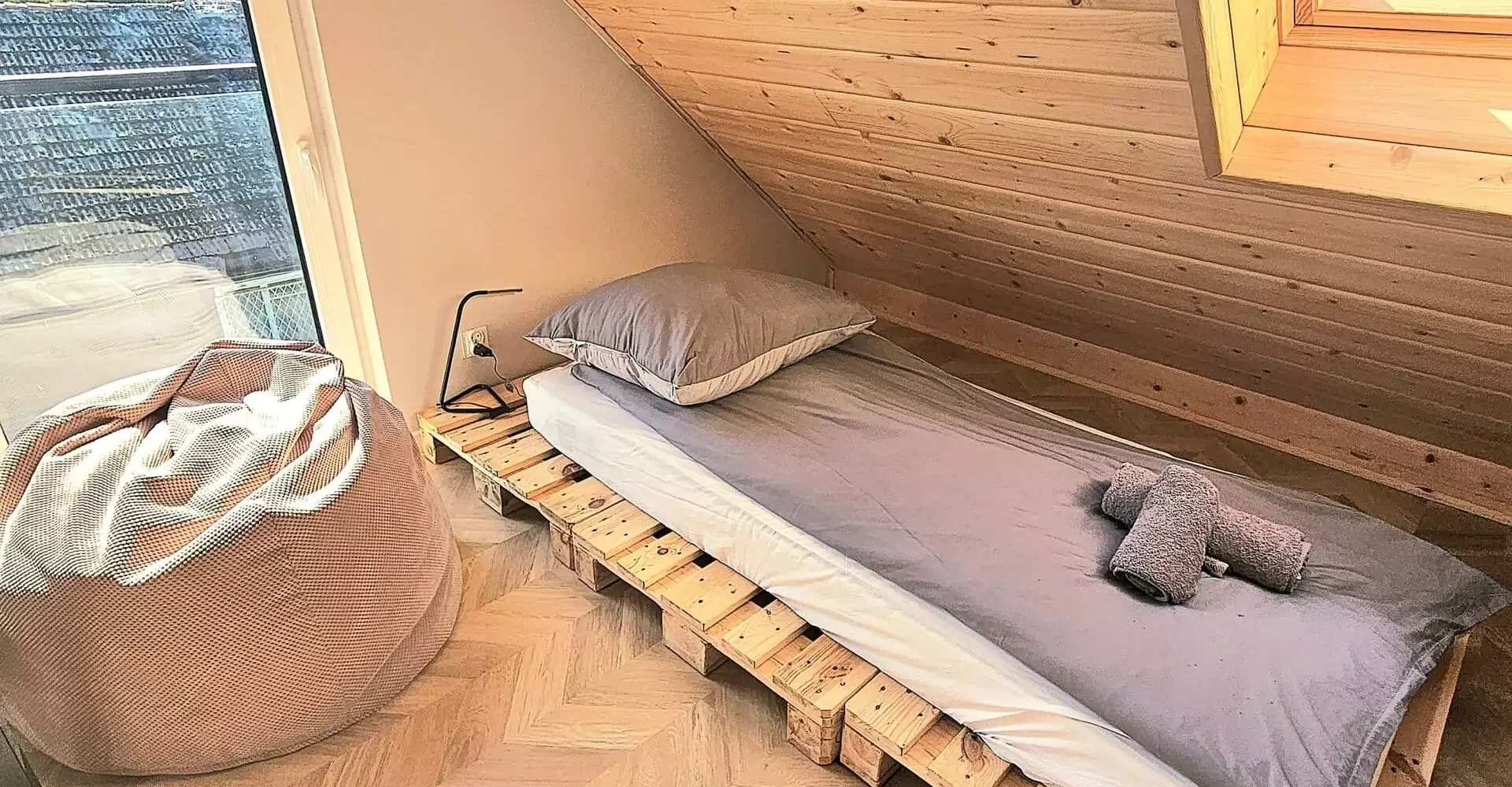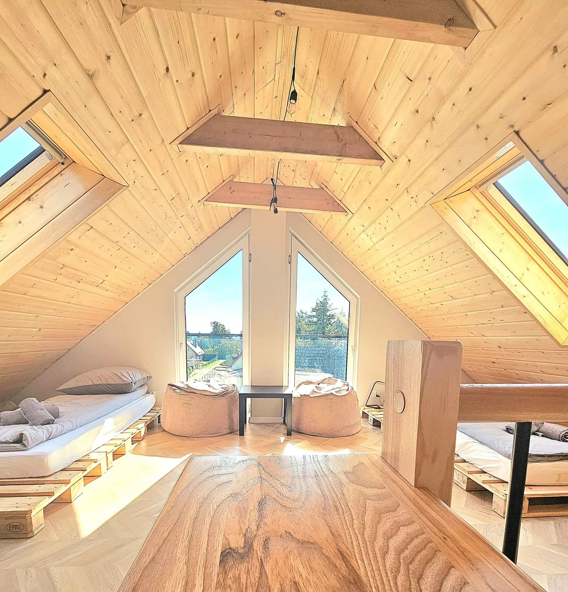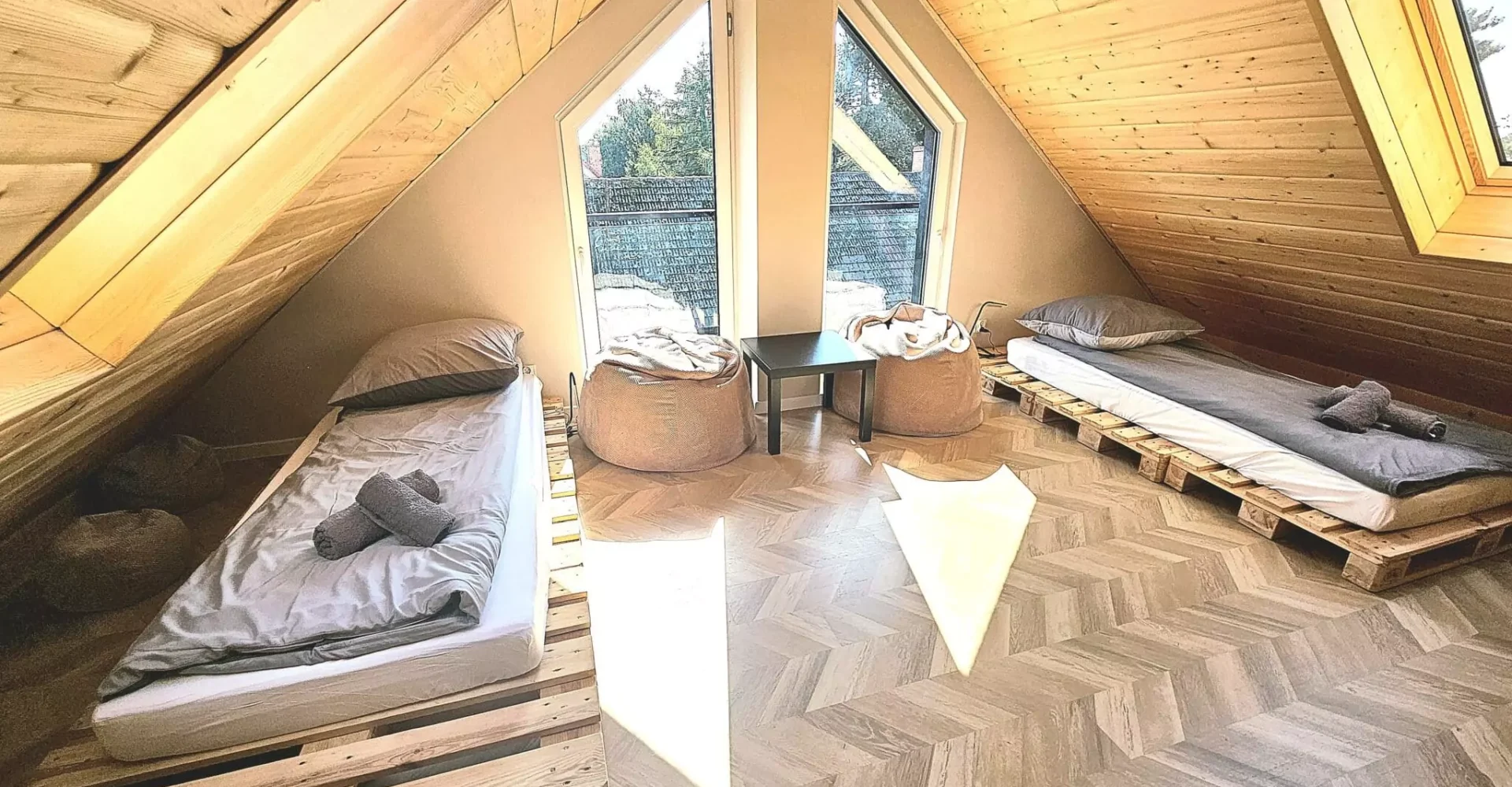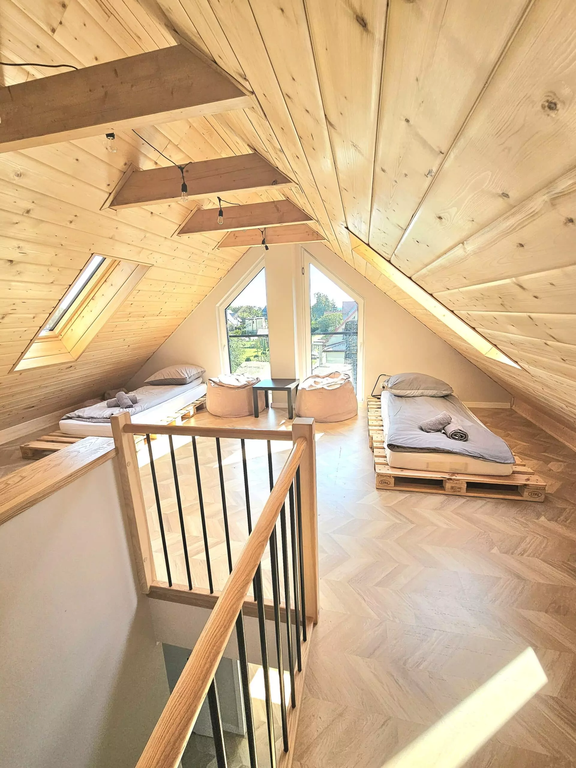Druhé patro (podkroví) – mládežnický pokoj 2 postele z europalet 90 cm x 200 cm