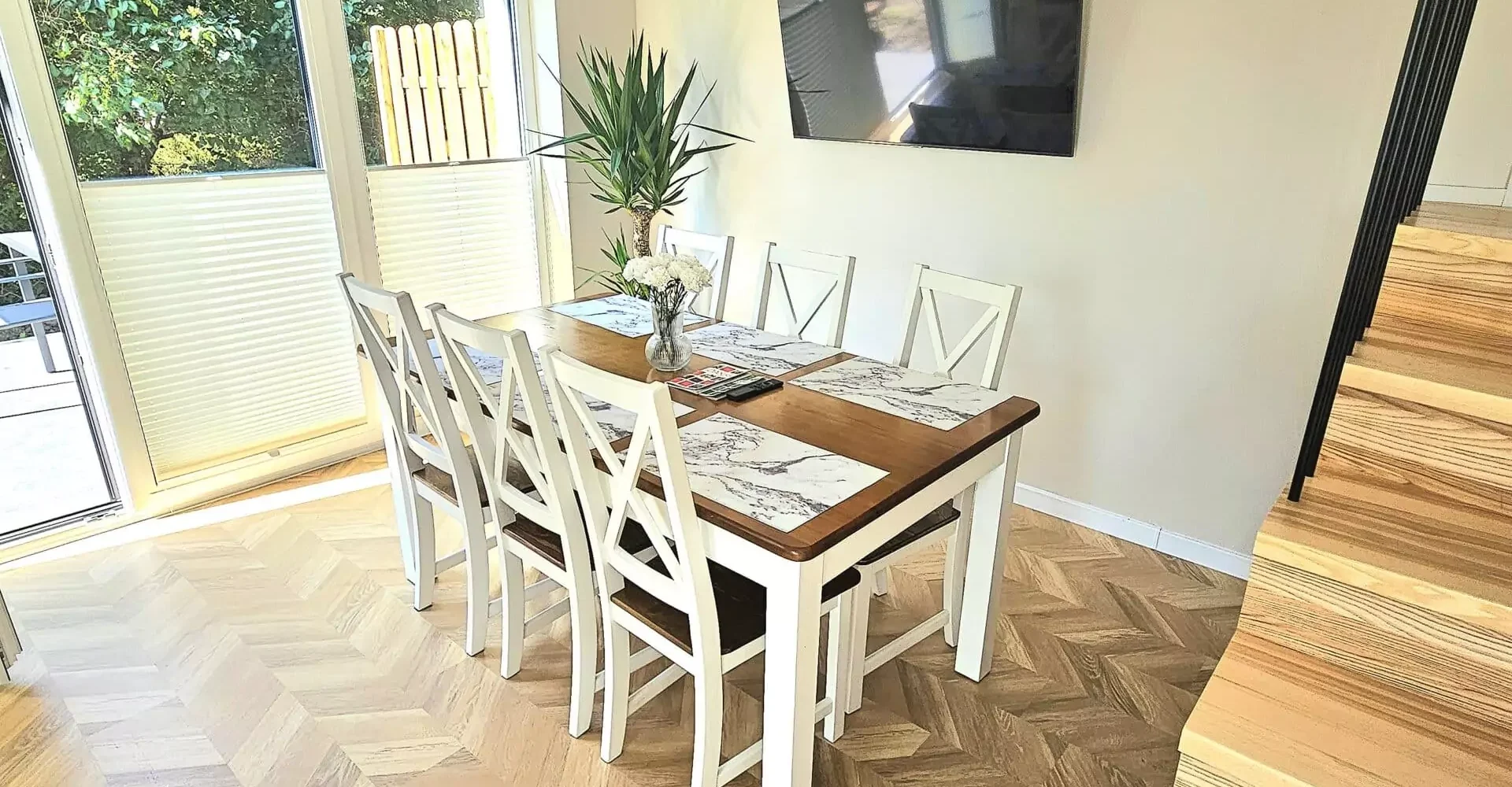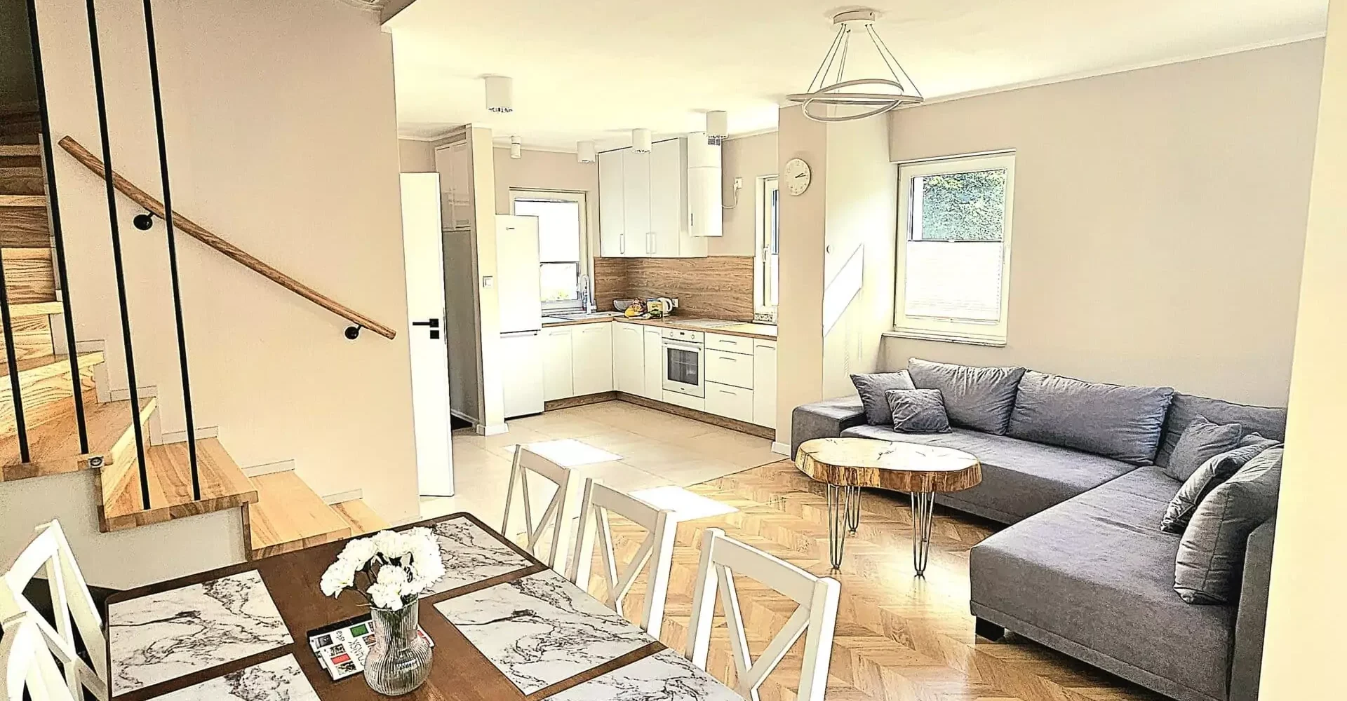 Přízemí – obývací pokoj s kuchyňským koutem, koupelna, jídelna, velká skříň a východ na terasu s místem pro grilování